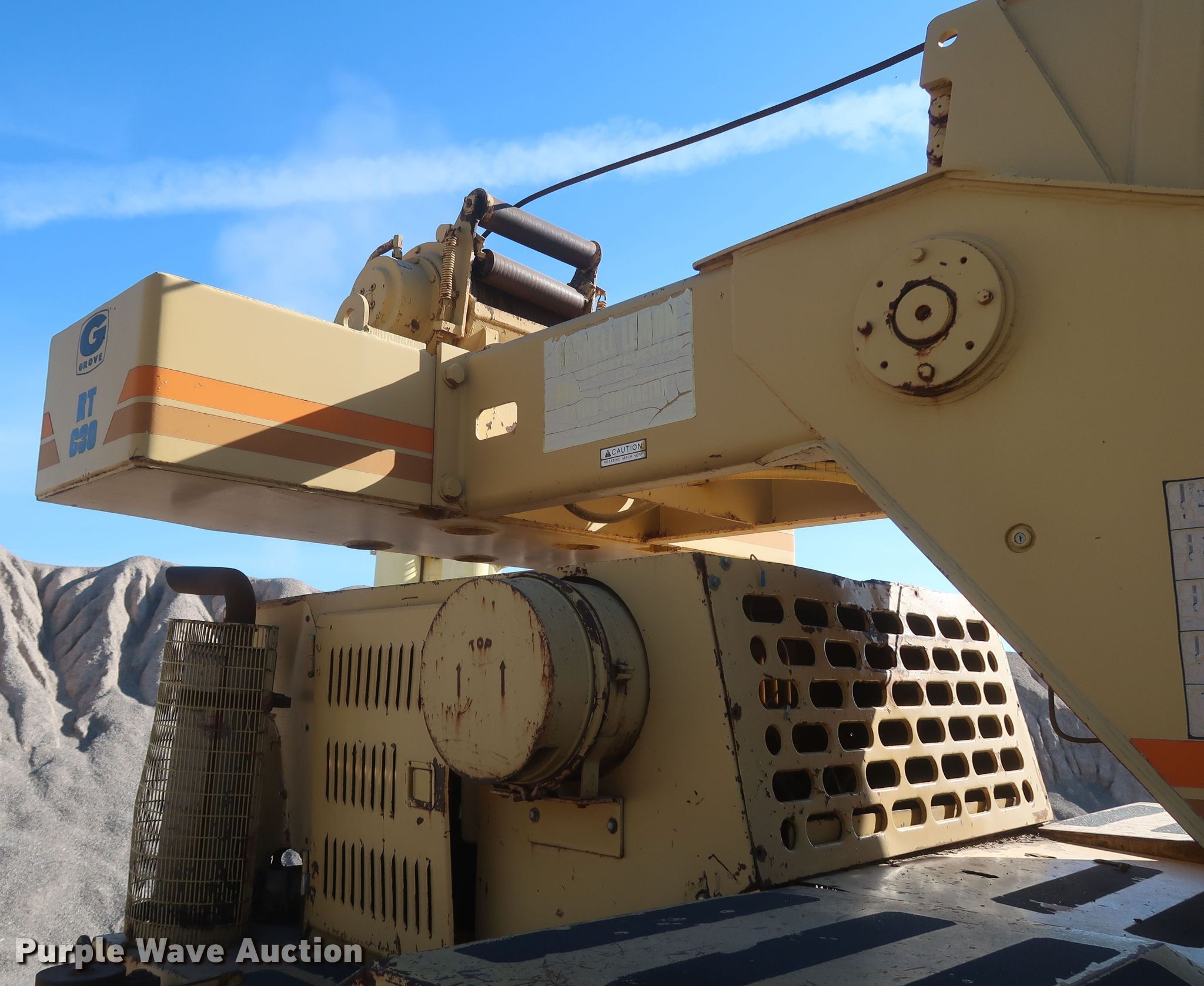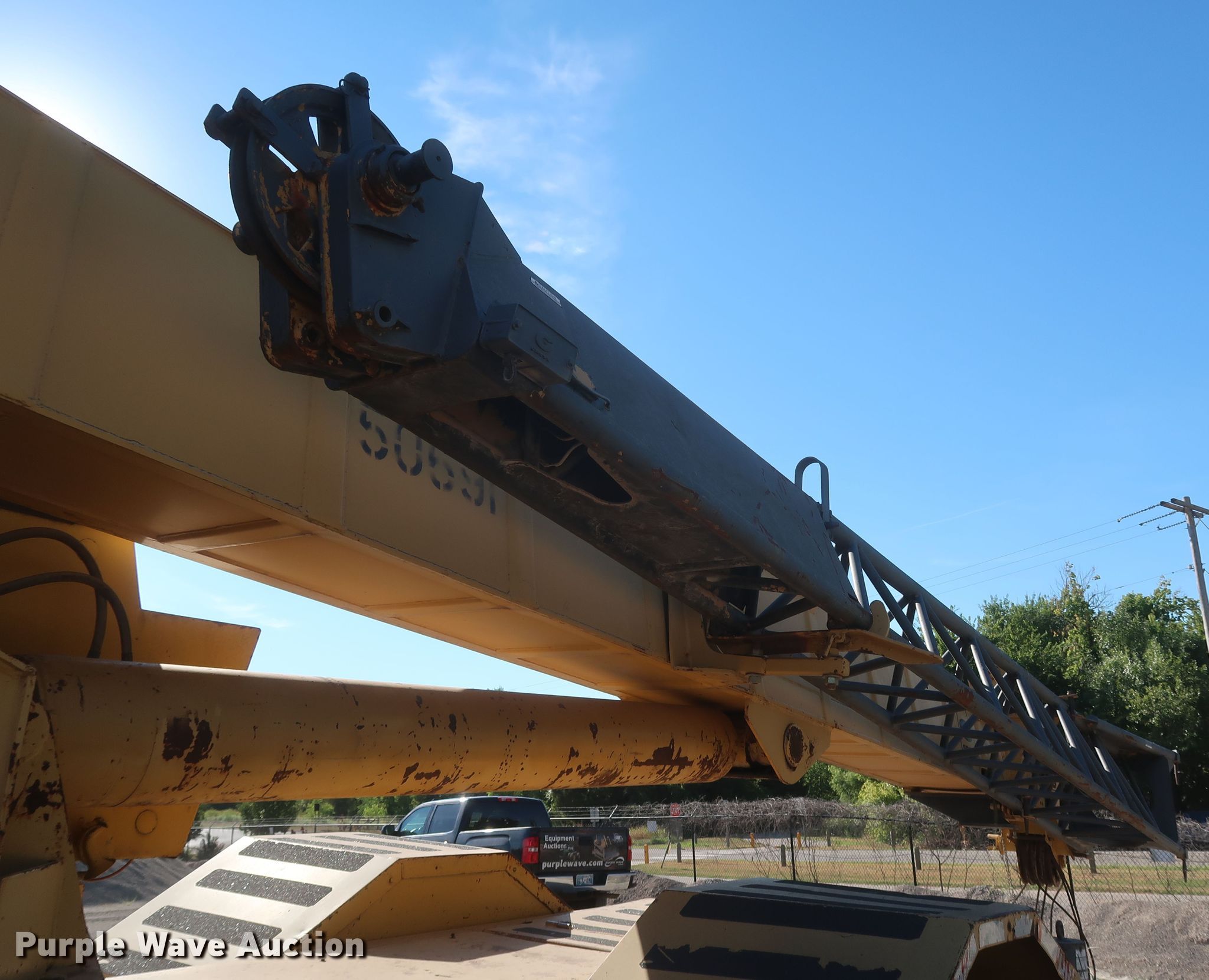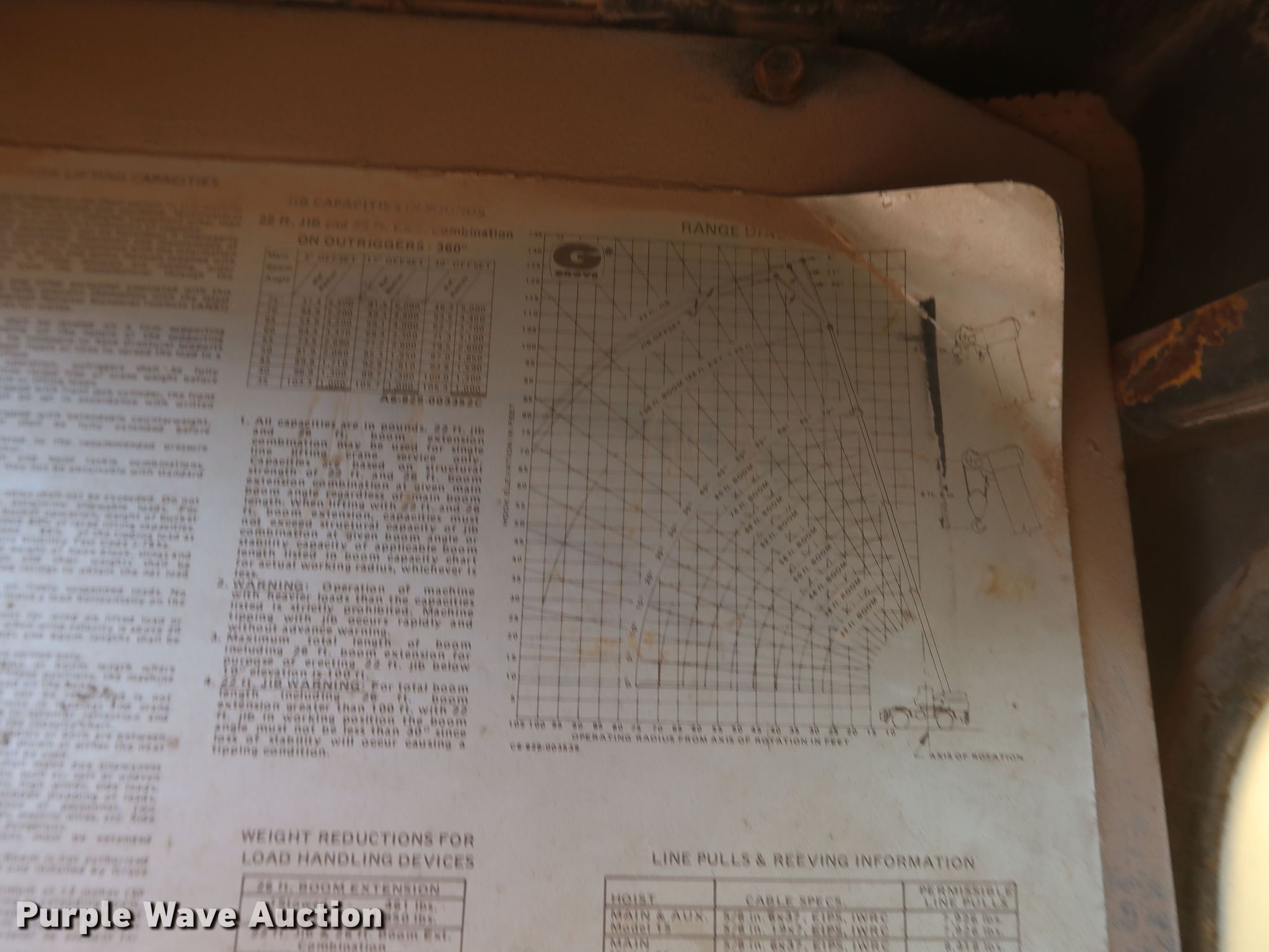 1982 Grove RT630 crane. Hours: 332 on meter, Serial: 50691, Unit #: 10-8. Engine Caterpillar 3208, Serial: 51Z71447, Cylinders: 8, Fuel type: Diesel, HP: 210. Transmission Direct-drive, 3F - 3R. Chassis Axles: Single, Suspension: Spring, Brakes: Hydraulic. Operators station OROPS, Crane controls: Stick. Features Boom Telescopic, Boom length: 80', Sections: 3, Maximum lift capacity: 60,000 lbs, Maximum lift height: 106', Jib: 26', Stabilizers: 4, Boom controls In-cab, Winches: 1, Crane block Sheaves: 4, Capacity: 60,000 lbs, Lift chart. Tires Size: 23.5-25. Notes Non-operational unit. Haskell Lemon Construction Co.. 6401 Southwest 15th Street. Oklahoma City, OK 73128
