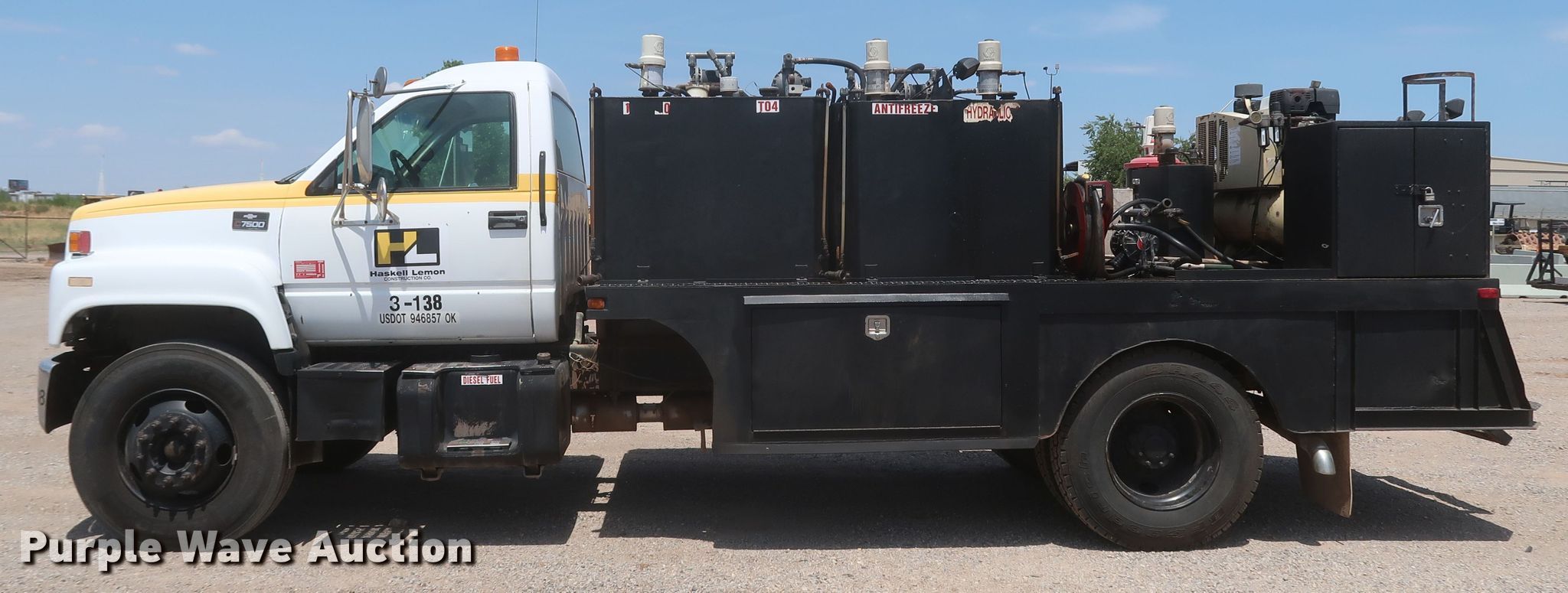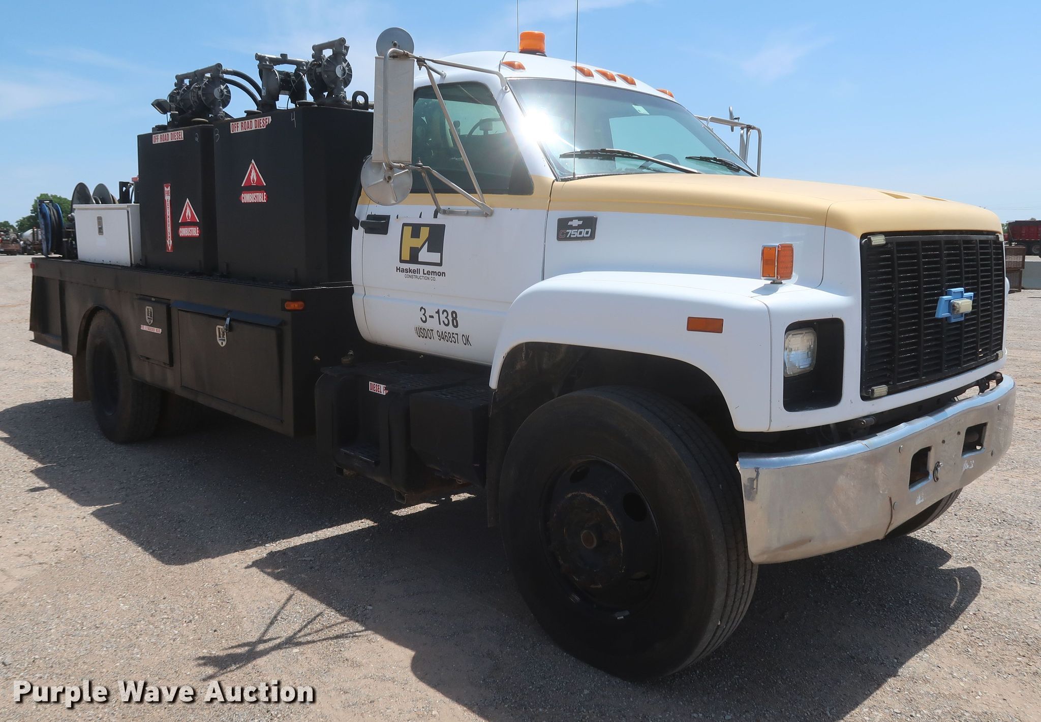 1998 Chevrolet C7500 fuel / lube truck. Miles: 430,696 on odometer, VIN: 1GBL7H1C3WJ110676, Unit #: 3-138. Engine Caterpillar 3126, Displacement: 7.2L, Cylinders: 6, Fuel type: Diesel. Transmission Manual, Speed: 6. Chassis Axles: Single, Suspension: Spring, Brakes: Hydraulic. Interior AC, Heat. Features Bed 15' L x 96" W, Air compressor, Oil/lube system Hose reels, Nozzles, Pump, Reservoirs Grease, Fuel tank Nozzles, Pump.. Tires Size: 11R22.5. Oklahoma classic title. Title distribution may be delayed up to 30 days from verification of funds. Haskell Lemon Construction Co.. 3800 Southwest 10th Street. Oklahoma City, OK 73108
