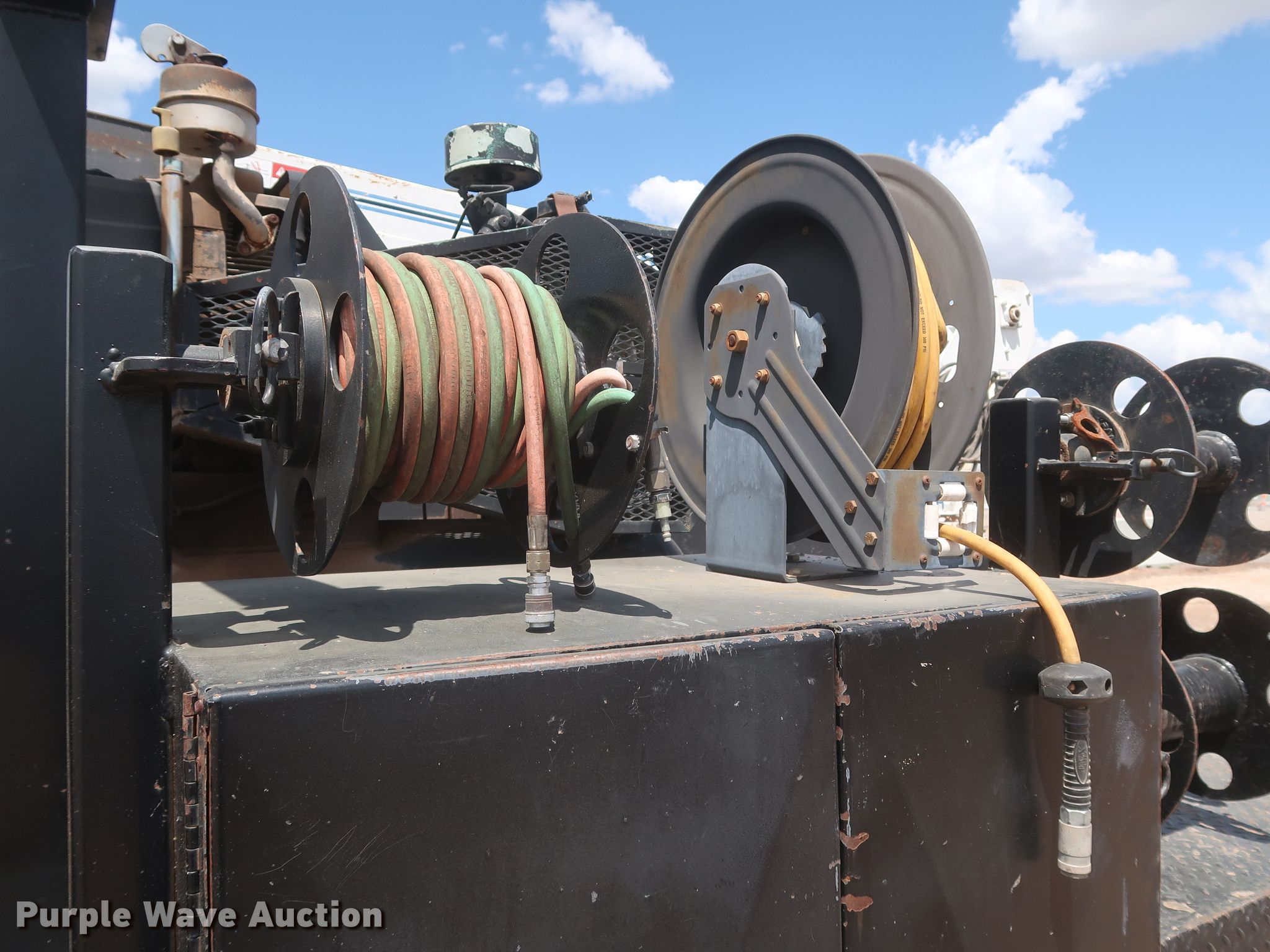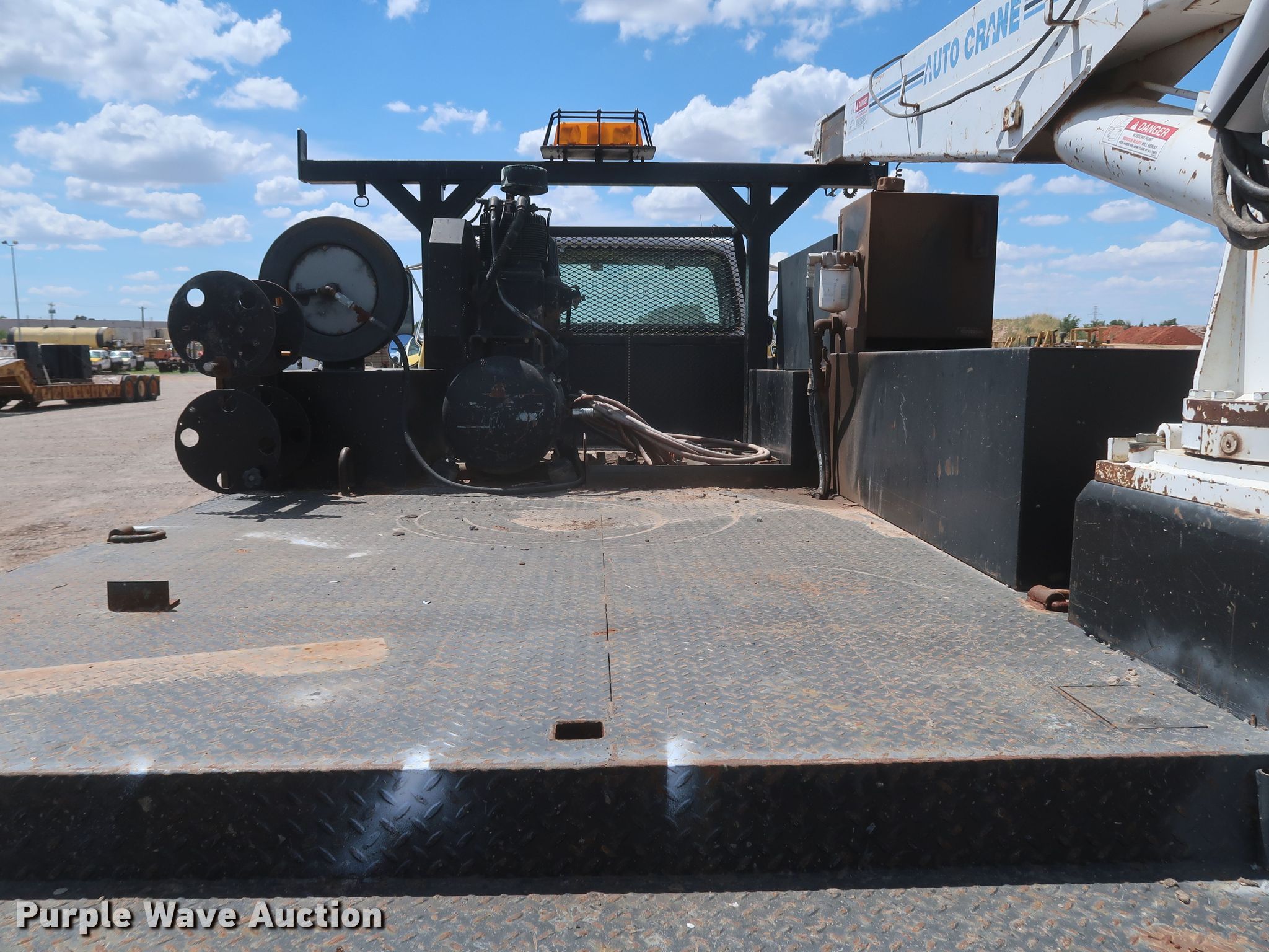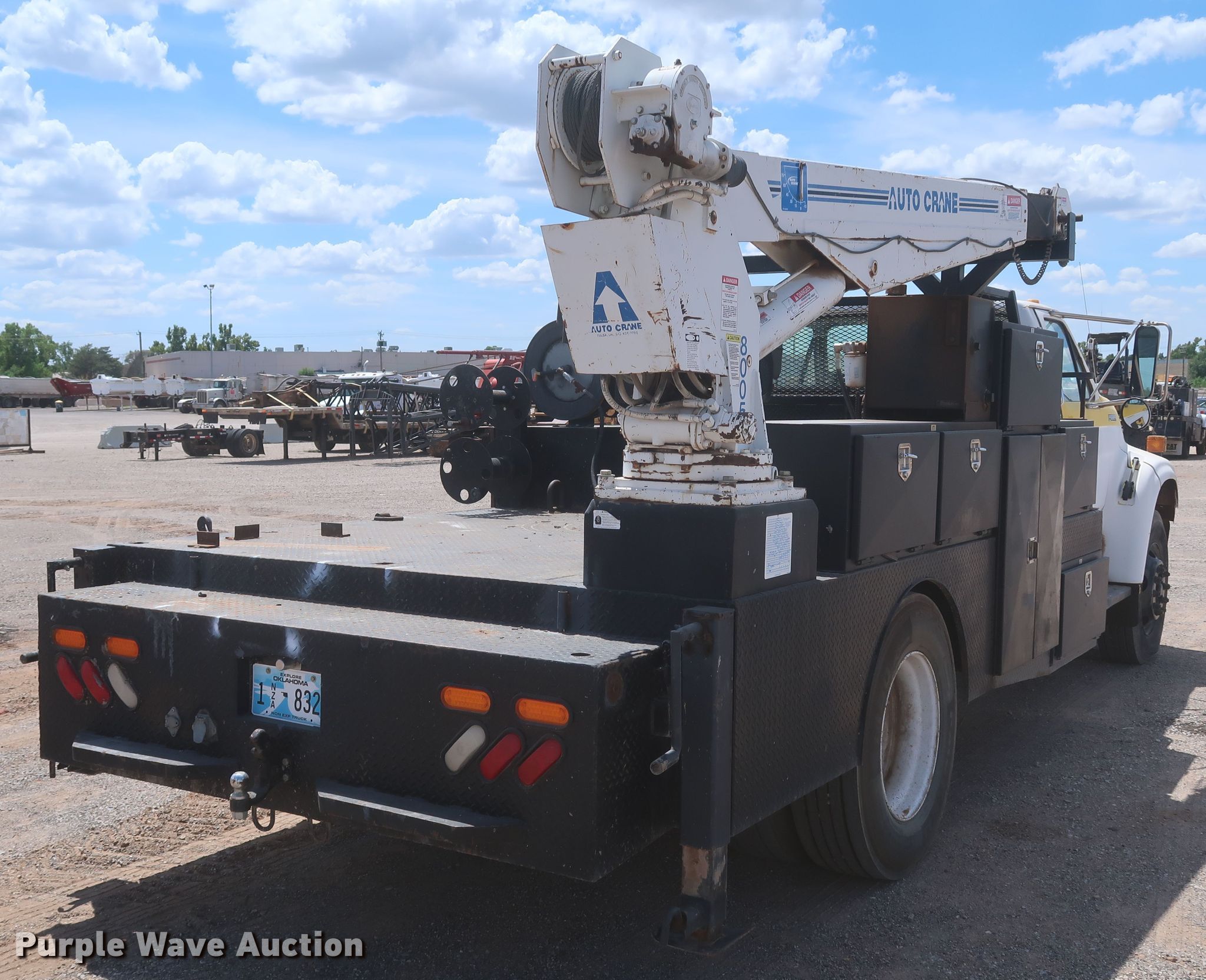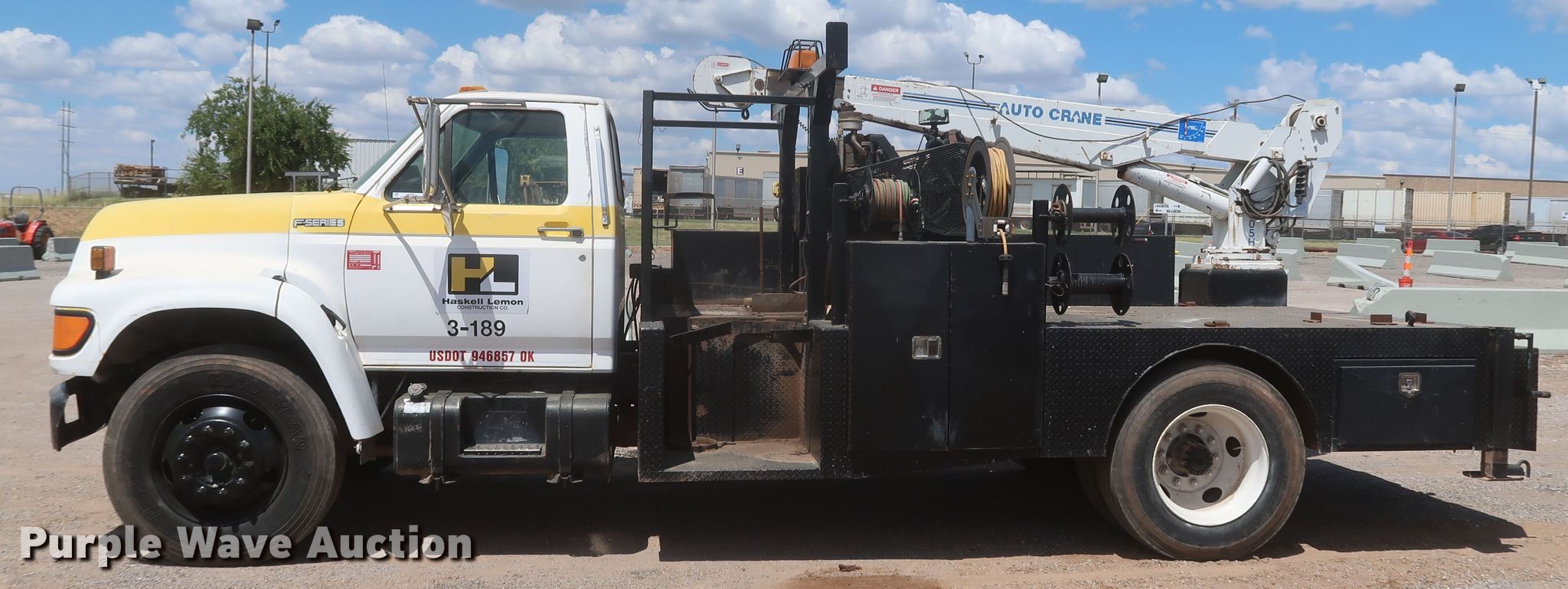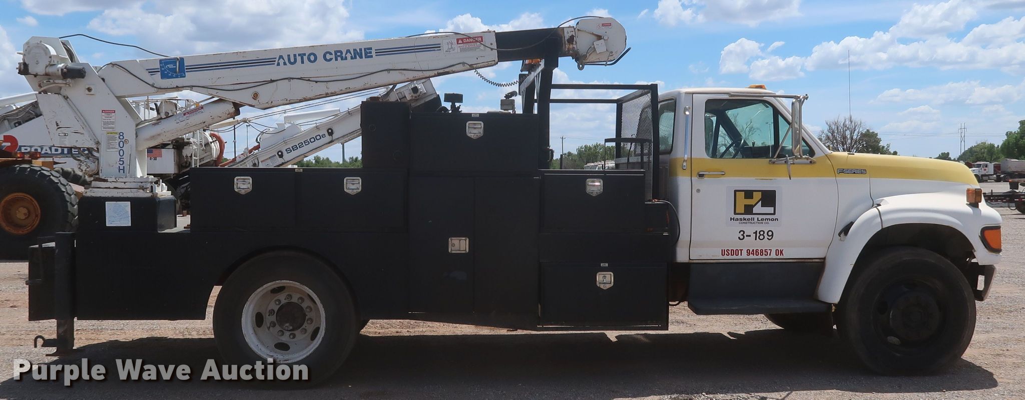 1998 Ford F700 utility / service truck. Miles: 140,573 on odometer, VIN: 1FDNF70J6WVA02431, Unit #: 3-189. Engine Displacement: 7.0L, Cylinders: 8, Fuel type: Gas. Transmission Automatic. Chassis Axles: Single, Suspension: Spring, Brakes: Hydraulic, PTO. Interior AC, Heat, Brake controller. Features Bed 15' L x 102" W, Air compressor Kohler Command Pro, Crane Auto Crane 8005H, Boom length: 12', Maximum lift capacity: 8,000 lbs. Tires Size: 295/75R22.5. Oklahoma classic title. Title distribution may be delayed up to 30 days from verification of funds. Haskell Lemon Construction Co.. 3800 Southwest 10th Street. Oklahoma City, OK 73108