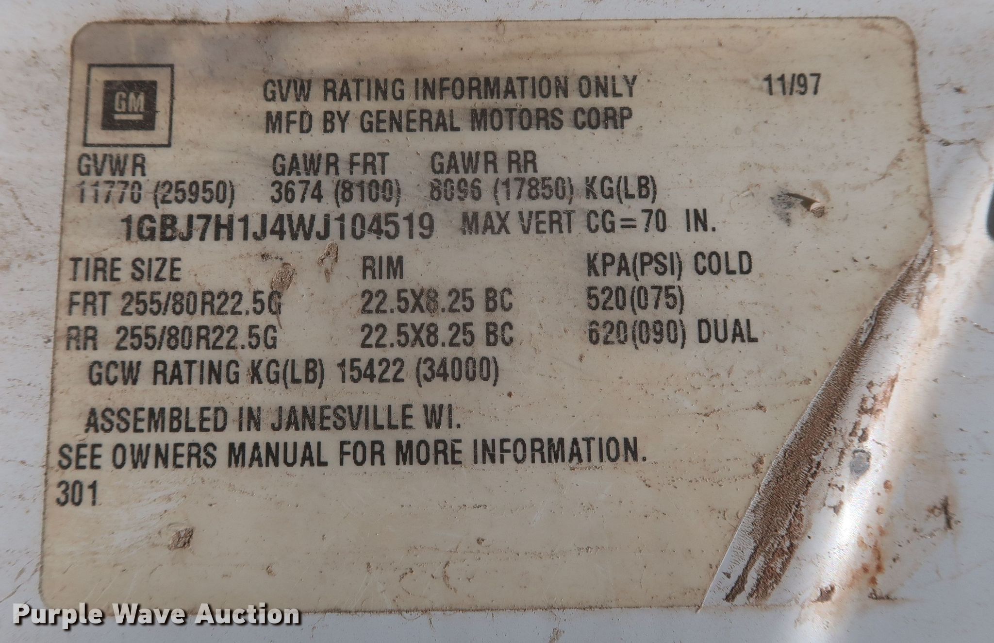 Purple Wave is selling a used Service Truck in Oklahoma. This item is a 1998 Chevrolet C7500 utility / service truck with the following: Miles: 231,736 on odometer, VIN: 1GBJ7H1J4WJ104519, Unit #: 3-135