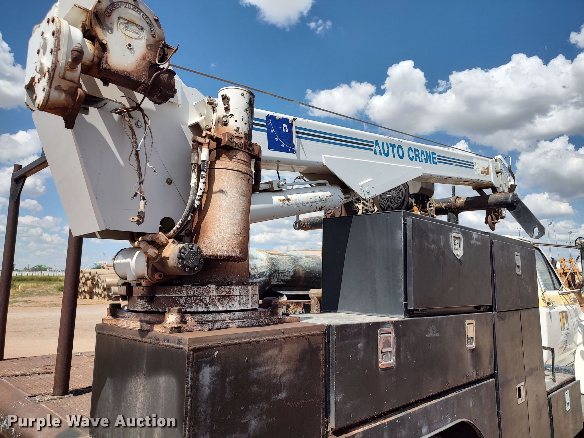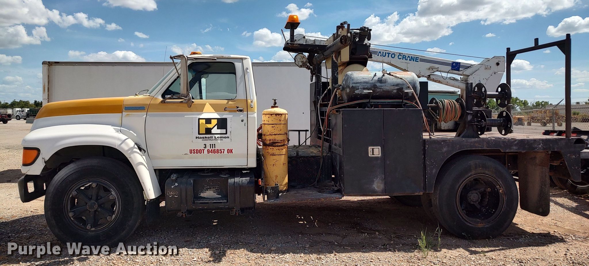 1995 Ford F700 utility / service truck. Miles: 118,755 on odometer, VIN: 1FDNF70J8SVA65234, Unit #: 3-111. Engine Displacement: 7.0L, Cylinders: 8, Fuel type: Diesel. Transmission Manual, Speed: 5, plus 2. Chassis Suspension: Spring, Brakes: Hydraulic. Interior AC, Heat. Features Bed 13' L x 94" W, Torch bottle rack, Air compressor Ingersoll Rand, Kohler Command Pro, Crane Auto Crane 5005EH, Boom length: 11'. Tires Size: 9.00R20. Oklahoma classic title. Title distribution may be delayed up to 30 days from verification of funds. Haskell Lemon Construction Co.. 3800 Southwest 10th Street. Oklahoma City, OK 73108