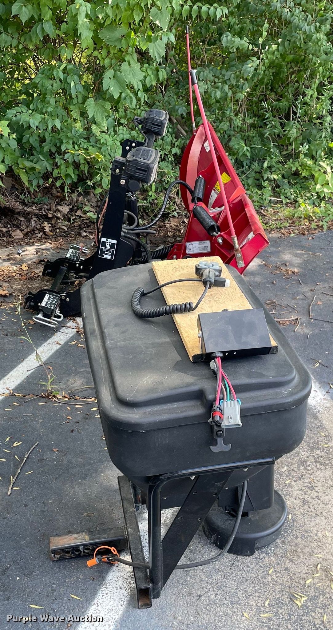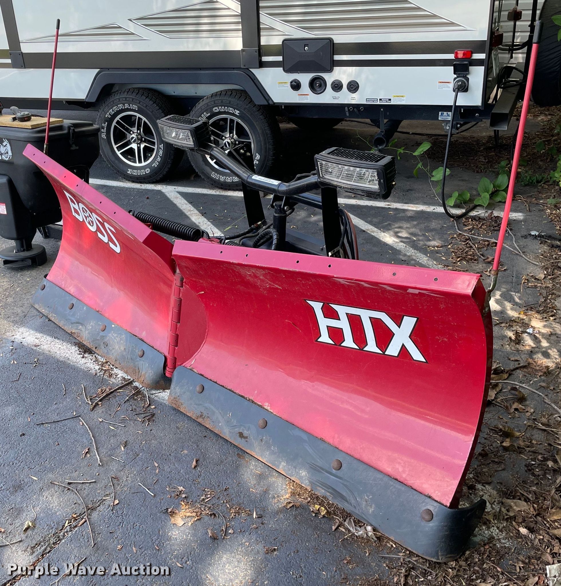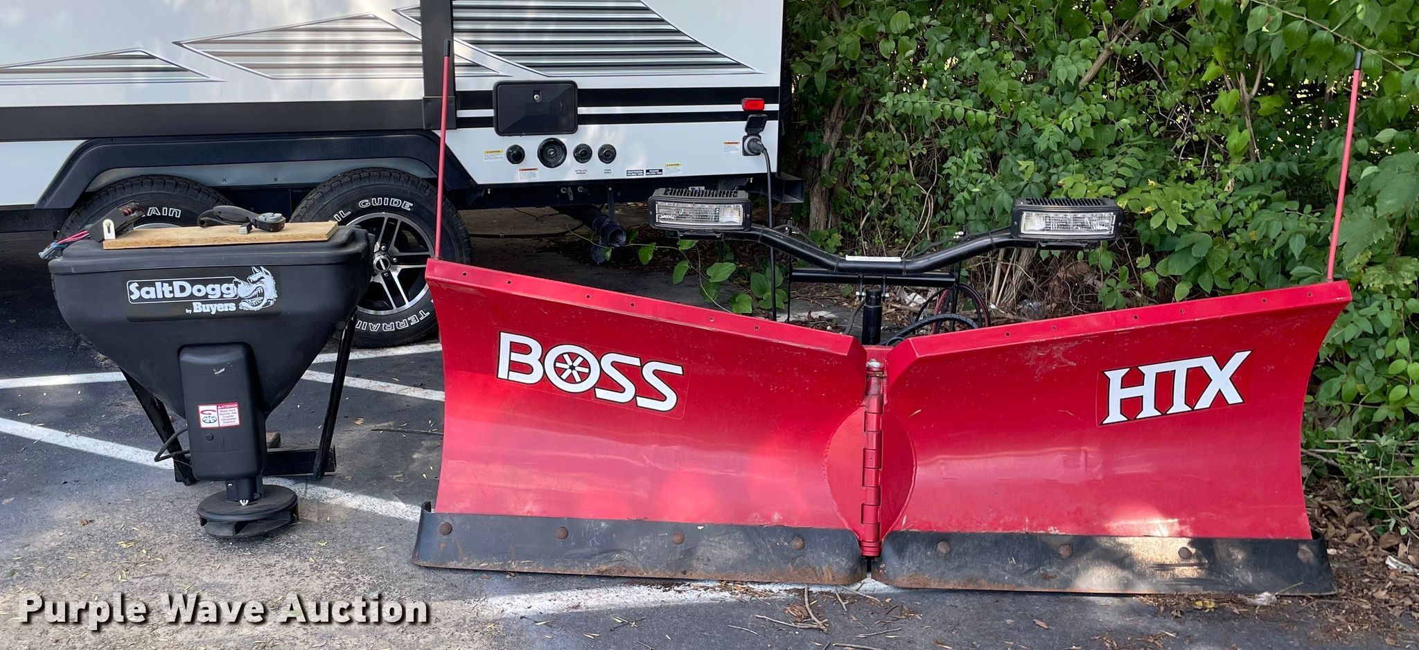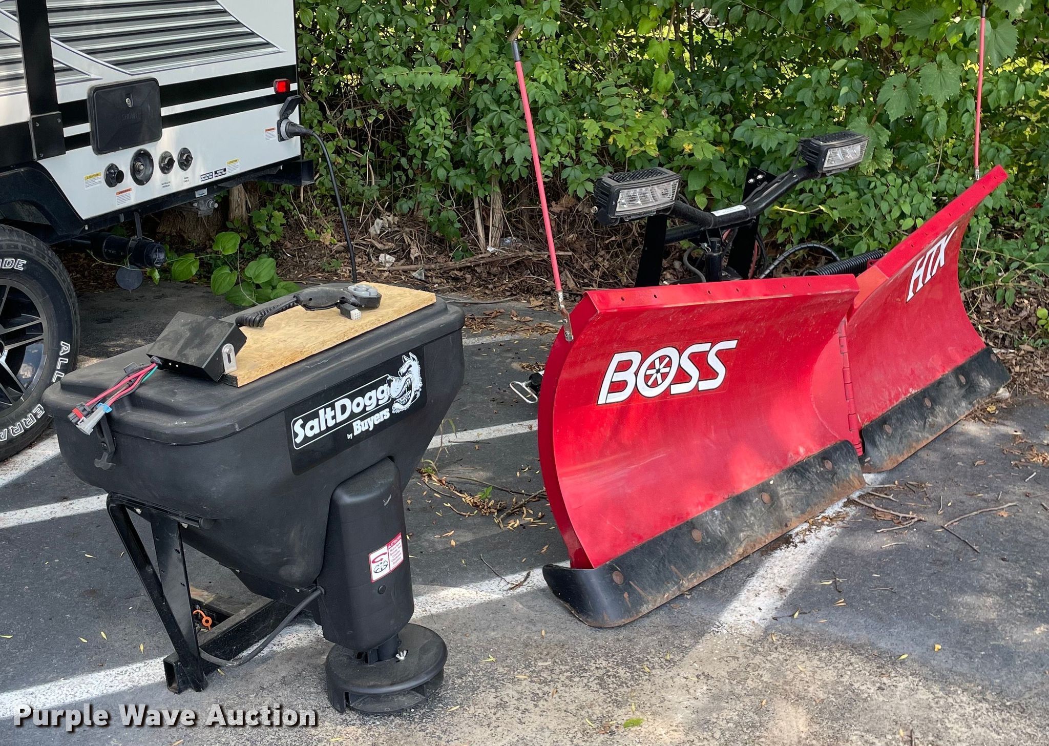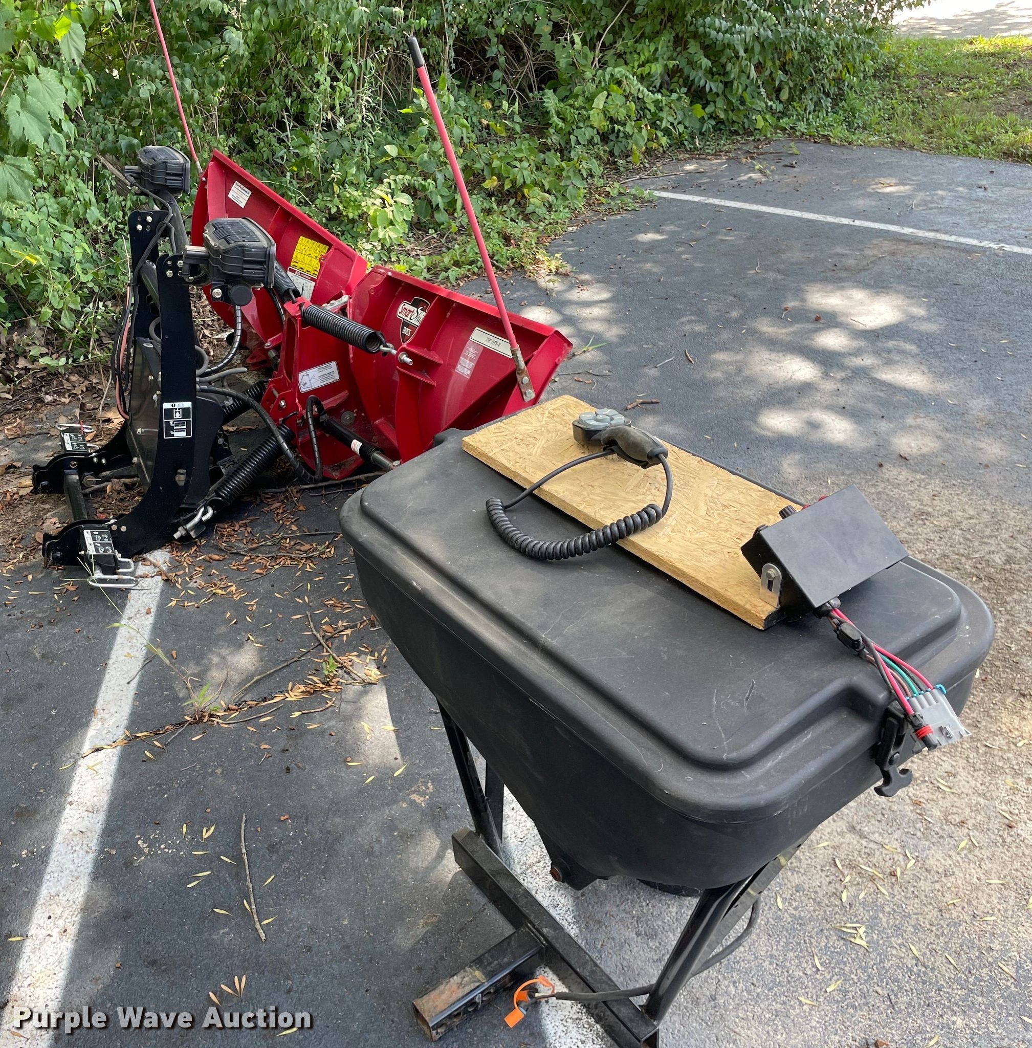 Automotive accessories. Boss HTX-V snow plow. 7'6" W, Removed from 2018 Chevrolet 1500, Controller, Serial: 401415290. Buyers Salt Dogg spreader Poly hopper, 12V, Receiver hitch mount, Controller. Yahl Contracting Inc. Valley Park, MO 63088