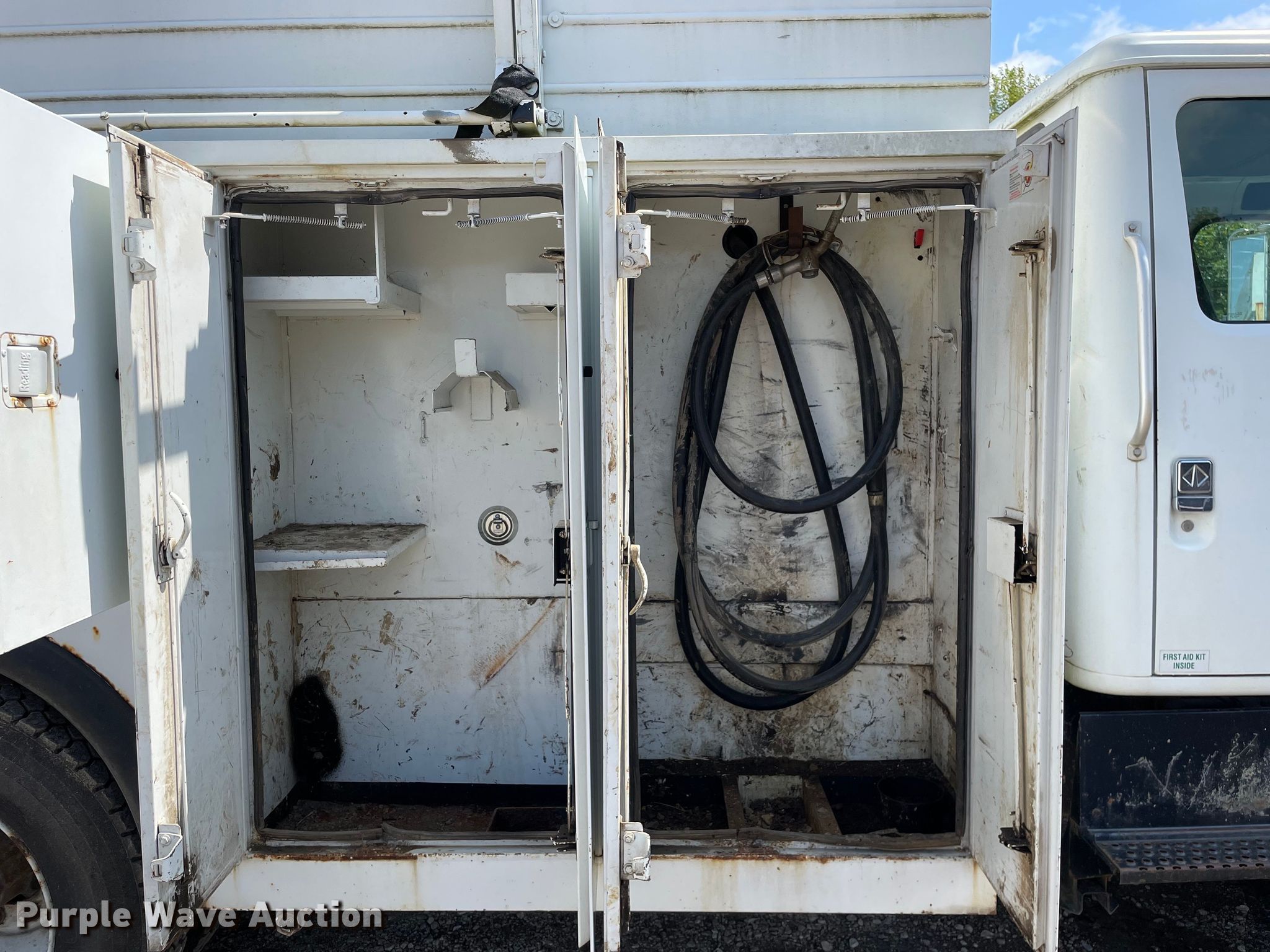 2000 International 4700 utility / service truck. Miles: 167,604 on odometer, Hours: 19,131 on meter, VIN: 1HTSLAANXYH245548. Engine International DT466E, Displacement: 7.6L, Cylinders: 6, Fuel type: Diesel. Transmission Automatic. Chassis Axles: Single, Suspension: Spring, Brakes: Air, PTO. Interior AC, Heat, Cruise control, Brake controller. Features Bed Reading PB74HD1503/4, 12' 7" L x 93" W, Oil/lube system Fuel tank Nozzles, Pump.. Tires Size: 10R22.5. Illinois title. Petersburg Plumbing and Excavating. 3550 Great Northern Avenue. Springfield, IL 62711