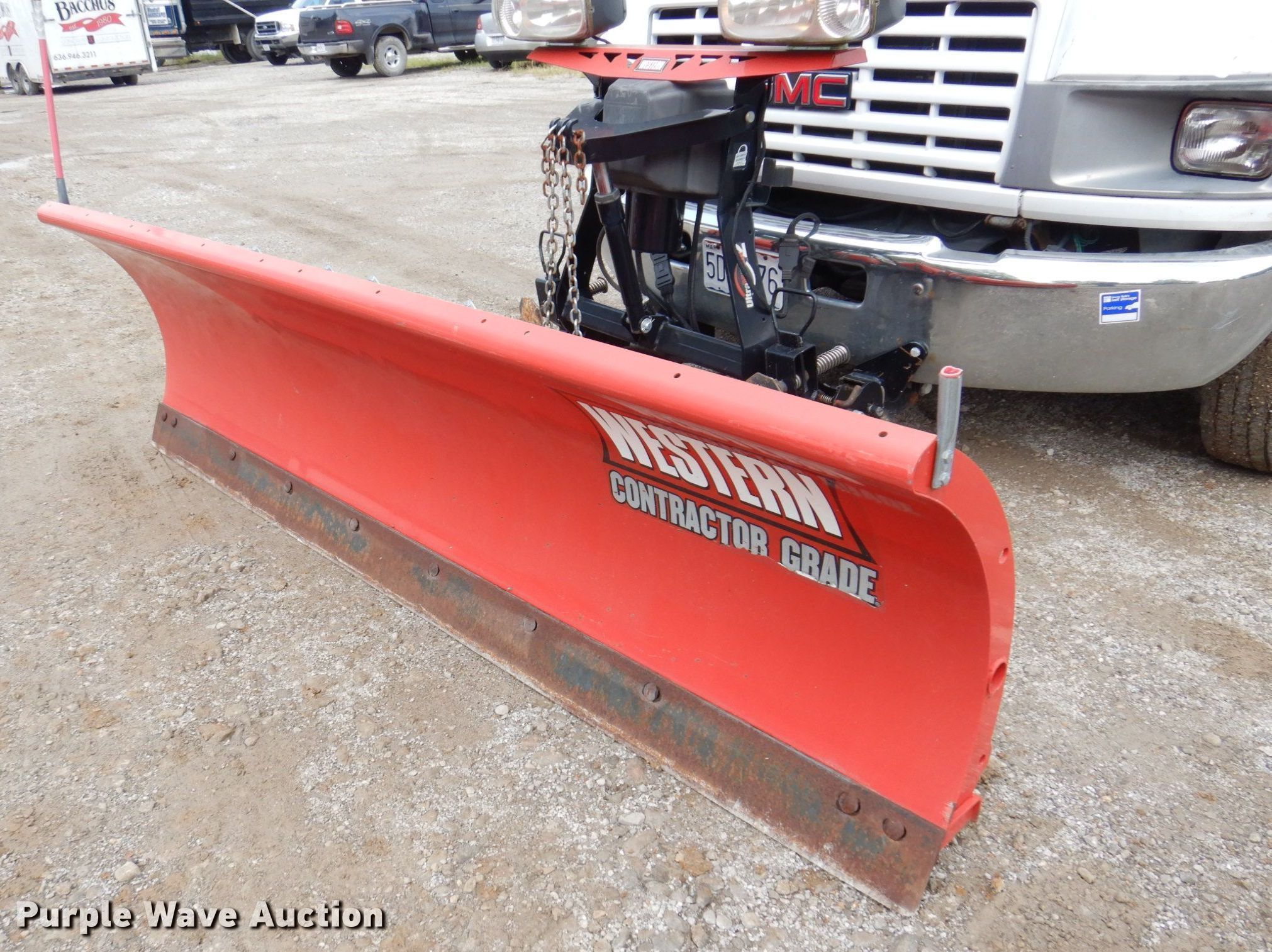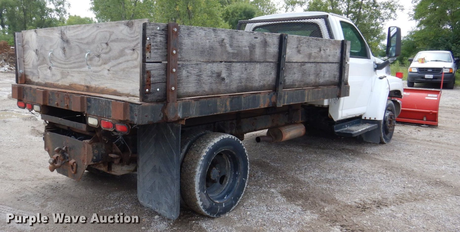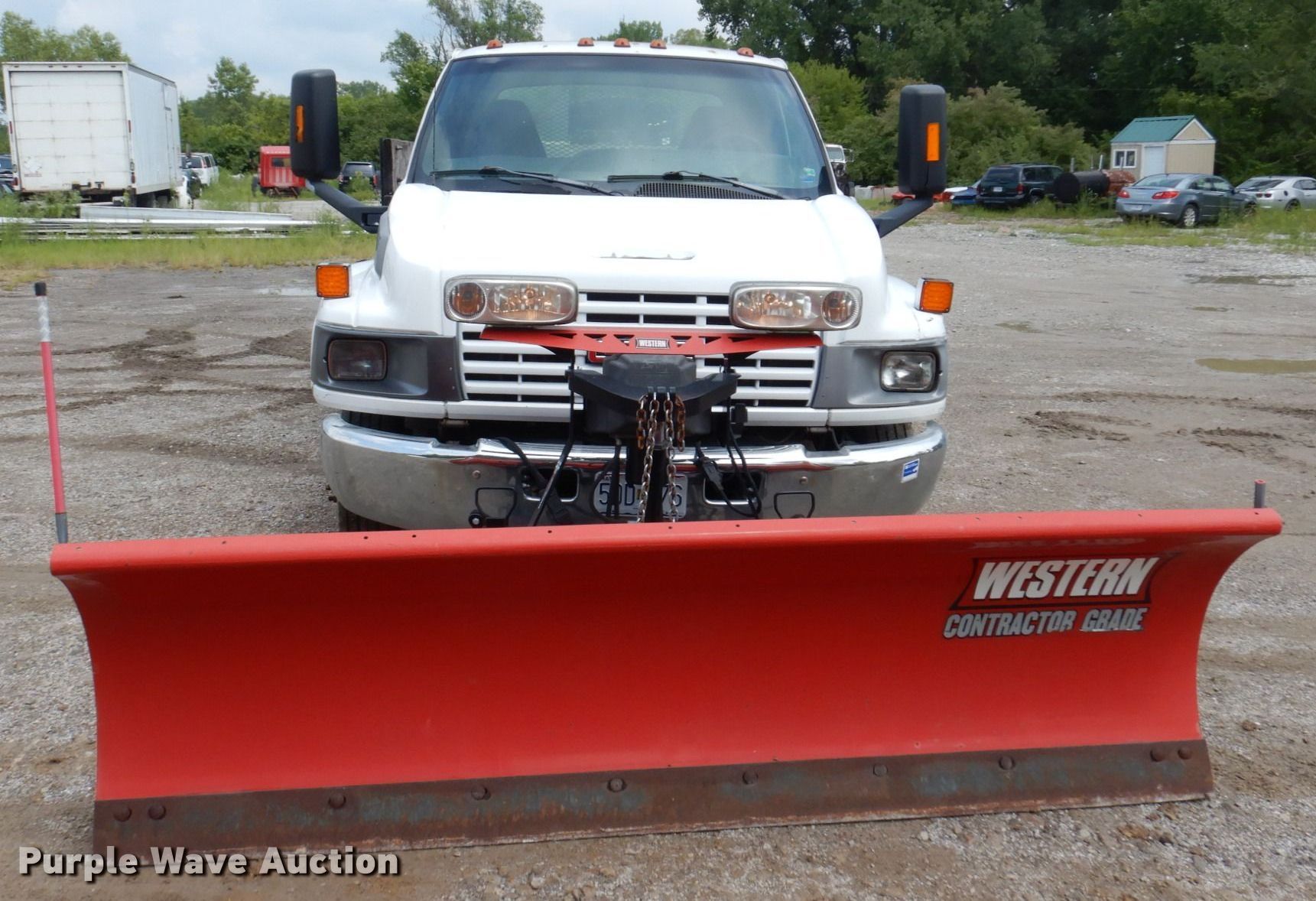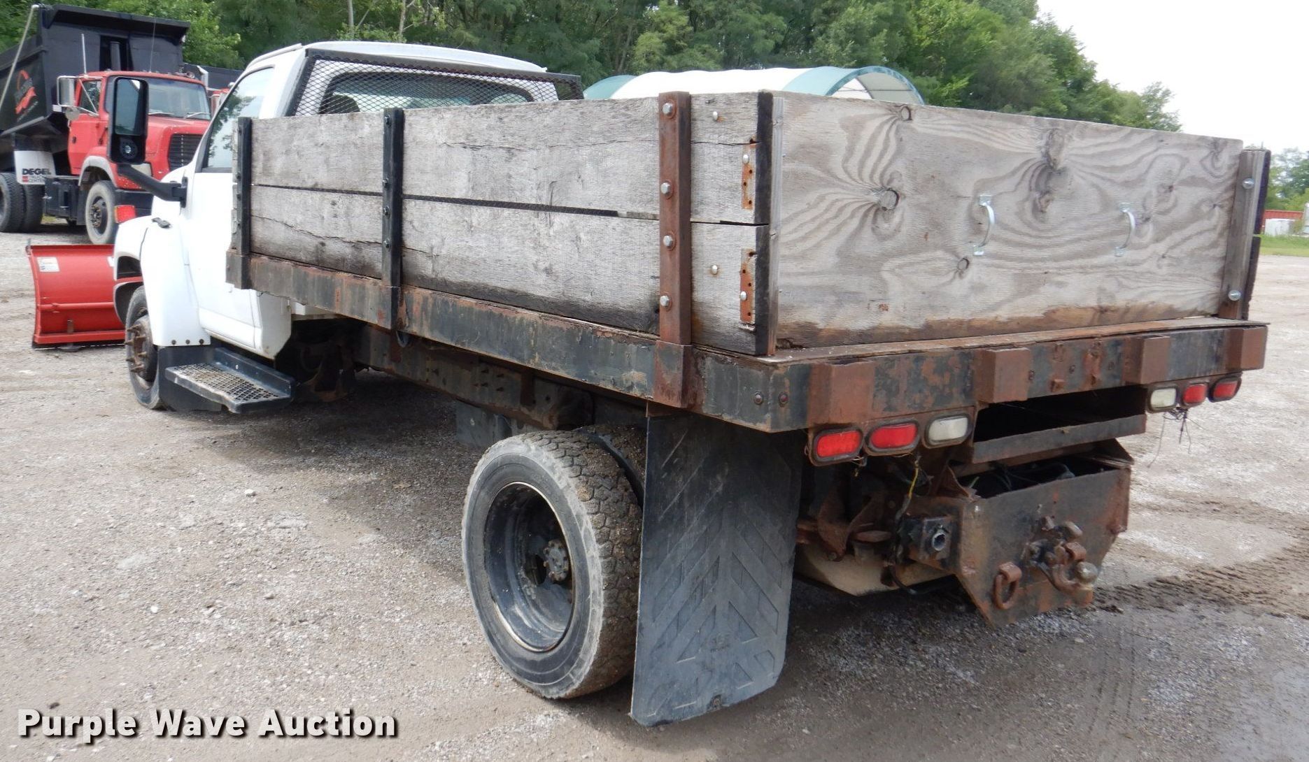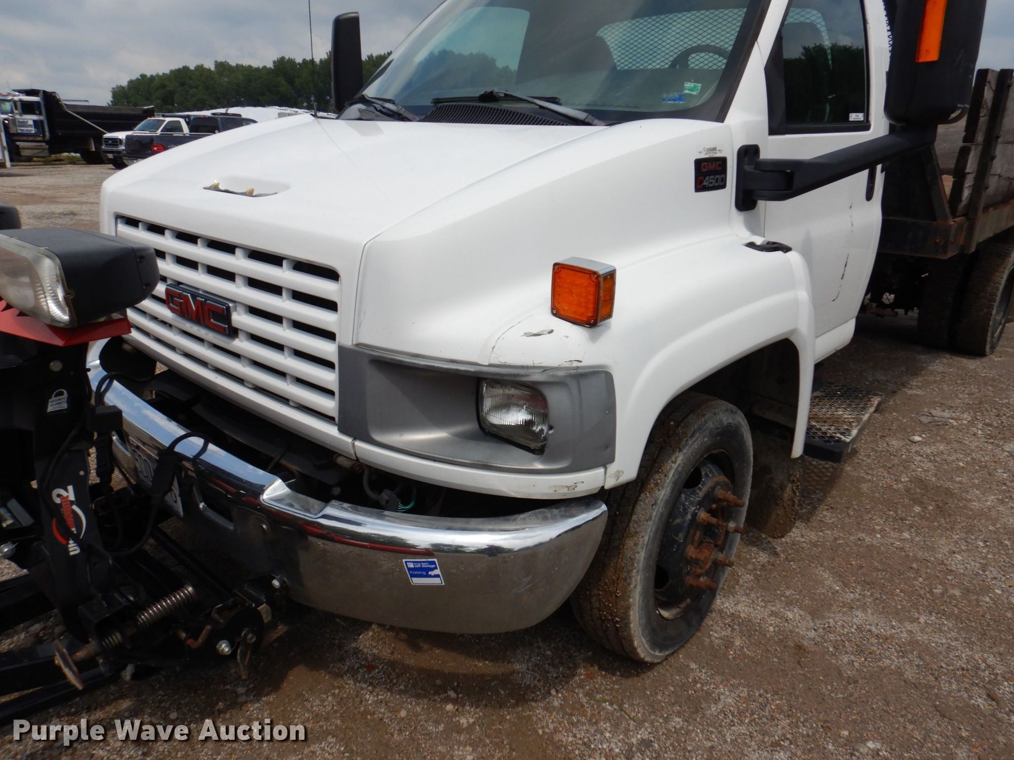 2003 GMC C4500 dump flatbed truck. Miles: 176,377 on odometer, VIN: 1GDC4E1E33F501423. Engine Displacement: 8.1L, Cylinders: 8, Fuel type: Gas. Transmission Automatic. Chassis Axles: Single, Suspension: Spring, Brakes: Hydraulic, GVWR: 16,000 lbs. Interior AC, Heat, Cruise control, Brake controller. Features Dump flatbed 12' L x 8' W, Removable sides, Ram: Single, Plow Western Proplus Ultrafinish, Width: 108". Tires Size: 225/70R19.5. Notes Dash warning indicator: Check engine, ABS, Air bag, Brake, Unit must be towed or hauled, Non-operational brakes. Missouri title. Bacchus Concrete and Construction. Saint Charles, MO 63304