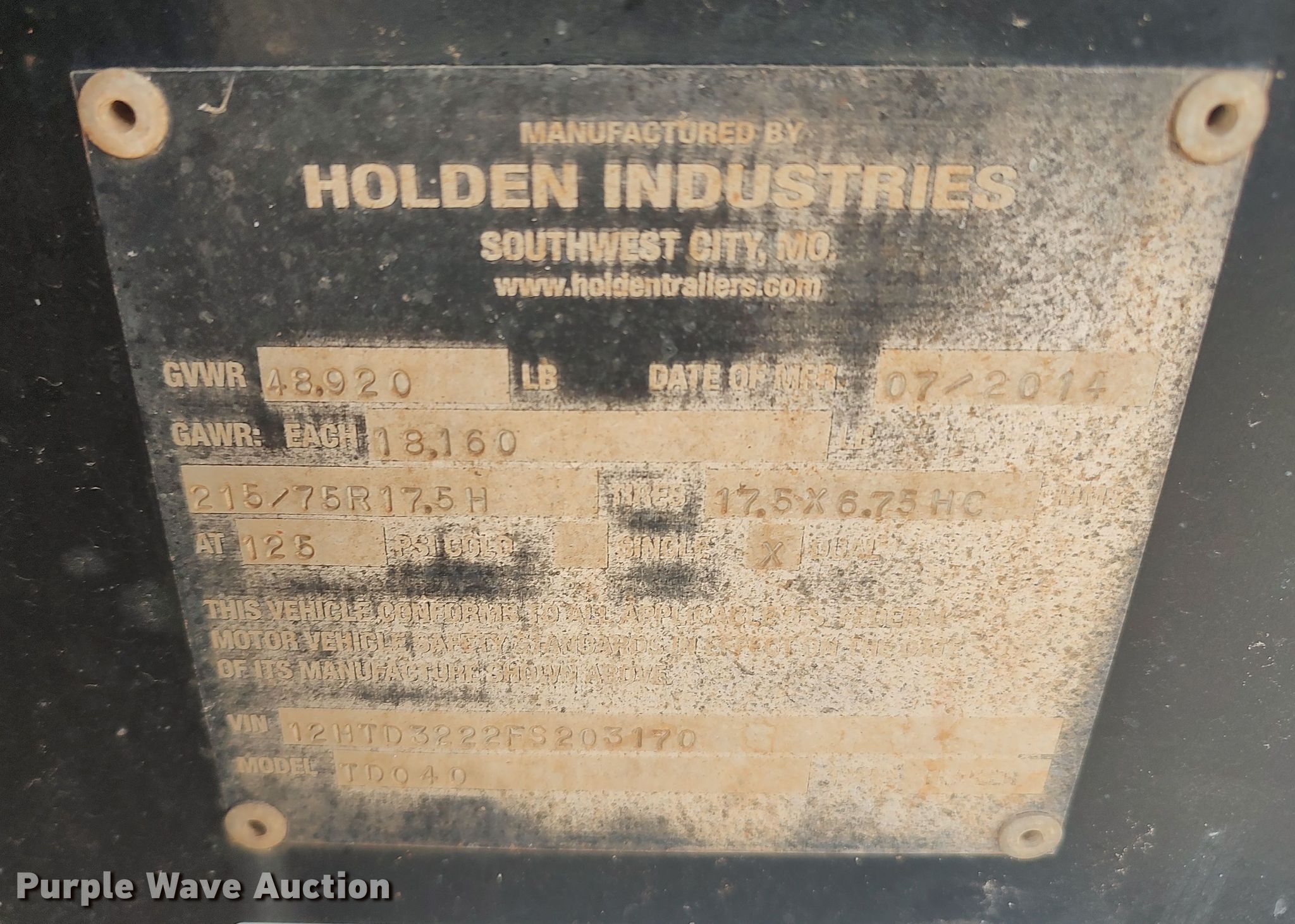 Purple Wave is selling a used Equip. Trailer in Oklahoma. This item is a 2015 Holden TD040 equipment trailer with the following: VIN: 12HTD3222FS203170