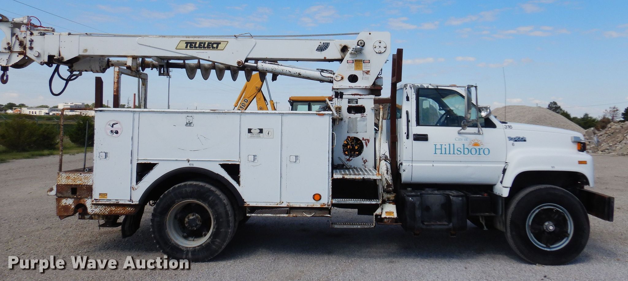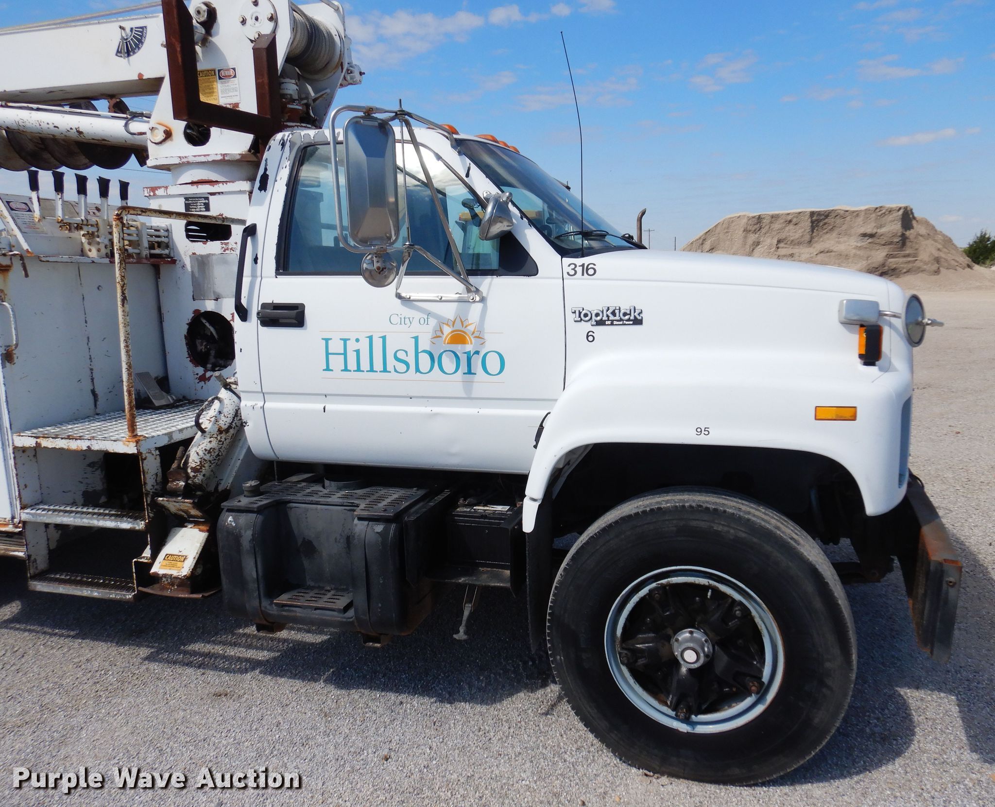 1991 GMC TopKick C6500 digger derrick truck. Miles: 71,878 on odometer, VIN: 1GDM7H1J6MJ508147. Engine Cylinders: 6, Fuel type: Diesel. Transmission Automatic. Chassis Axles: Single, Suspension: Spring, Brakes: Air. Interior Heat. Operational Bed 11' 4" L x 92" W, Boom Simon-Telelect Commander 4500, Serial: 1198-45DY, Maximum lift capacity: 21,600 lbs, Maximum lift height: 4,500', Boom controls Ground, Pole guide, Auger Diameter: 16".. Tires Size: 11R22.5. Notes Partial barrel of Mobile DTE11M hydraulic luid, No batteries, Hydraulic leaks. Kansas title. Mileage has not been verified. Exempt will be written in the odometer disclosure on the title. City of Hillsboro. Hillsboro, KS 67063