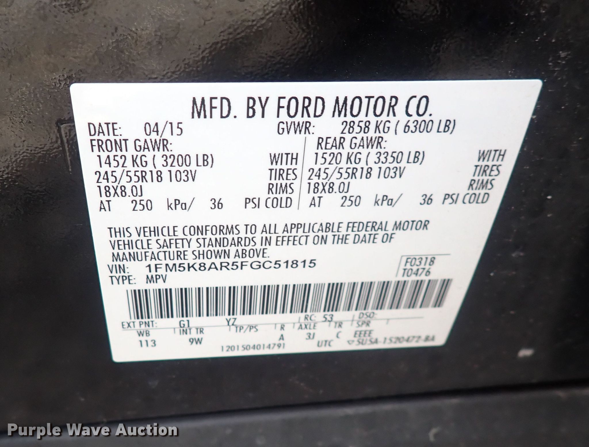 2015 Ford Explorer Police Interceptor SUV. Miles: 121,366 on odometer, VIN: 1FM5K8AR5FGC51815. Engine Displacement: 3.7L V6 DOHC, Cylinders: 6, Fuel type: Gas. Transmission Automatic, All wheel drive. Interior AC, Heat, Power windows, Power locks, Cruise control. Tires Size: 245/55R16. Notes Contents included, Dead battery. Kansas title. City of Derby. 3531 East 55th Street South. Derby, KS 67037