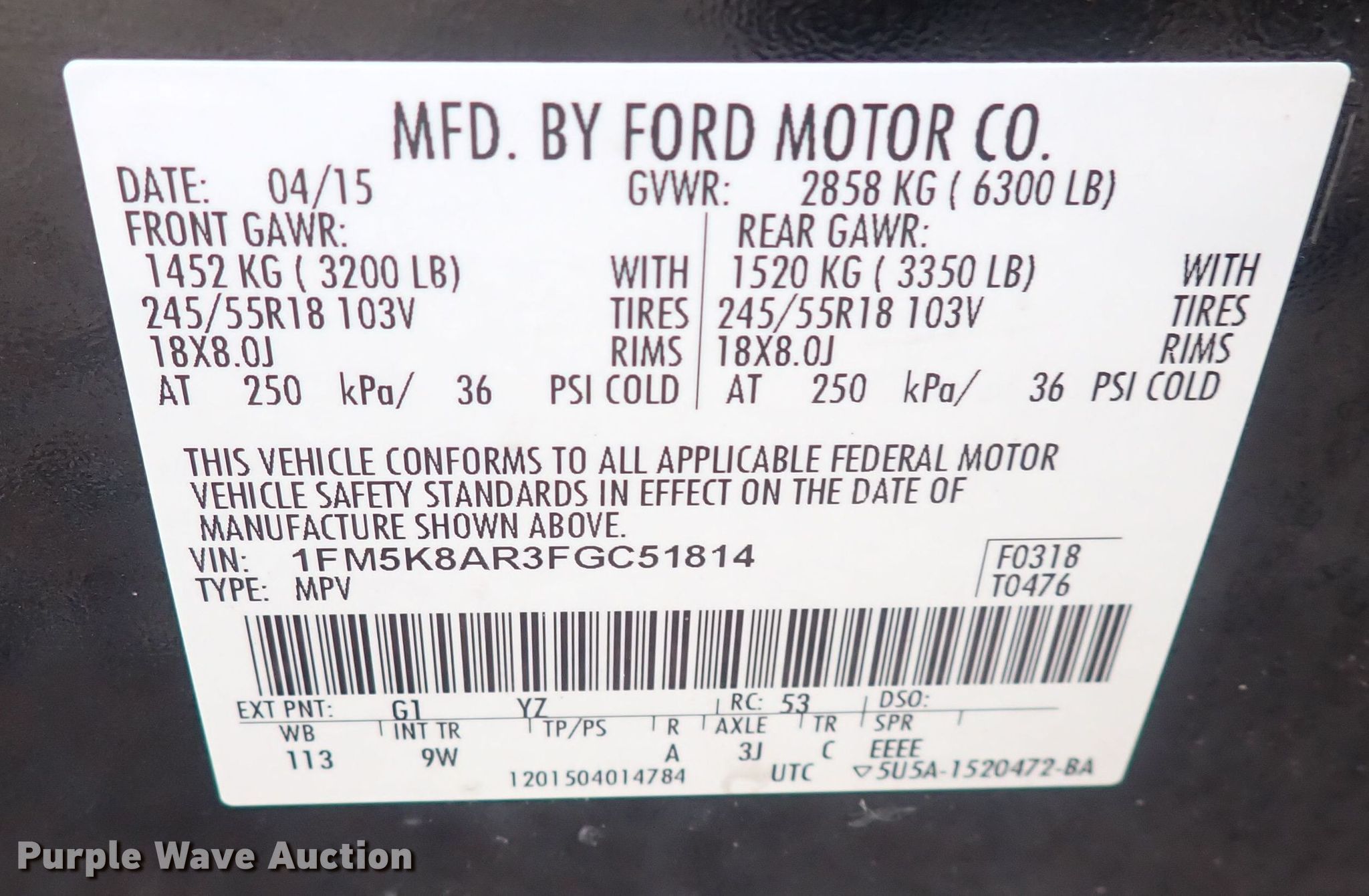 2015 Ford Explorer Police Interceptor SUV. Miles: 125,907 on odometer, VIN: 1FM5K8AR3FGC51814. Engine Displacement: 3.7L V6 DOHC, Cylinders: 6, Fuel type: Gas. Transmission Automatic, All wheel drive. Interior AC, Heat, Seat: Power driver, Power windows, Power locks, Cruise control. Tires Size: 245/55R18. Notes Contents included, Dead battery. Kansas title. City of Derby. 3531 East 55th Street South. Derby, KS 67037