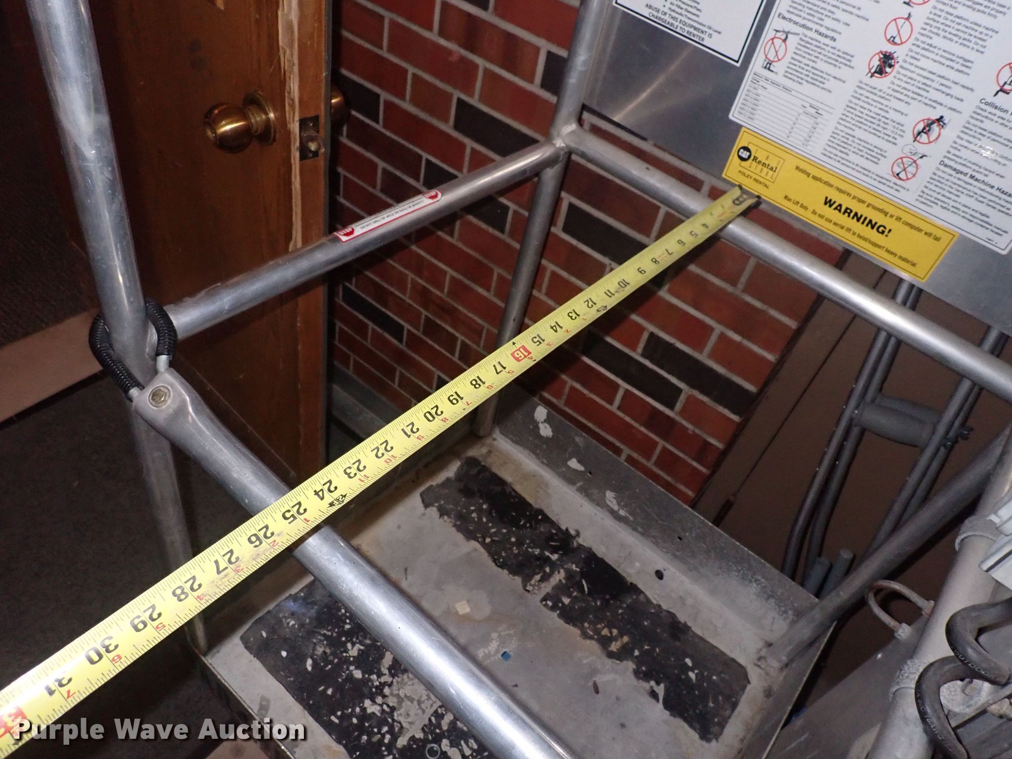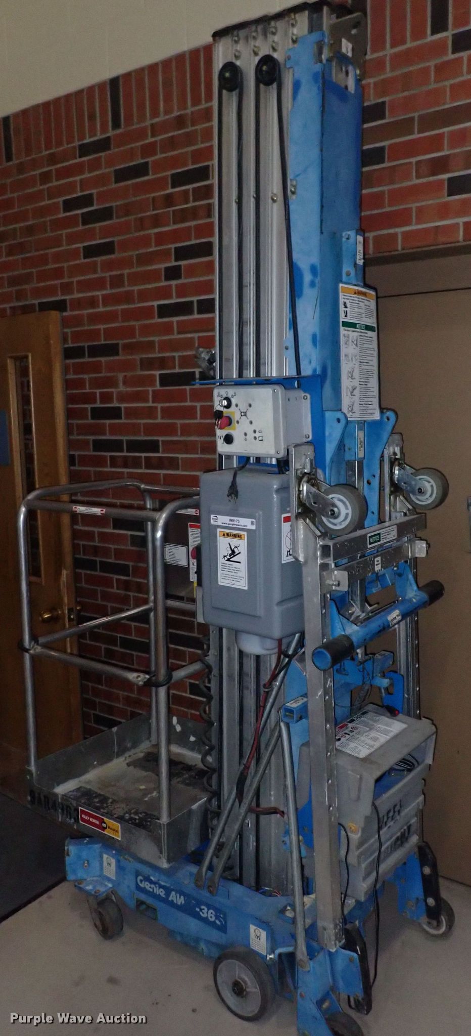 Genie AW36S vertical lift. Electric Motor. Volts: 110. Features Maximum lift capacity: 350 lbs, Maximum lift height: 36', Platform: 26" L x 26" W, Controls: Platform, Ground. Tires Solid. Notes Dead battery. Classical School of Wichita. Wichita, KS 67204