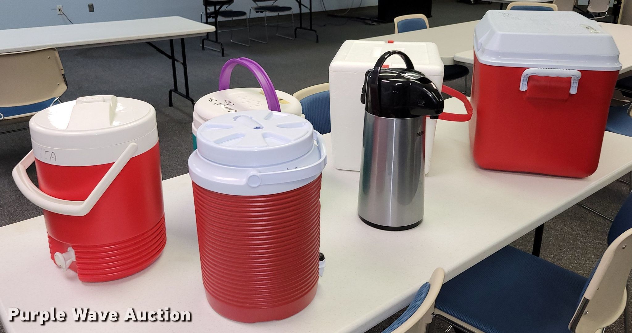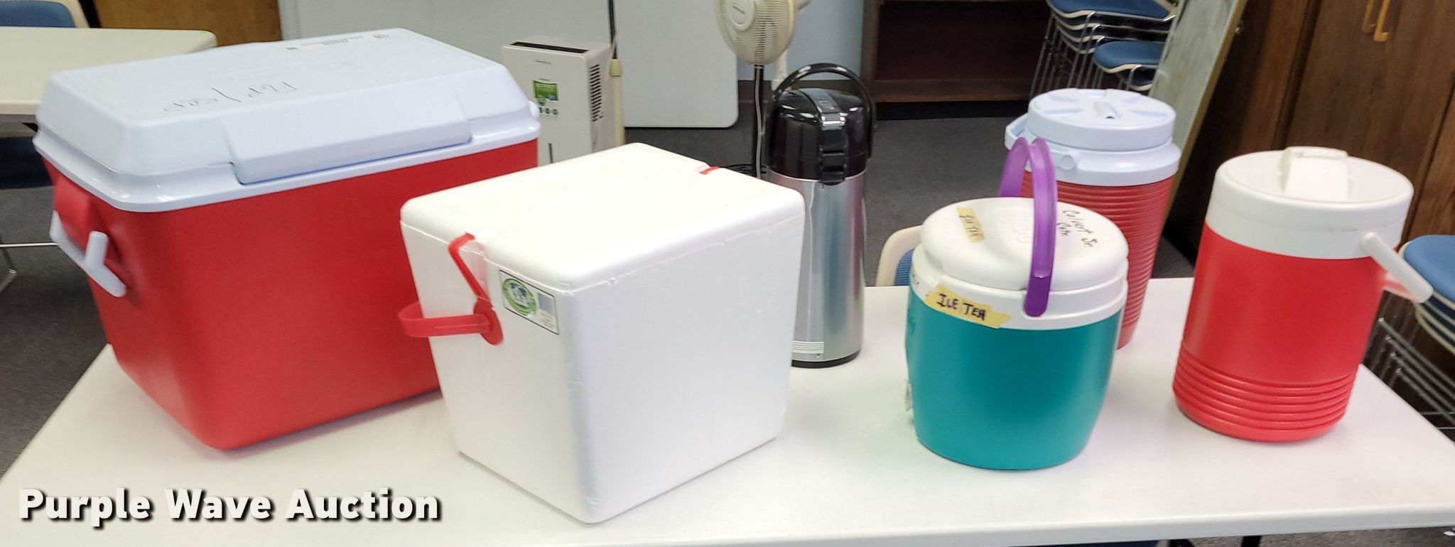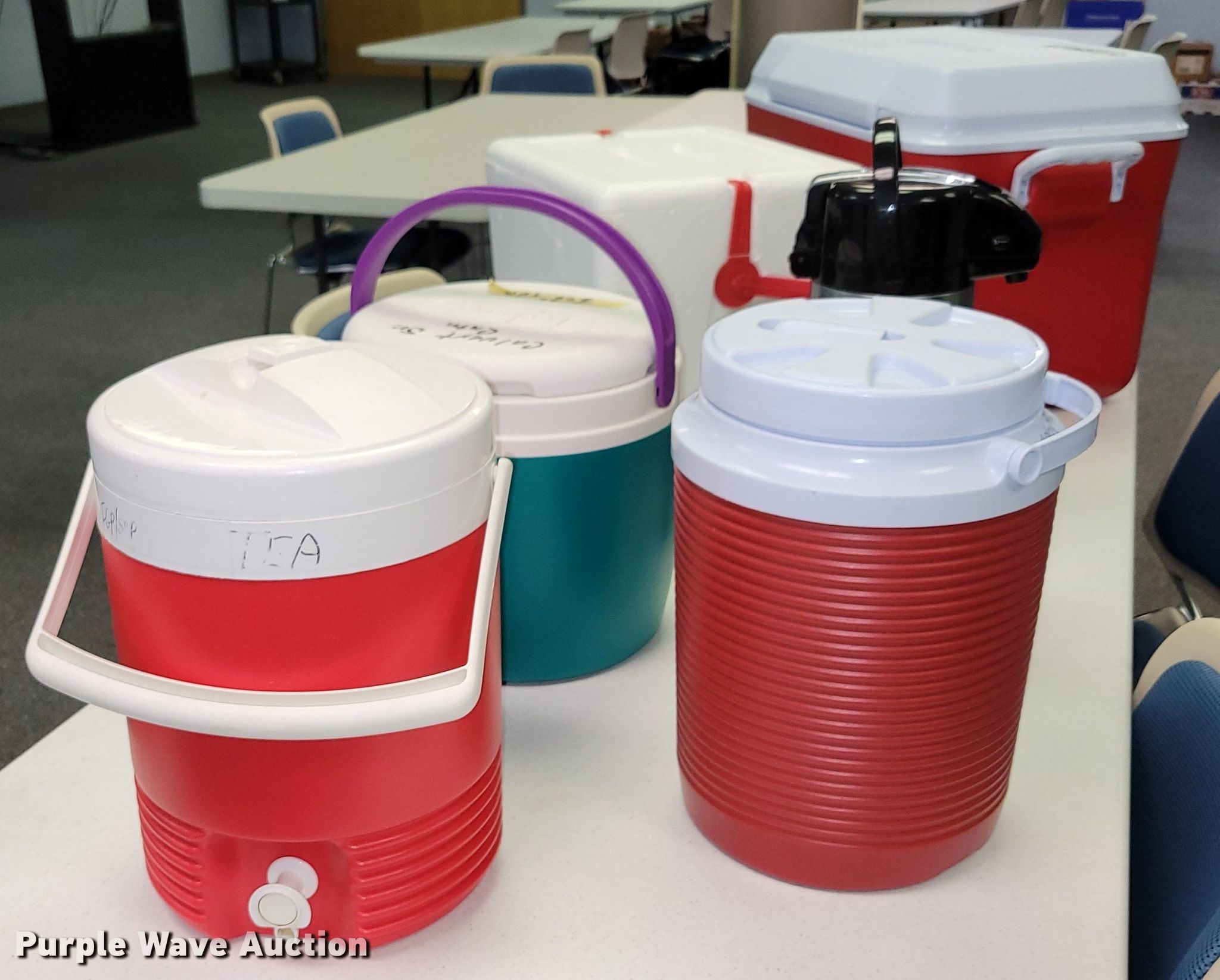 Purple Wave is selling a used All Other Household Items in Nebraska. This item is a Household items with the following: (3) water jugs, (2) coolers, (1) Thermos airpot