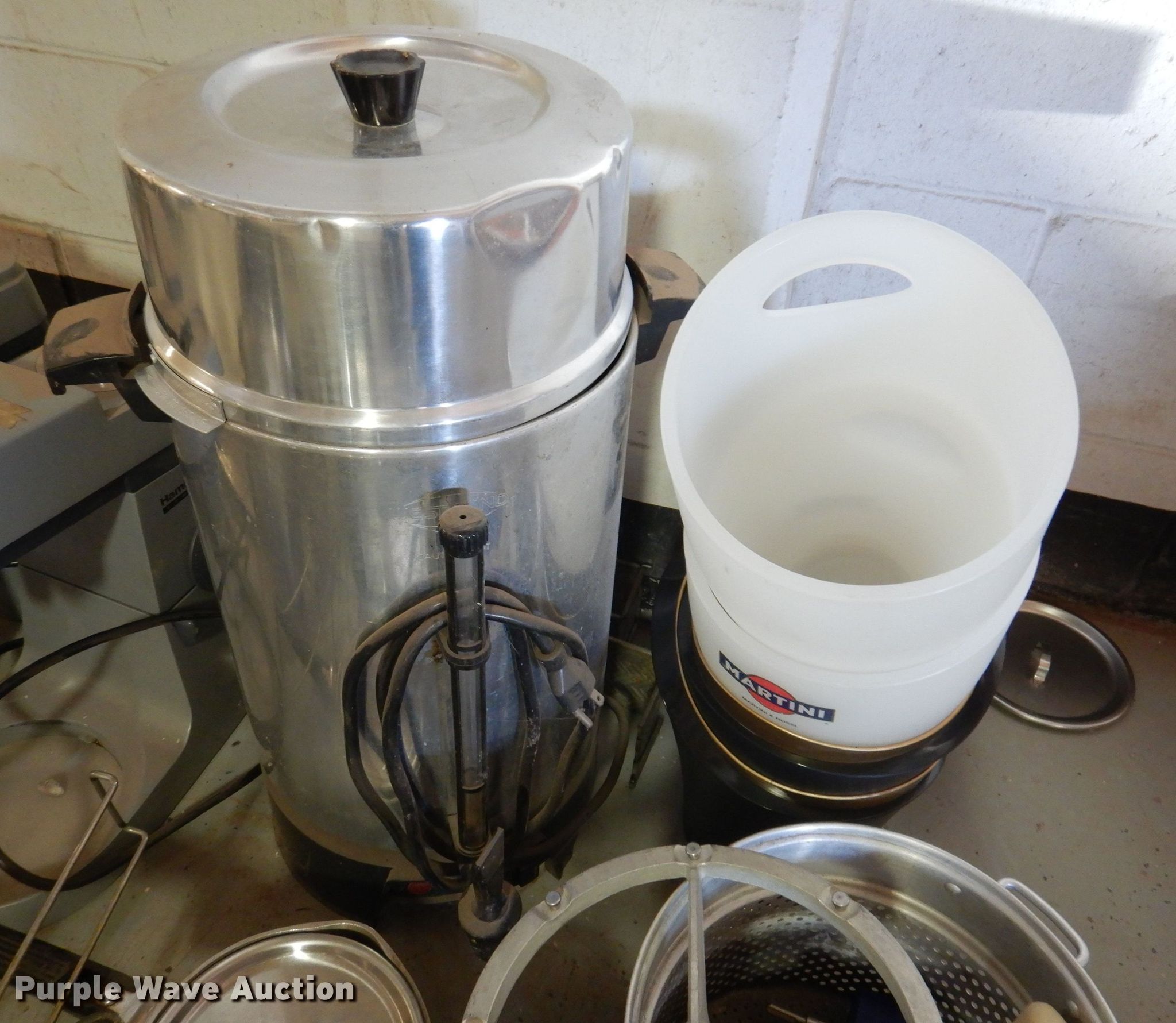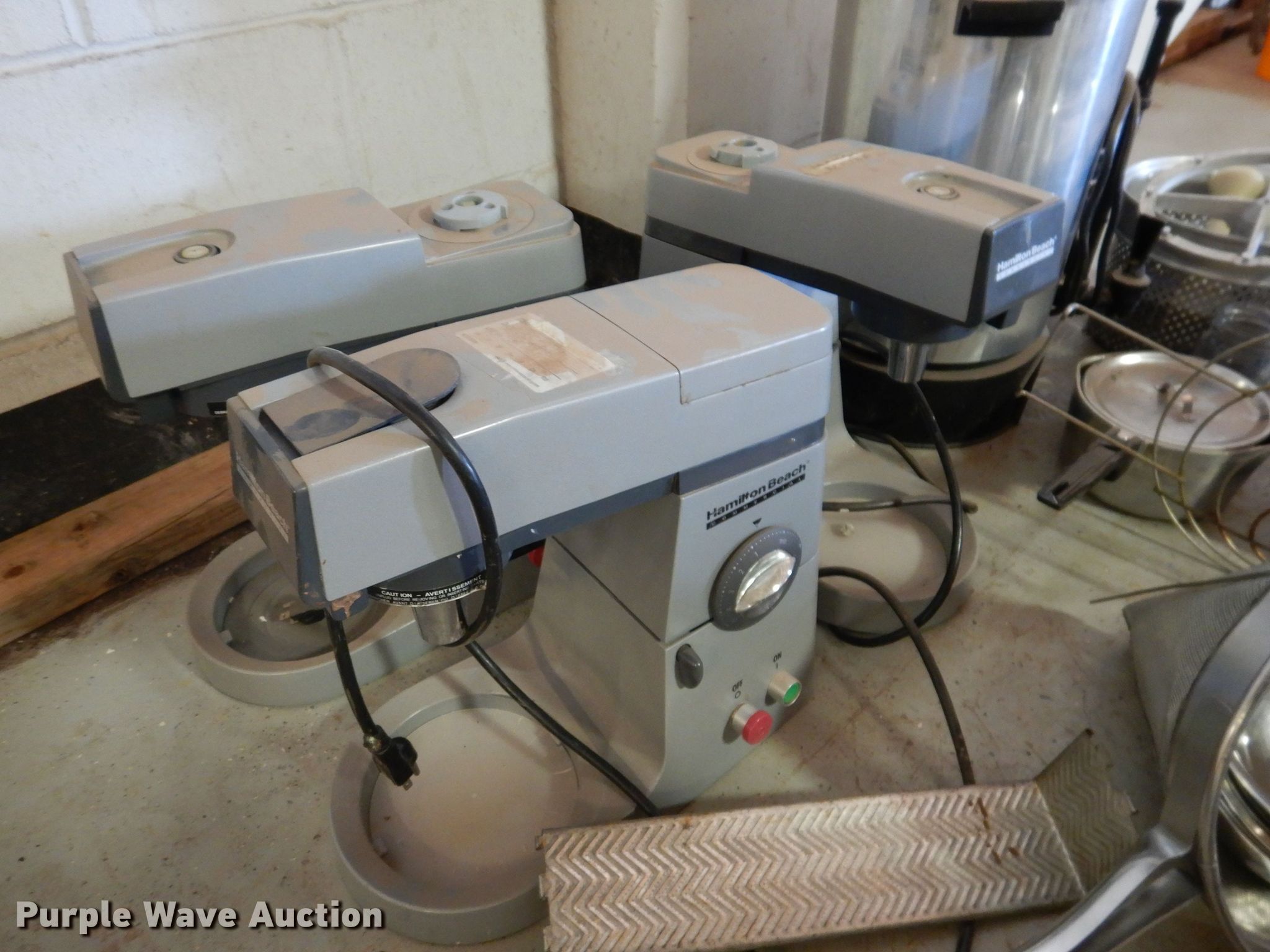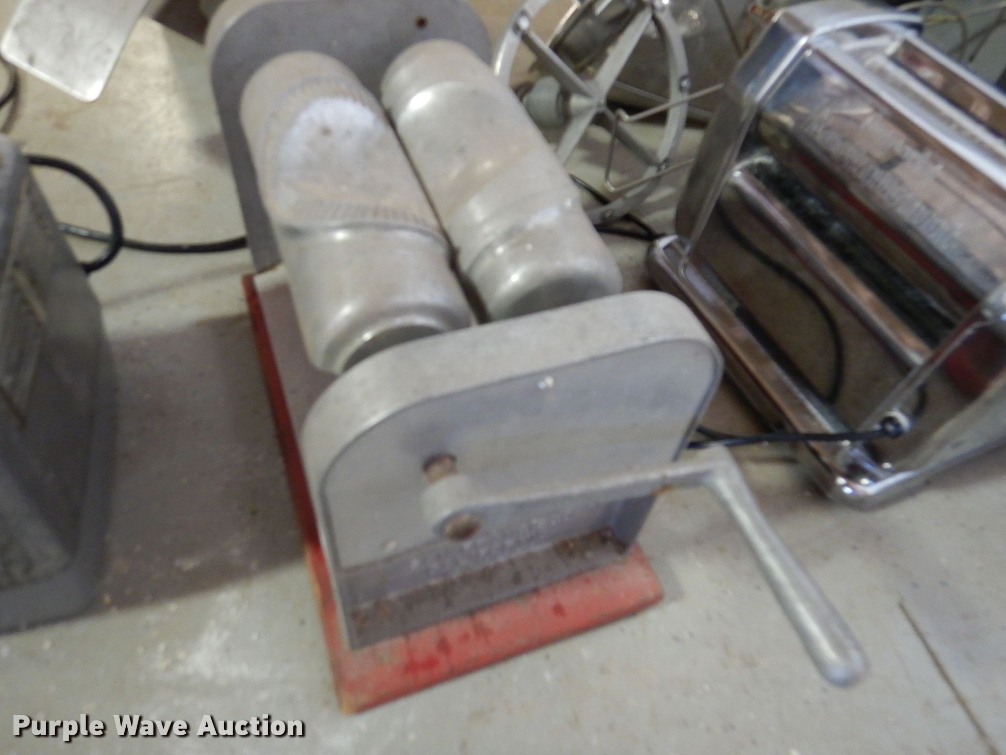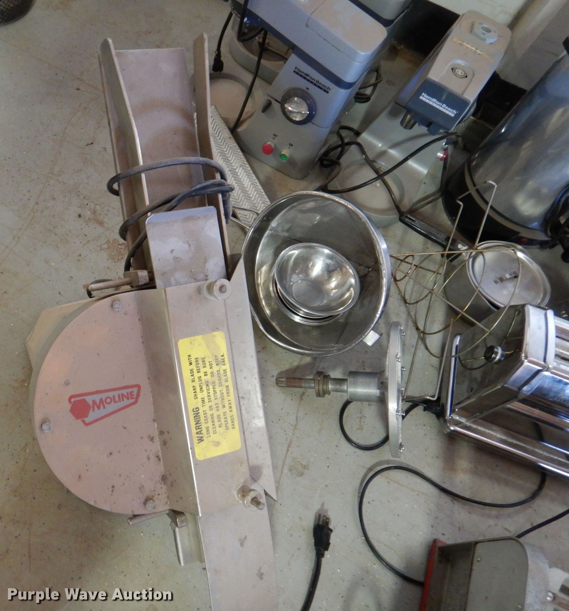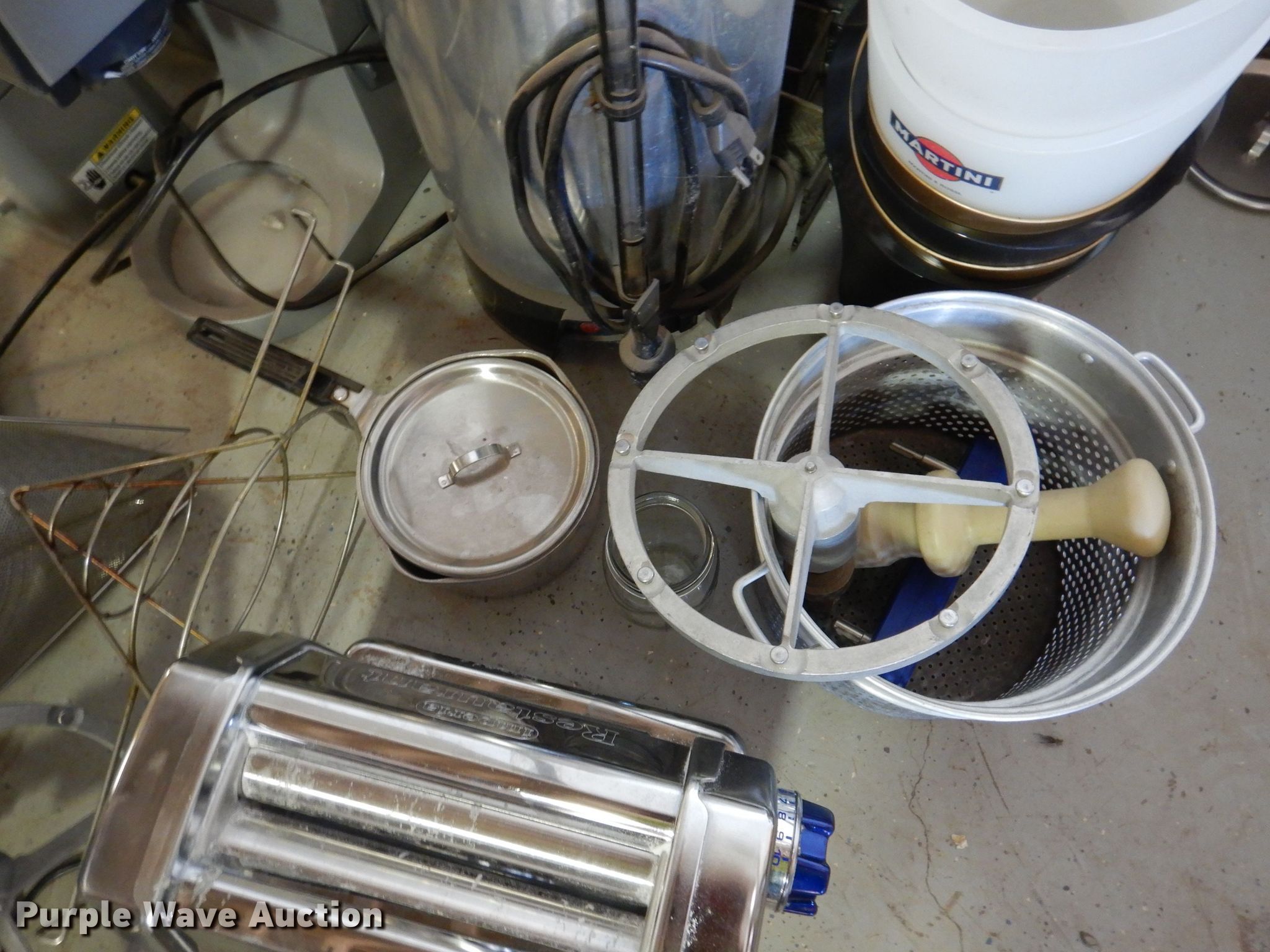 Purple Wave is selling a used Restaurant Equip. in Iowa. This item is a Kitchen equipment with the following: Mixers, Dough crimper, Pasta roller, Strainers, Pots, Coffee pot, Bun slicer