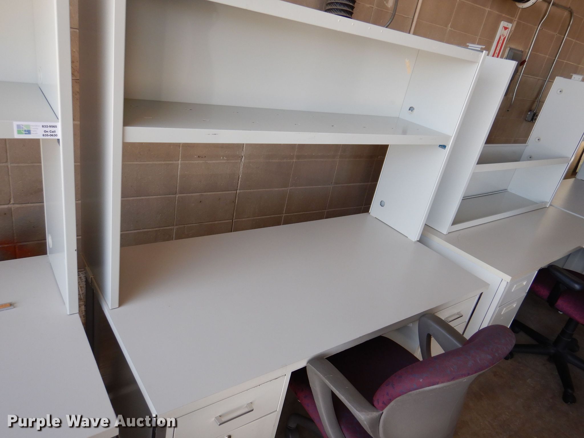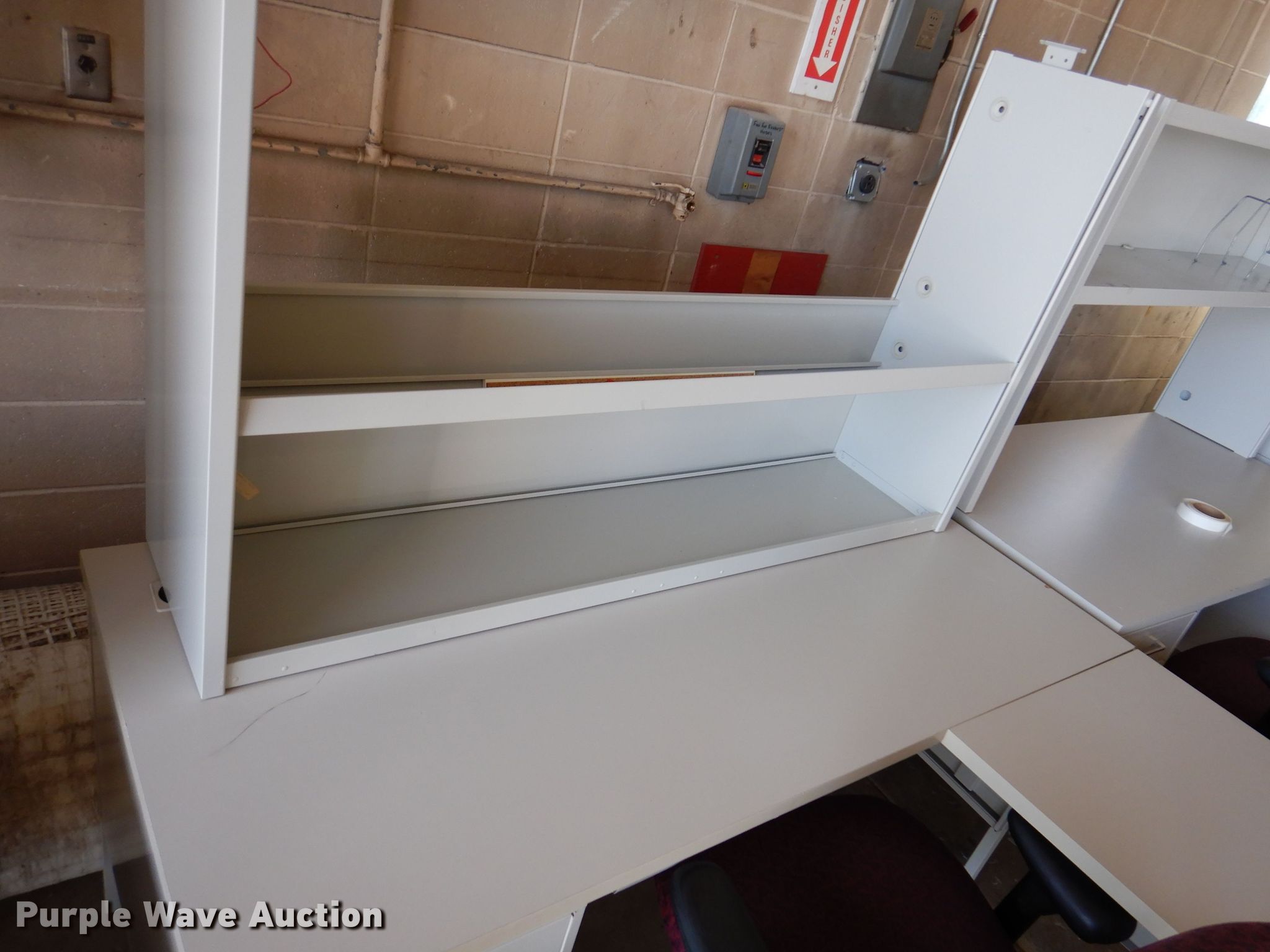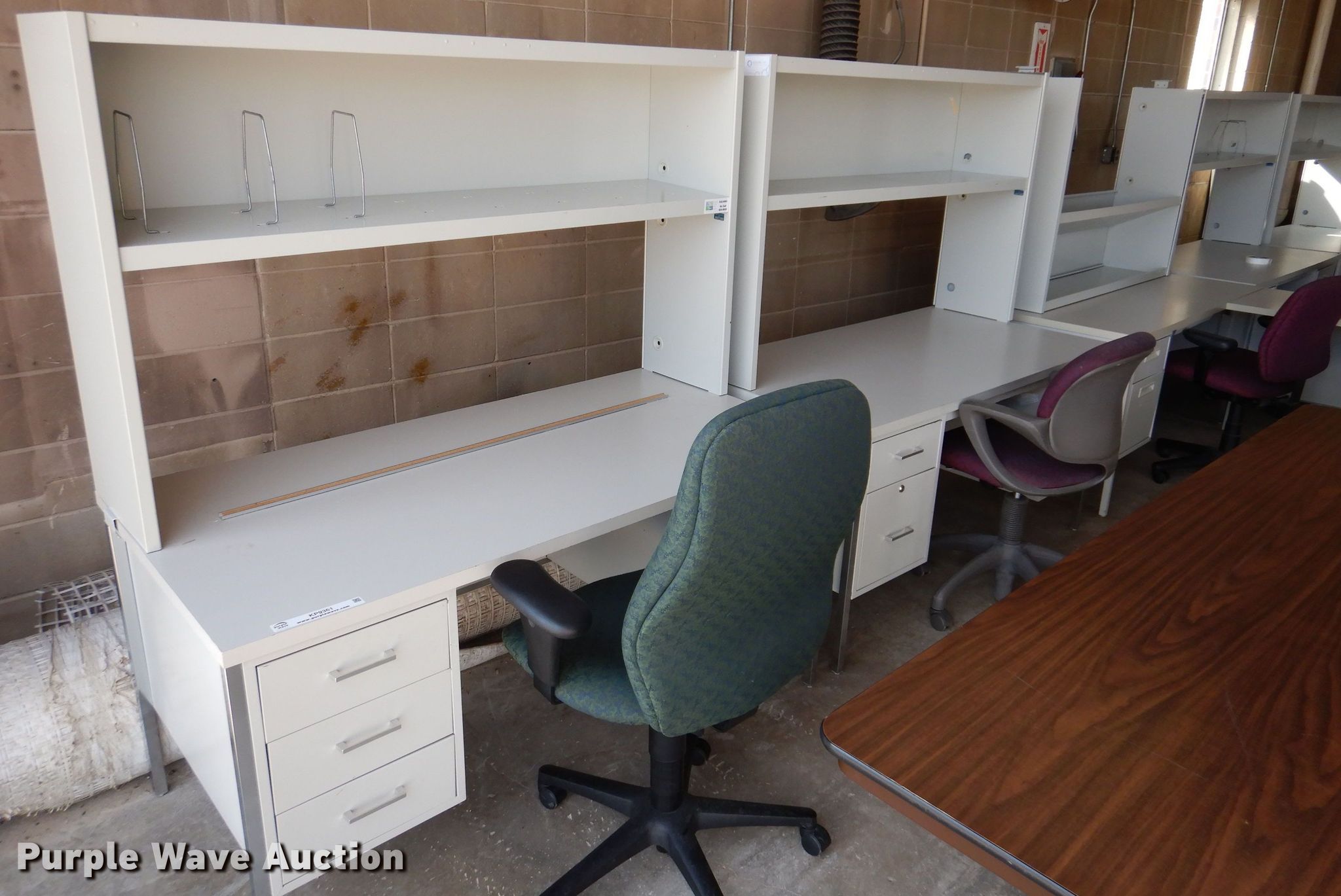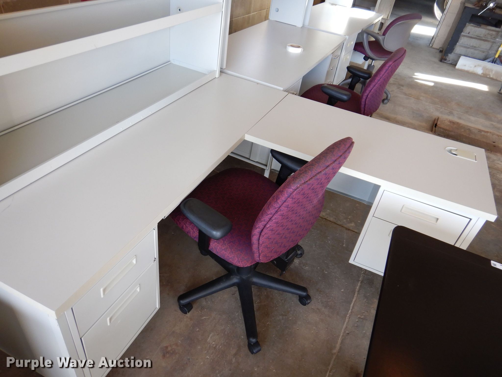 Purple Wave is selling a used Office Supplies and Equip. in Iowa. This item is a (3) desks with the following: 30" x 60" x 66", 66" x 30" x 66", One L-shape, 72" x 30" x 60" x 66", (3) rolling chairs