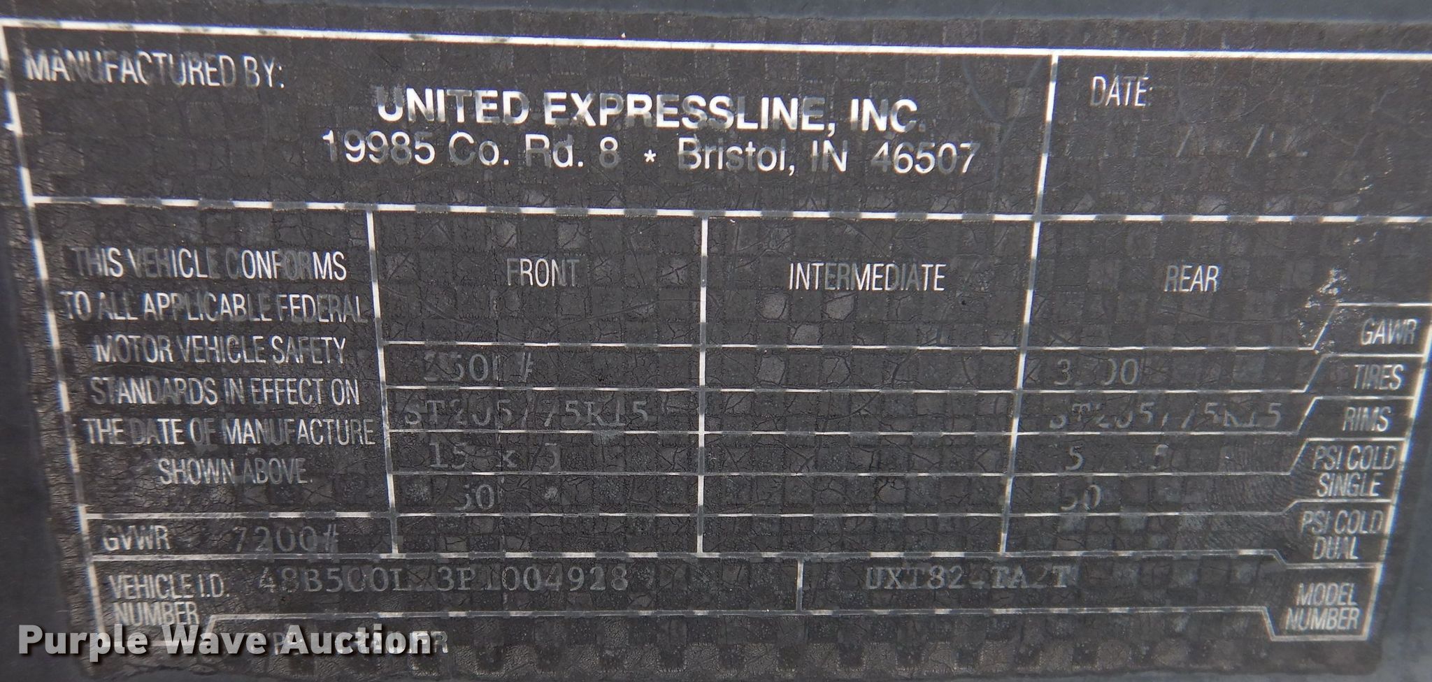 1993 United Expressline enclosed cargo trailer. VIN: 48B500L23P1004928. Dimensions Overall: 28' L x 102" W, Body: 24' L x 94" W. Features Deck type: Wood. Chassis Ball hitch: 2 5/16", Landing gear: Single, Suspension: Spring, Brakes: Electric, Axles: Tandem, GVWR: 7,200 lbs, GAWR: 3,500 lbs. Tires Steel wheels, Size: ST205/75R15. Notes Contents not included. Iowa title. Seller is a government entity who will be assigning and distributing the title. Please contact the seller for distribution questions. 3501 Millards Lane. Webster City, IA 50595