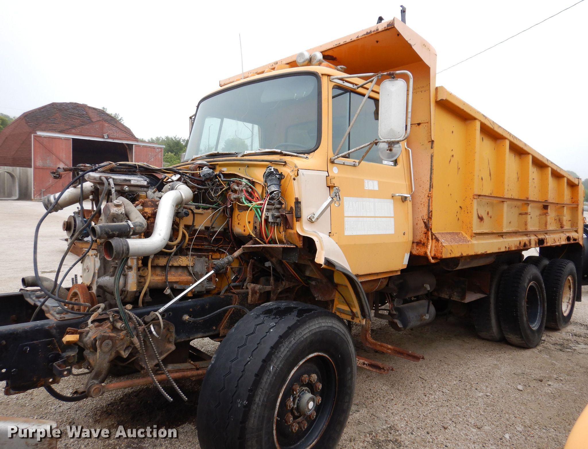 1988 Ford LTS9000 dump truck. Miles: 73,273 on odometer, VIN: 1FDZY90X8JVA04993. Engine Caterpillar 3406B, Displacement: 14.6L, Cylinders: 6, Fuel type: Diesel. Transmission Eaton Fuller, Manual, Speed: 9. Chassis Axles: Tandem, Differential lock: Inter-axle, Suspension: Spring over walking beam, Brakes: Air, GVWR: 56,000 lbs, Wheelbase: 185". Features Dump bed 15' L x 96" W, Side height: 40", Bed type: Steel, Ram: Single. Tires Front: 425/65R22.5, Rear: 10.R20. Notes Hood removed, Dash disassembled, Rear end disassembled, Tire removed, Frame cracked, Non-operational unit. Iowa title. Mileage has not been verified. Exempt will be written in the odometer disclosure on the title. Seller is a government entity who will be assigning and distributing the title. Please contact the seller for distribution questions. Hamilton County, IA. 1605 2nd Street. Webster City, IA 50595