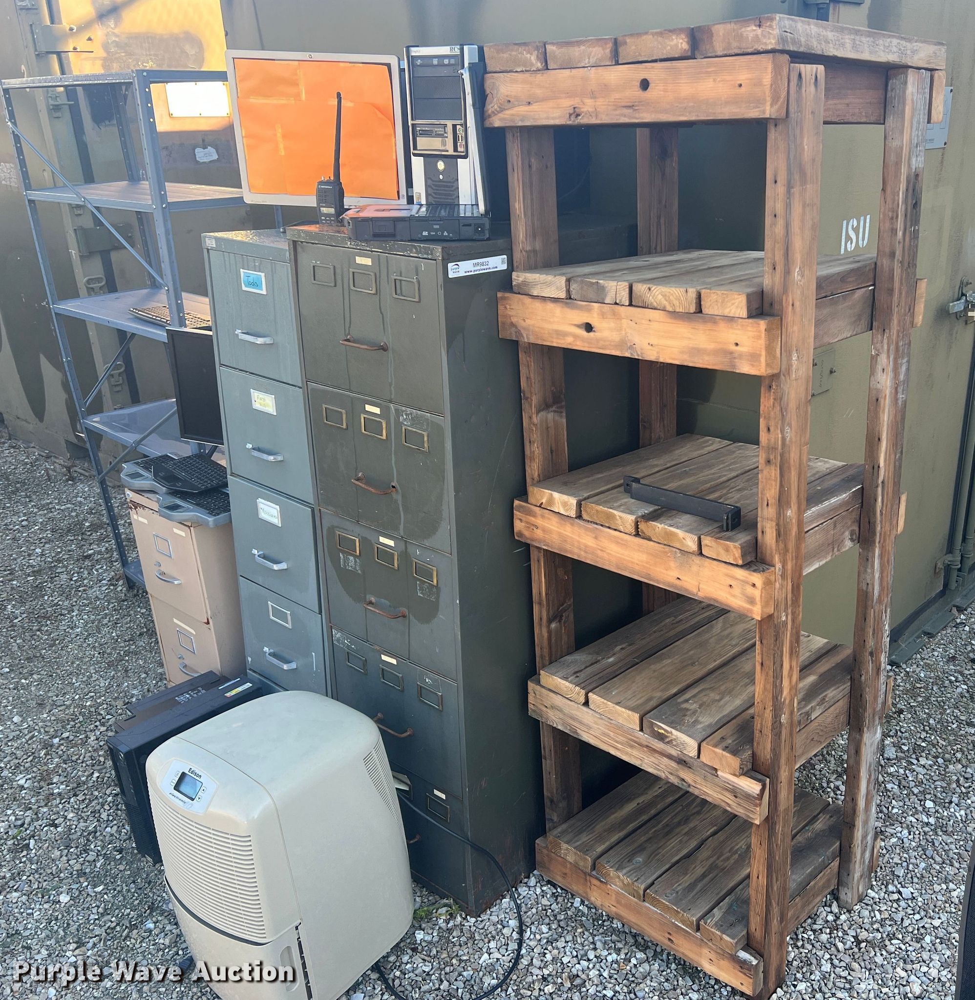 Purple Wave is selling a used Office Supplies and Equip. in Missouri. This item is a Office supplies and equipment with the following: (3) file cabinets, (2) convection ovens, (2) office chairs, Metal cart, (2) Bretford TV carts, Steel shelf, Wood shelf, Supersonic 32" LED television, Edison EMD40ES dehumidifier, Panasonic Toughbook CF-30 laptop, CPUs, Hard drives have been removed, Monitors, Motorola radio, (3) vehicle partitions, Removed from a Dodge Durango and Chevrolet Tahoe, (3) toolboxes and more