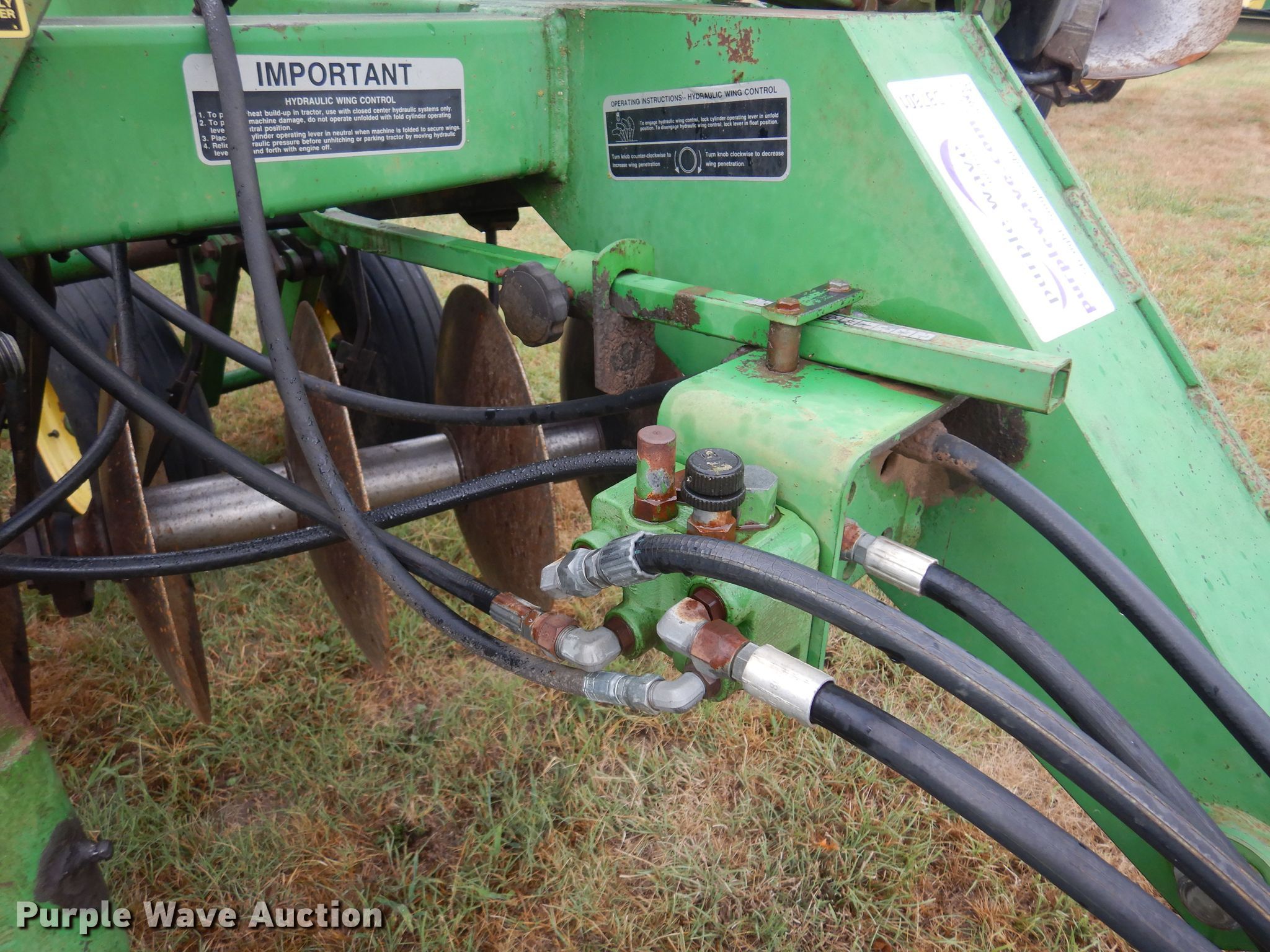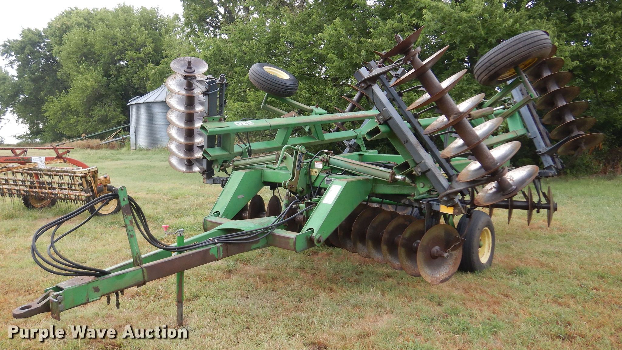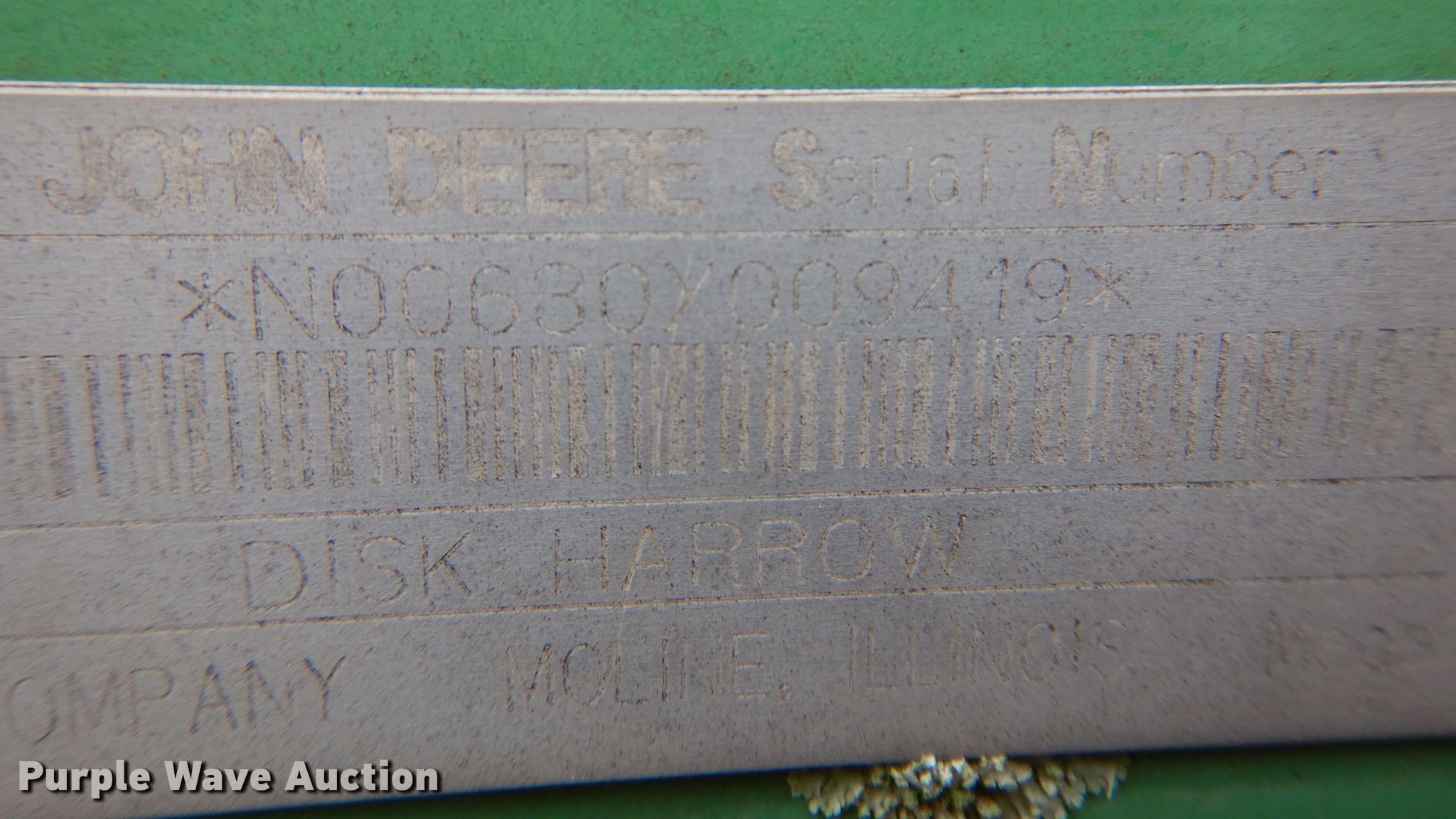 Purple Wave is selling a used Disk in Kansas. This item is a John Deere 630 tandem disk with the following: Overall width: 20', Serial: N00630X009419