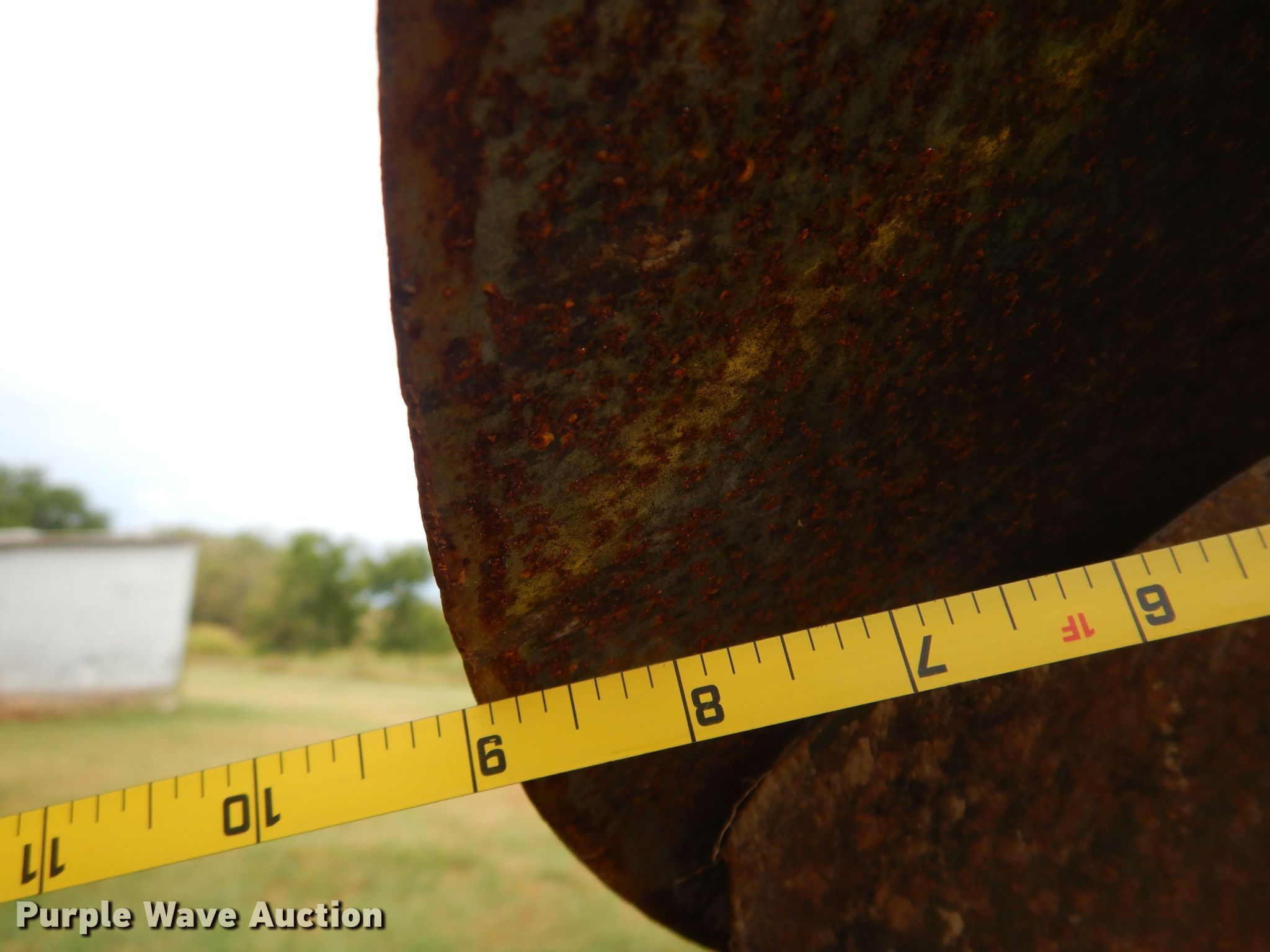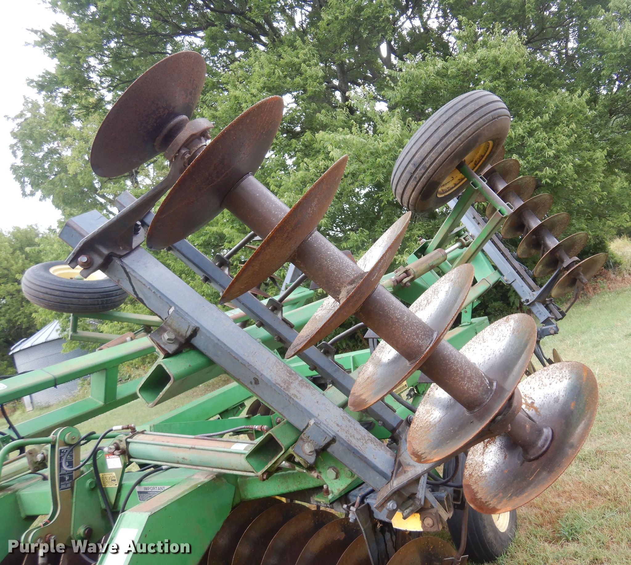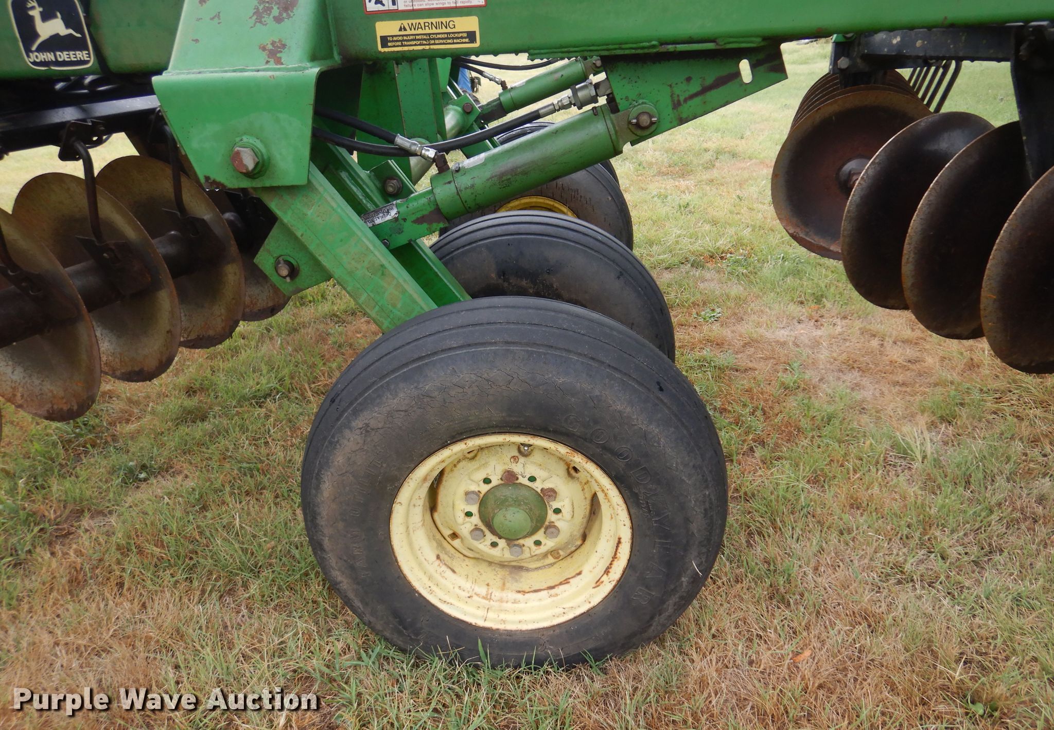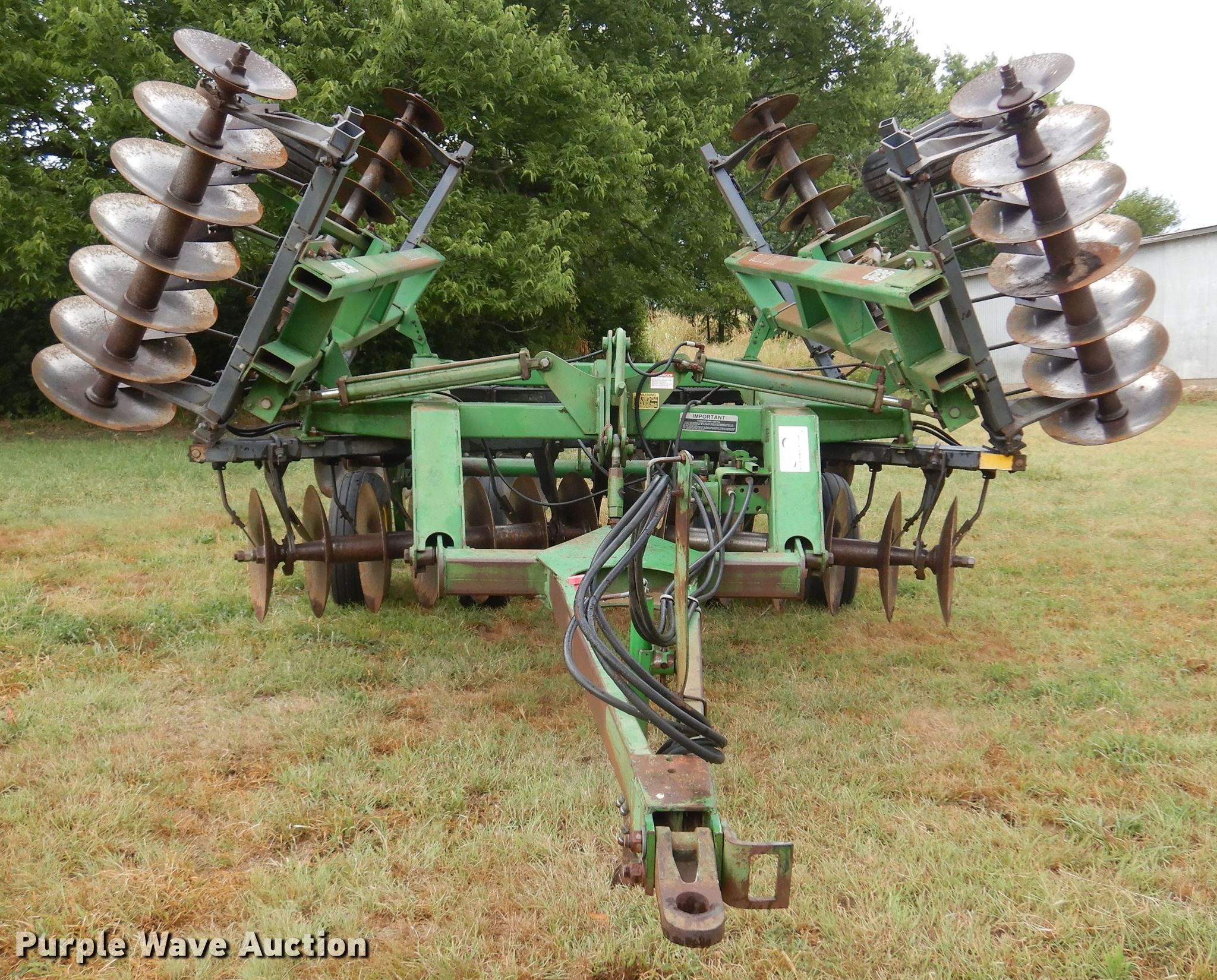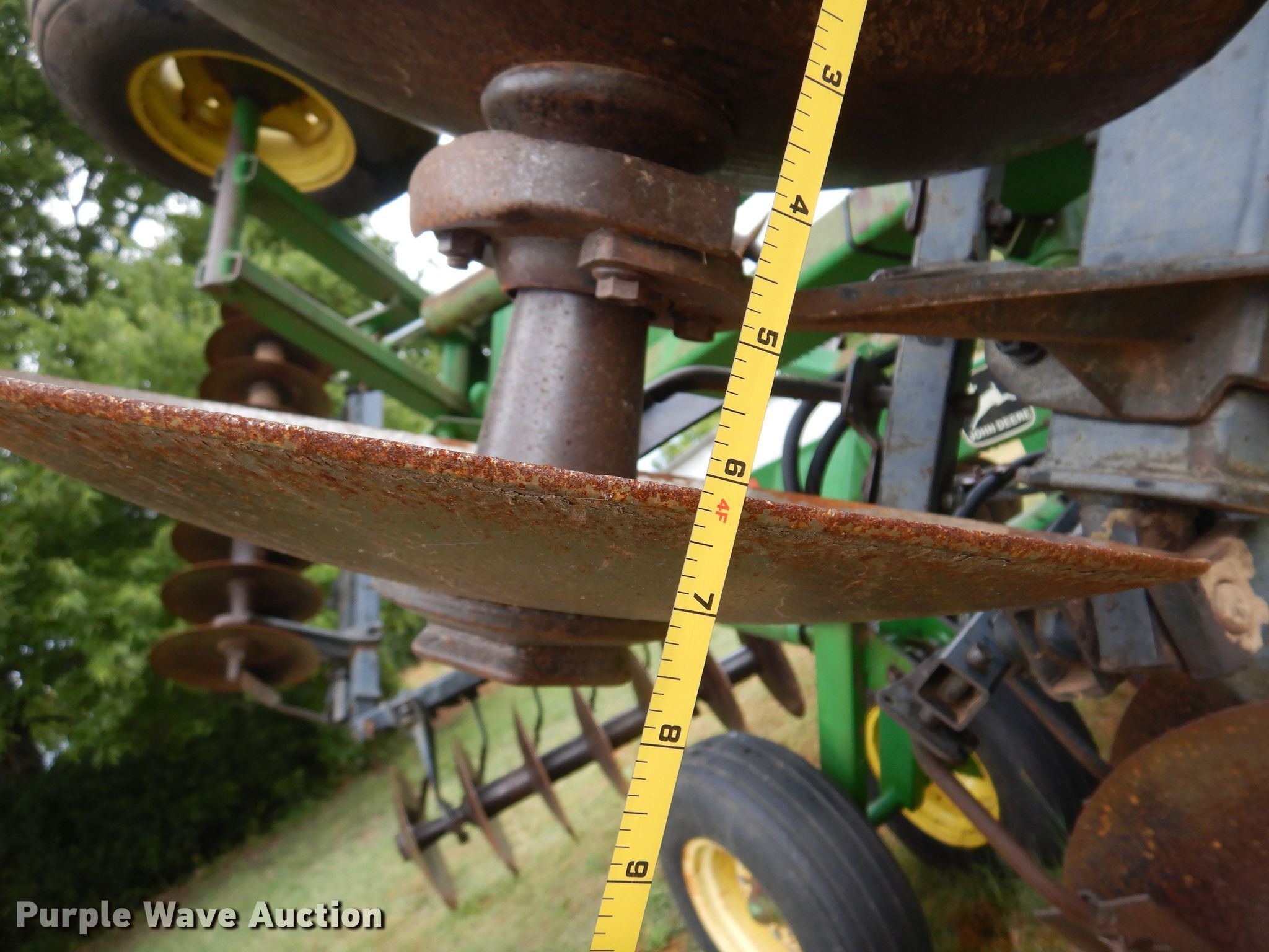 John Deere 630 tandem disk. Overall width: 20', Serial: N00630X009419. Features Front blades Diameter: 22", Spacing: 9", Rear blades Diameter: 22", Spacing: 9", Disk scrapers, Operation Hydraulic lift, Hydraulic fold, Leveler: Manual. Tires Tire size: 9.5L-14. Burden, KS 67019