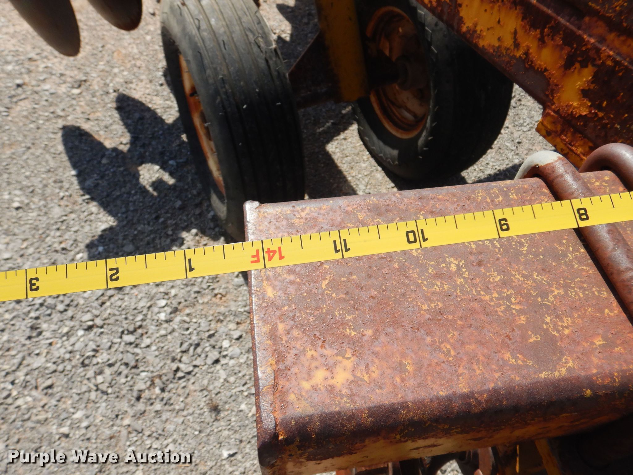Off-set disk. Overall width: 14'. Features Front blades Diameter: 22", Spacing: 9.5", Rear blades Diameter: 22", Spacing: 9.5", Operation Hydraulic lift, Attachments Tine harrow Harrow bars: 2.. Tires Tire size: 9.5L-14. Bouse Junction , OK 73860