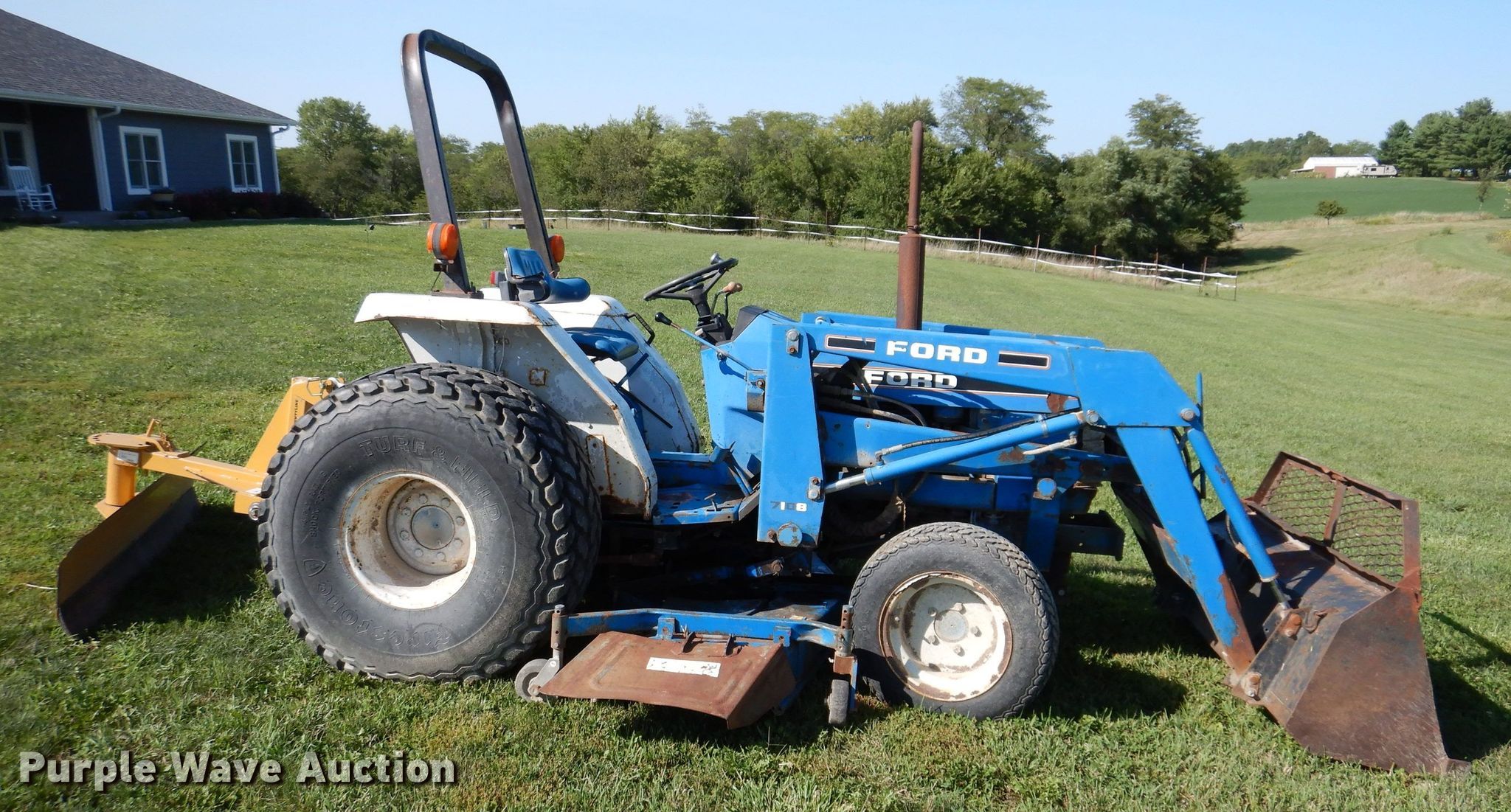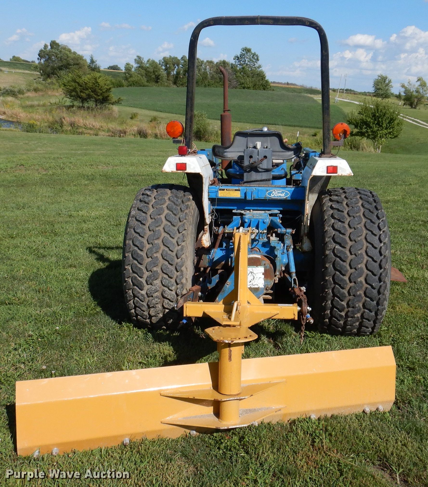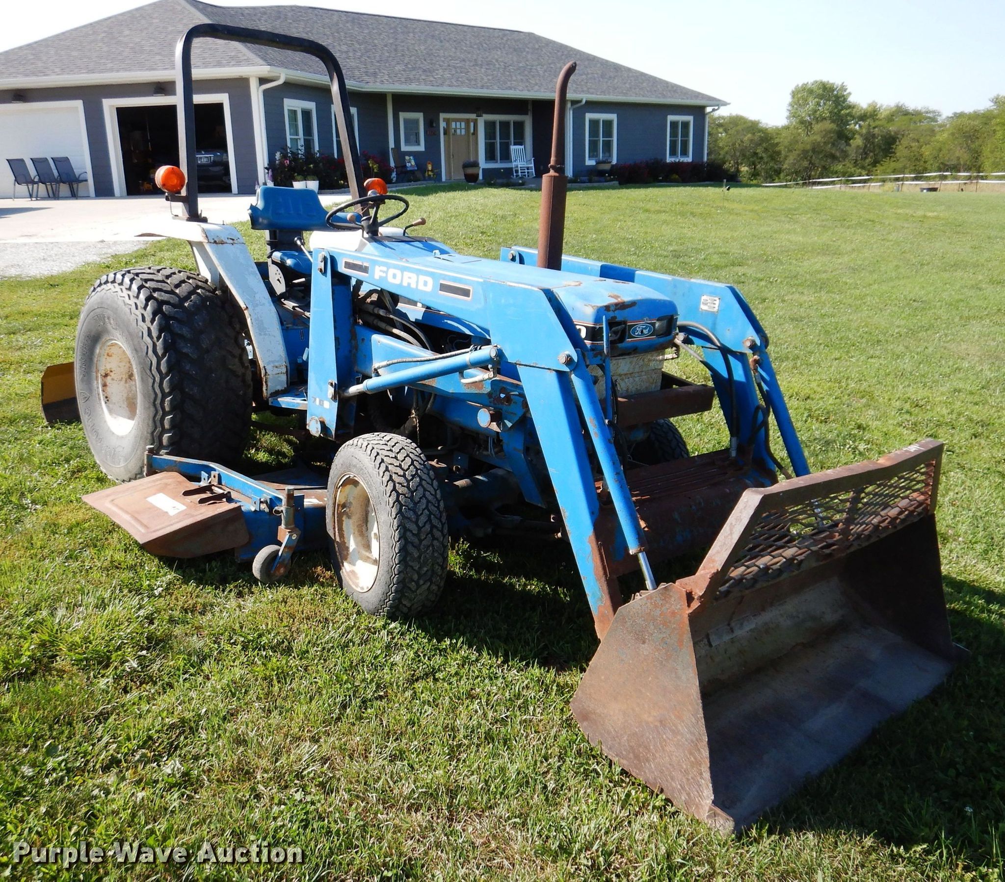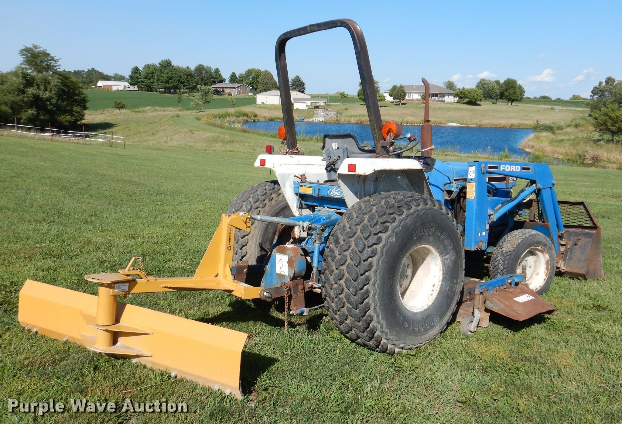 Ford 1920 MFWD tractor. Hours: 3,173 on meter. Engine Cylinders: 4, Fuel type: Diesel. Transmission Manual, 12F - 12R, Left-hand reverser, Differential lock. Features PTO: 540, Three point Top link, Loader Ford 7108, Controls: Joystick, Bucket Width: 61", Blade Country Line , Width: 6', Mower deck Ford 914, Cutting width: 68". Tires Front: 27x8.5-15NHS, Rear: 18.4-16.1. Notes Mower deck belt missing. 7750 155th Avenue. Indianola, IA 50125