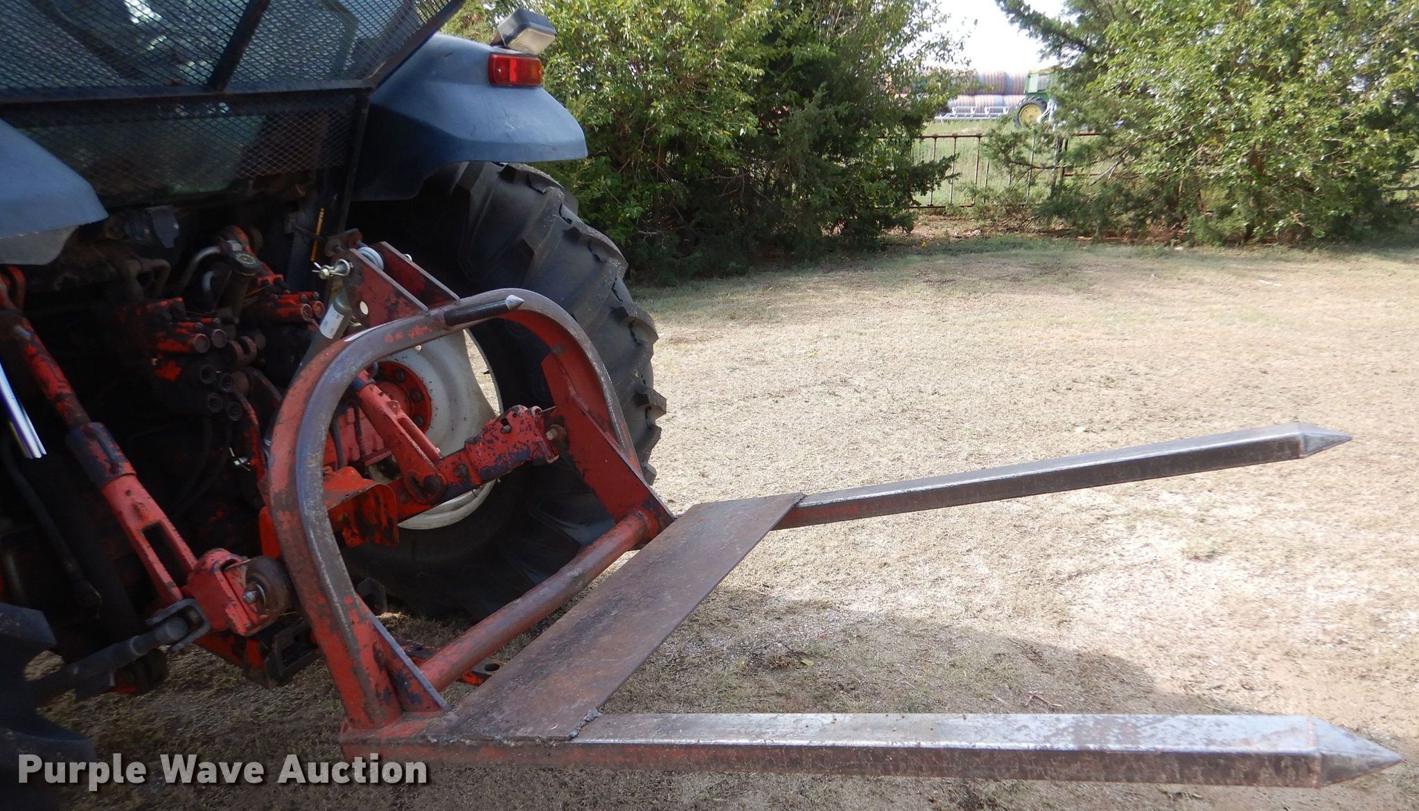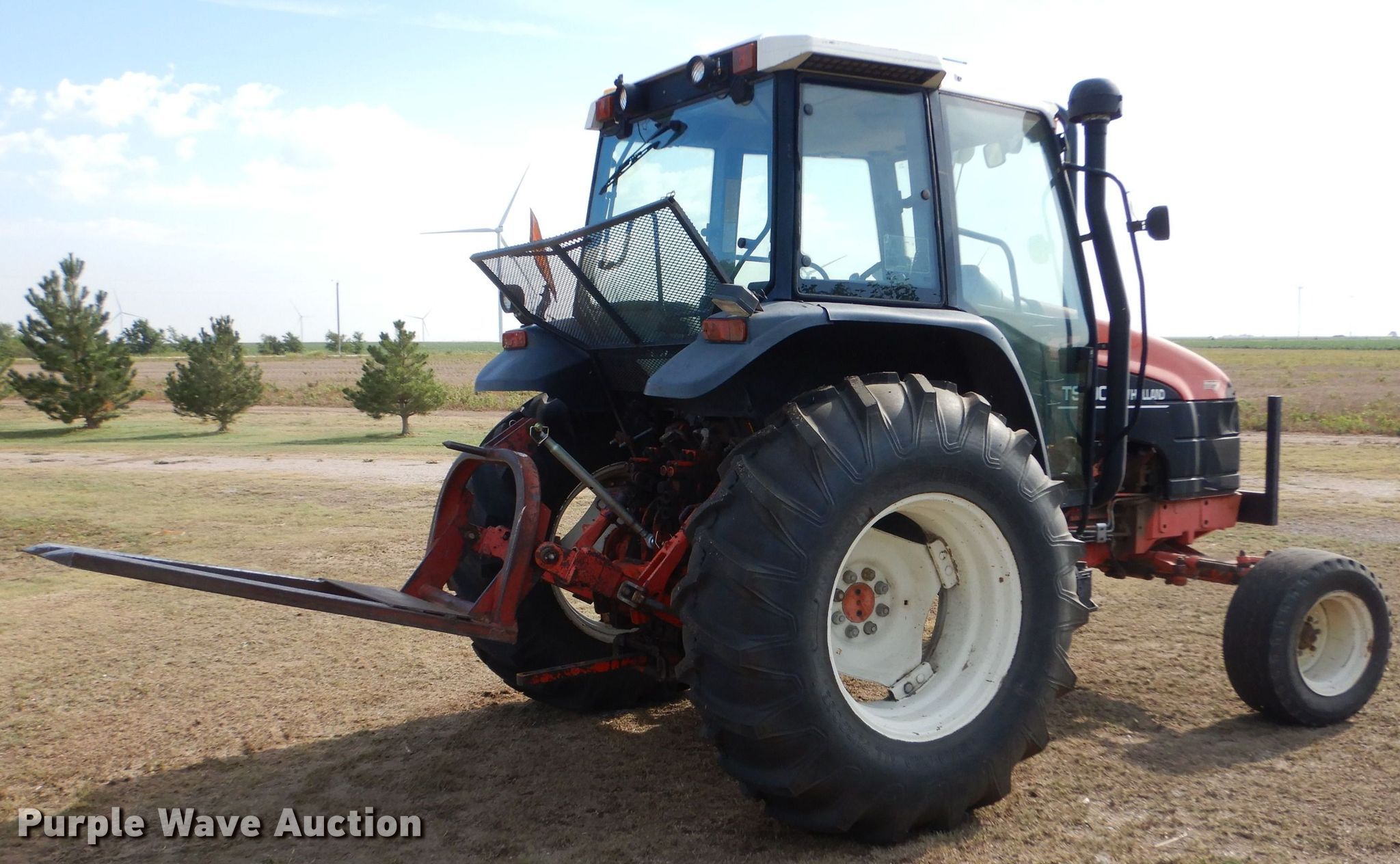 2000 New Holland TS100 tractor. Hours: 5,620 on meter, Serial: 135589B. Engine New Holland 450T, Displacement: 5.0L, Cylinders: 4, Fuel type: Diesel. Transmission Synchro, 12F - 12R, Differential lock. Operators station AC, Heat. Features PTO: 540, Three point Top link, Seven pin outlet, Hydraulic remote sets Rear: 4, Bale forks WorkSaver, Length: 52", Hitch: Three point. Tires Front: 11L-16, Rear: 18.4-30. Dodge City, KS 67801