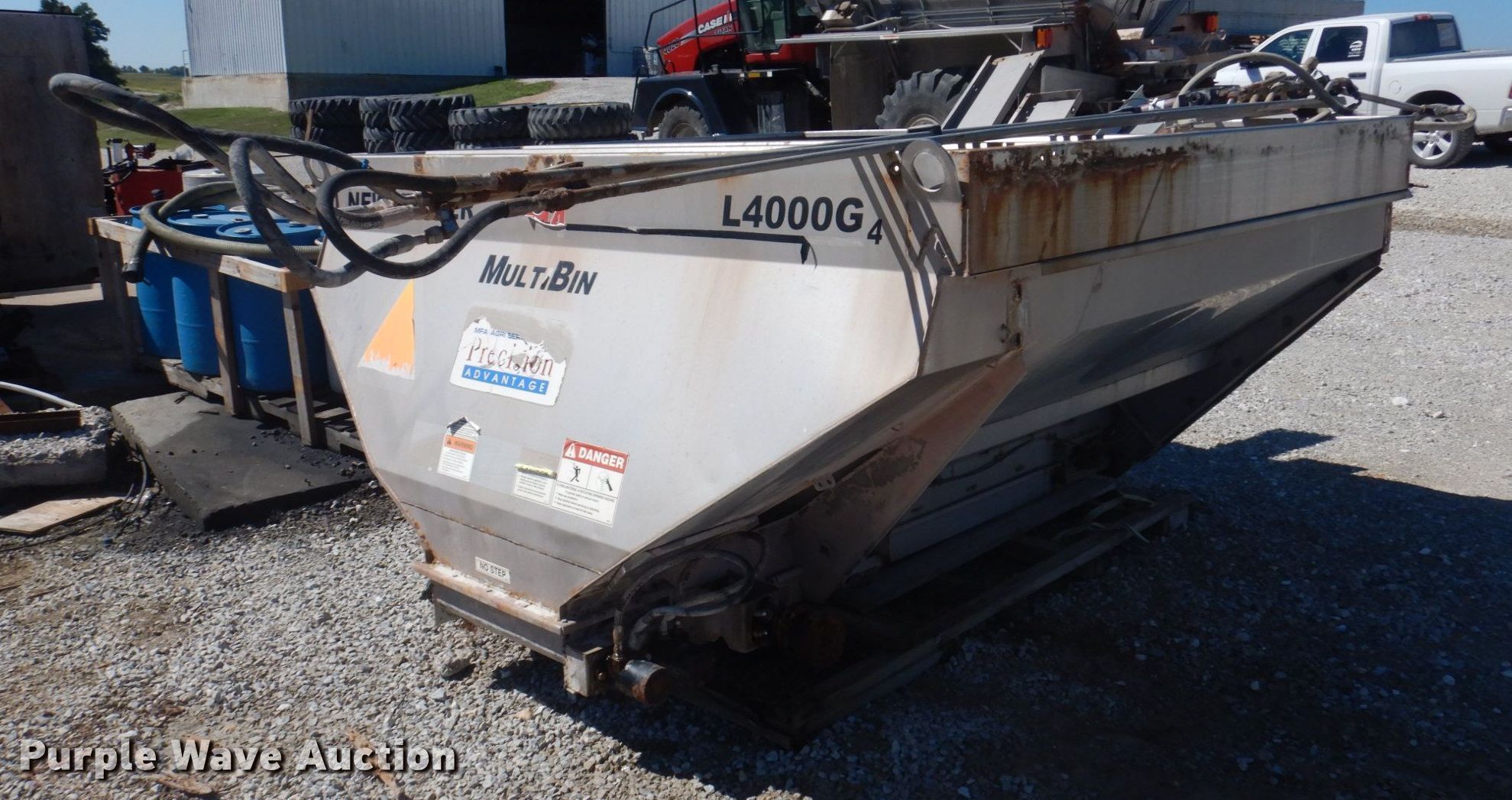 Purple Wave is selling a used Applicator Attach. in Missouri. This item is a New Leader L4000G4 applicator bed with the following: 9'L x 8'1"W insert, Main bin, (2) micro bins, Stainless steel grates, Main belt motor, (2) micro bin belt motors, Hydraulic system, Valves, Bed extensions