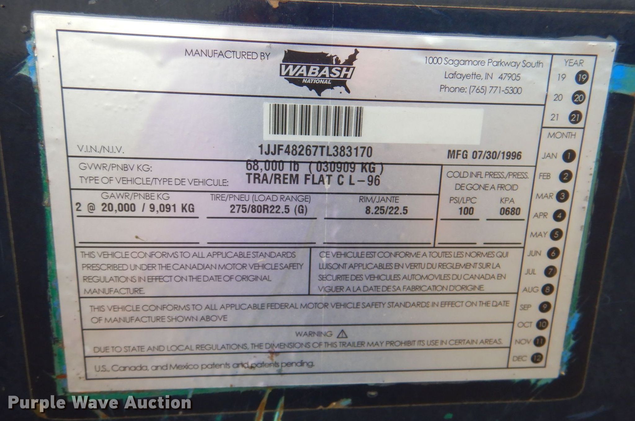 Purple Wave is selling a used Flat or Drop Deck Trailer in Kansas. This item is a 1996 Wabash CL-96 flatbed trailer with the following: VIN: 1JJF48267TL383170