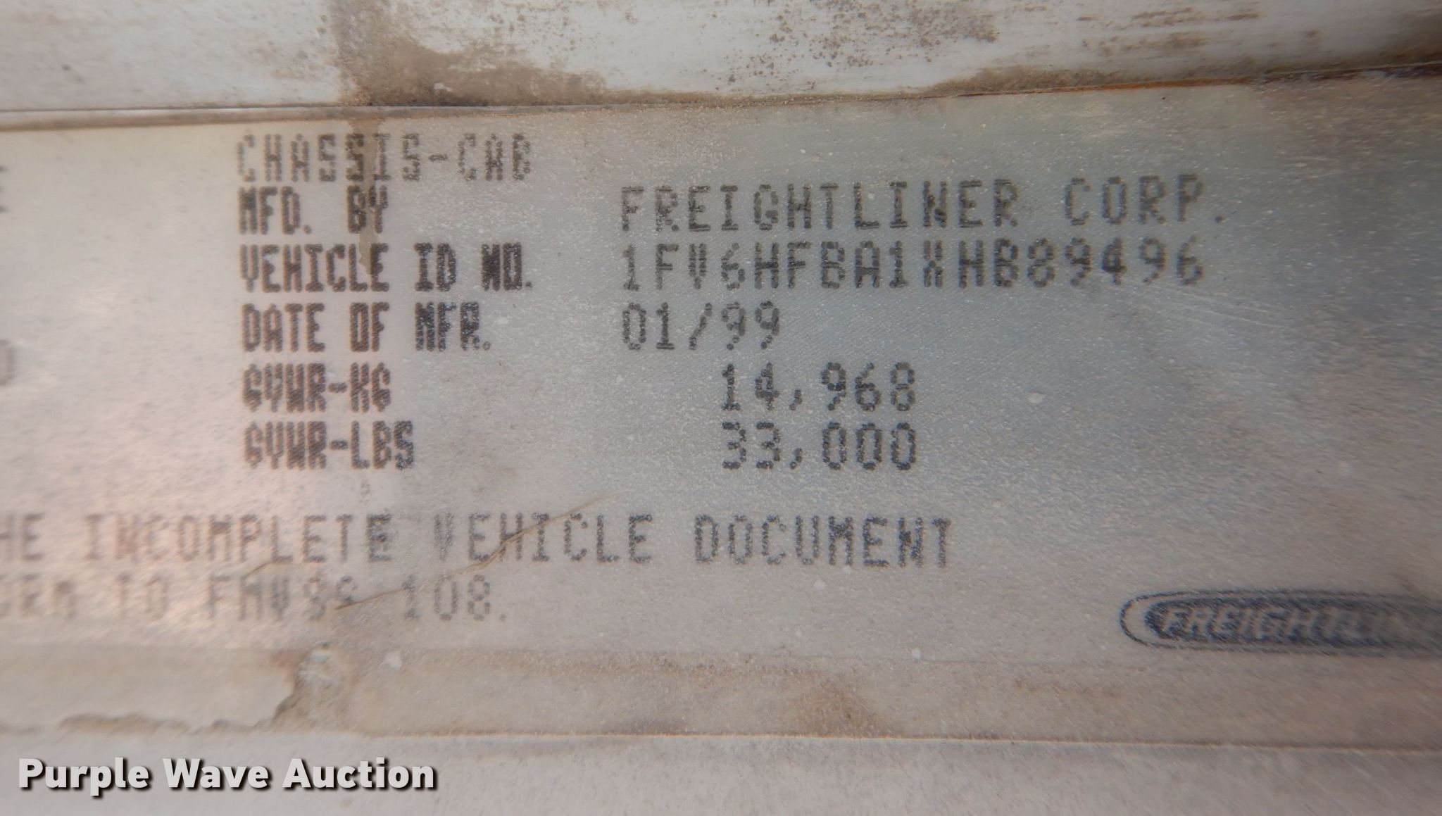 Purple Wave is selling a used Truck Chassis in Iowa. This item is a 1999 Freightliner FL70 truck cab and chassis with the following: Miles: 290,323 on odometer, Hours: 21,618 on meter, VIN: 1FV6HFBA1XHB89496