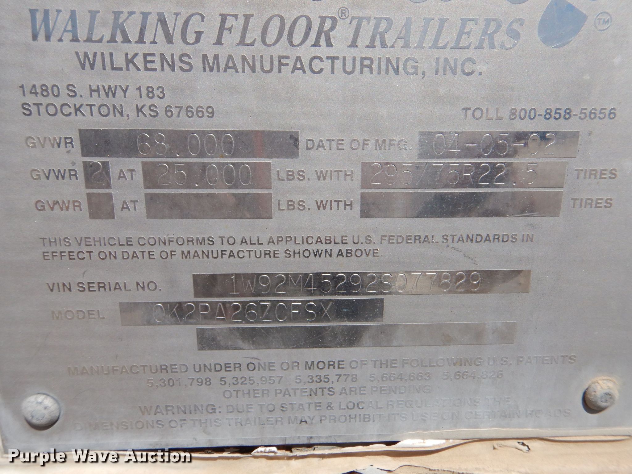 2002 Wilkens 0K2PA26ZCFSX walking floor trailer. VIN: 1W92M45292S077829. Dimensions Overall: 45' L x 96" W. Features Body type: Aluminum, Floor: Walking floor, Roll tarp. Chassis Landing gear: Dual, Suspension: Spring, Brakes: Air, Axles: Tandem, GVWR: 68,000 lbs, GAWR: 25,000 lbs. Tires Aluminum wheels, Size: 295/75R22.5. Kansas title. Seller is a licensed motor vehicle dealer. The buyer may be required to pay sales tax and/or registration fees to the dealer prior to taking possession. Title will be assigned and distributed by the dealer. Please contact the seller for distribution questions. Wilkens Mfg. Inc.. 1480 US 183. Stockton, KS 67669