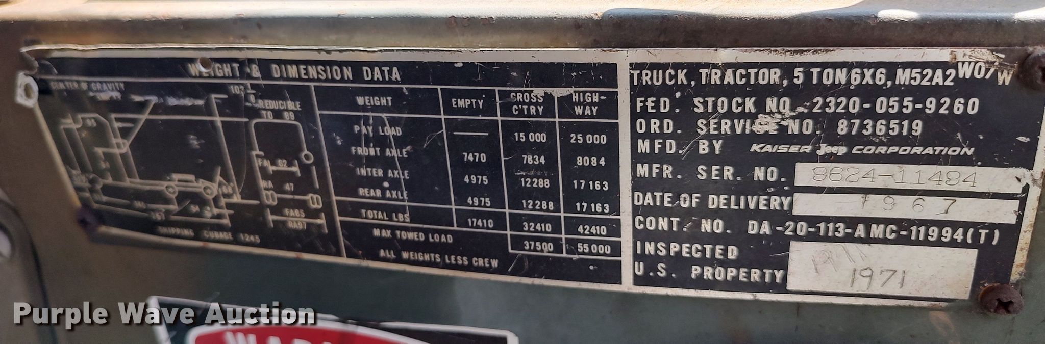 Purple Wave is selling a used Truck Tractor in Oklahoma. This item is a 1967 Kaiser M52A2 semi truck with the following: Miles: 24,141 on odometer, Hours: 643 on meter, VIN: 962411494