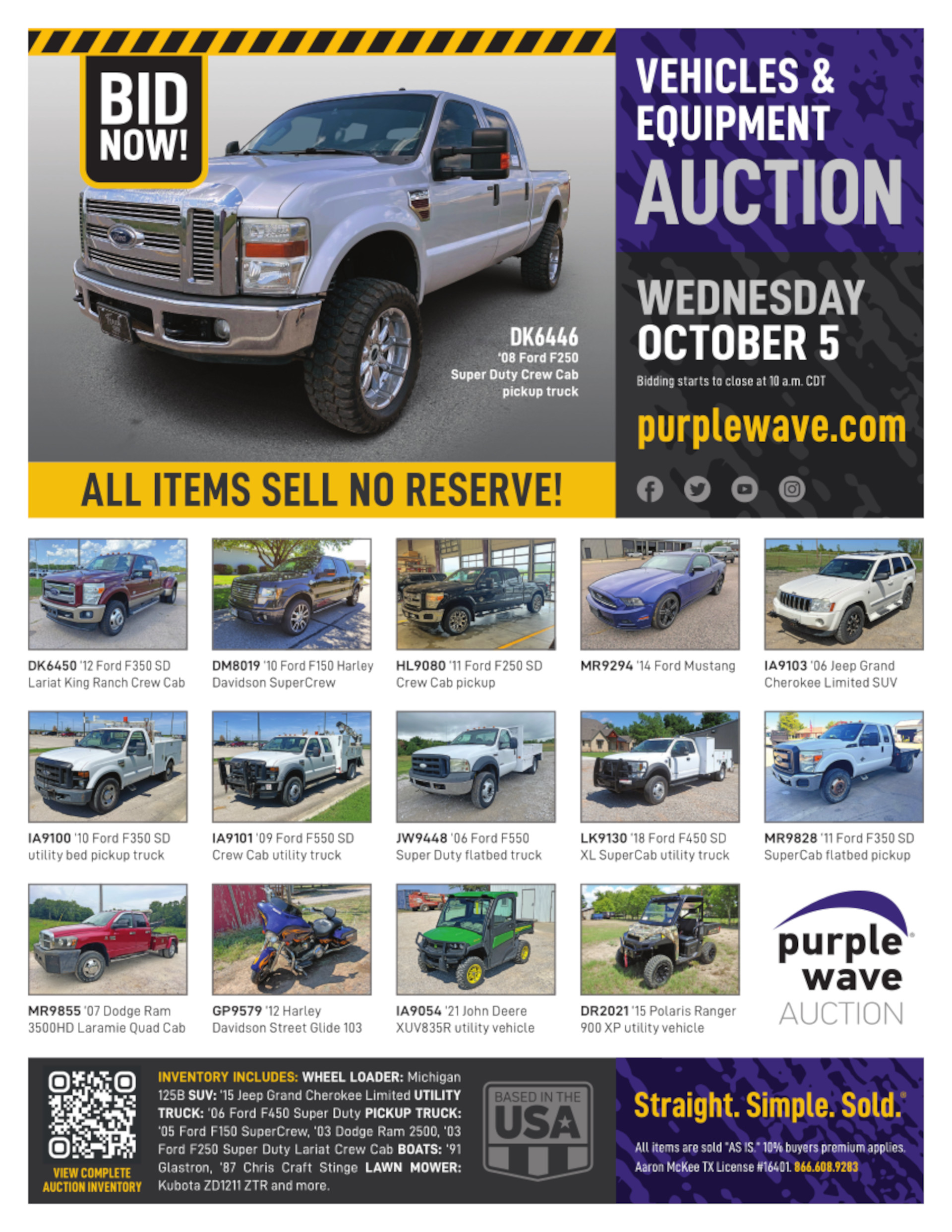 This auction is conducted by Purple Wave, Inc., whose home office is 825 Levee Drive, Manhattan, Kansas. Aaron McKee, Texas auctioneer license # 16401, operates Purple Wave, Inc. Complaints against us may be directed to the Texas Department of Licensing and Regulation, P.O. Box 12157, Austin, Texas 78711, (512) 463-6599. For additional required information, see the attached document.
