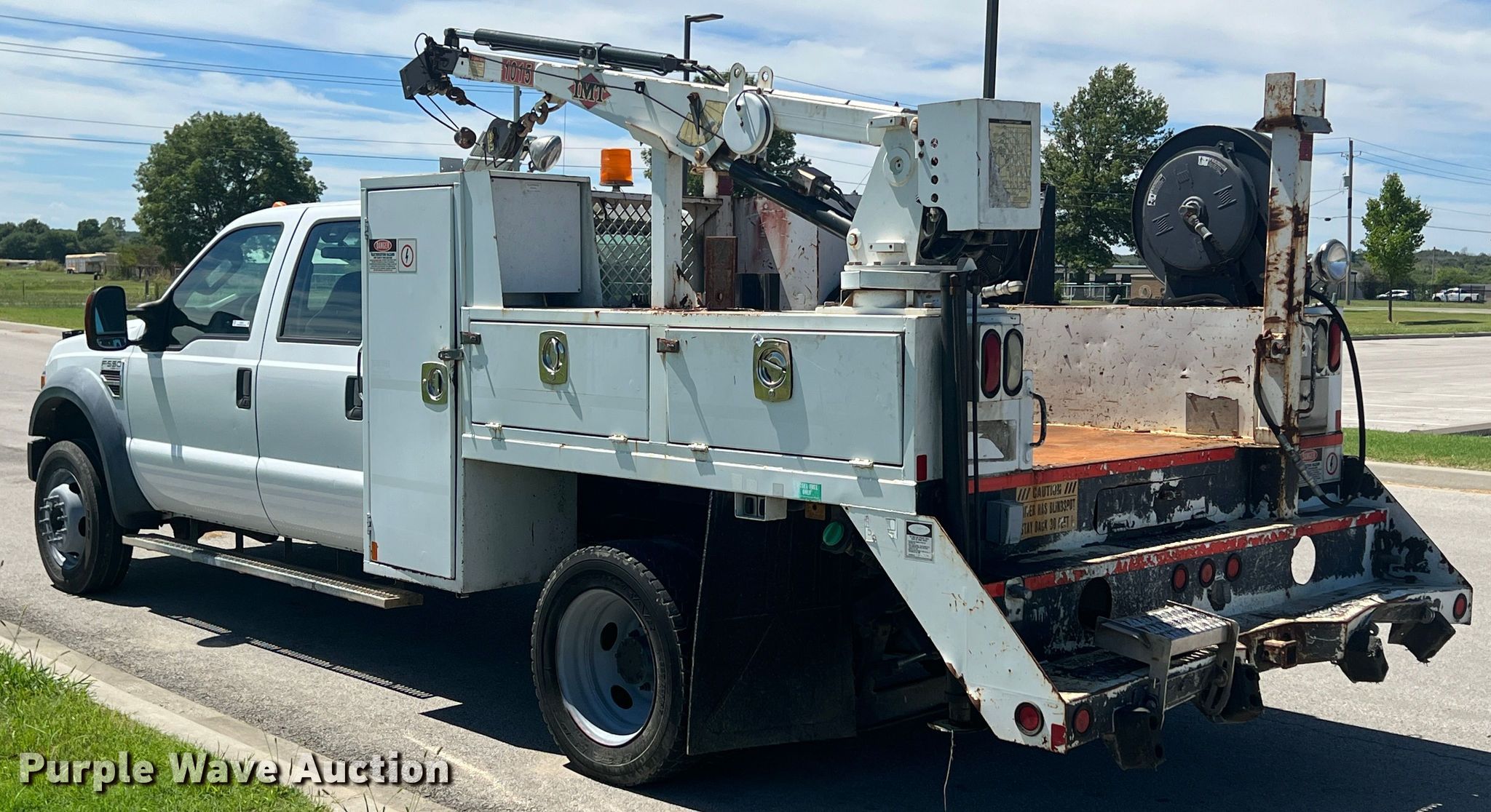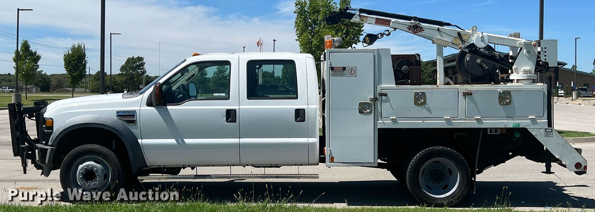 2009 Ford F550 Super Duty Crew Cab utility / service truck. Miles: 129,694 on odometer, VIN: 1FDAW56R49EA24156. Engine Displacement: 6.4L V8 OHV, Cylinders: 8, Fuel type: Diesel. Transmission Automatic. Chassis Axles: Single, Suspension: Spring, Brakes: Hydraulic, GVWR: 19,500 lbs, Wheelbase: 176". Interior AC, Heat, Cruise control, Auxiliary controls. Features Bed 8' 6" L x 7' 9" W, Crane IMT 1015, Boom length: 16', Maximum lift capacity: 3,200 lbs. Tires Size: 225/70R19.5. Nebraska title. Seller is an Oklahoma licensed motor vehicle dealer. Title will be assigned and distributed by the dealer. Please contact the seller for distribution questions. 398522 W 3500 Road. Ramona, OK 74061