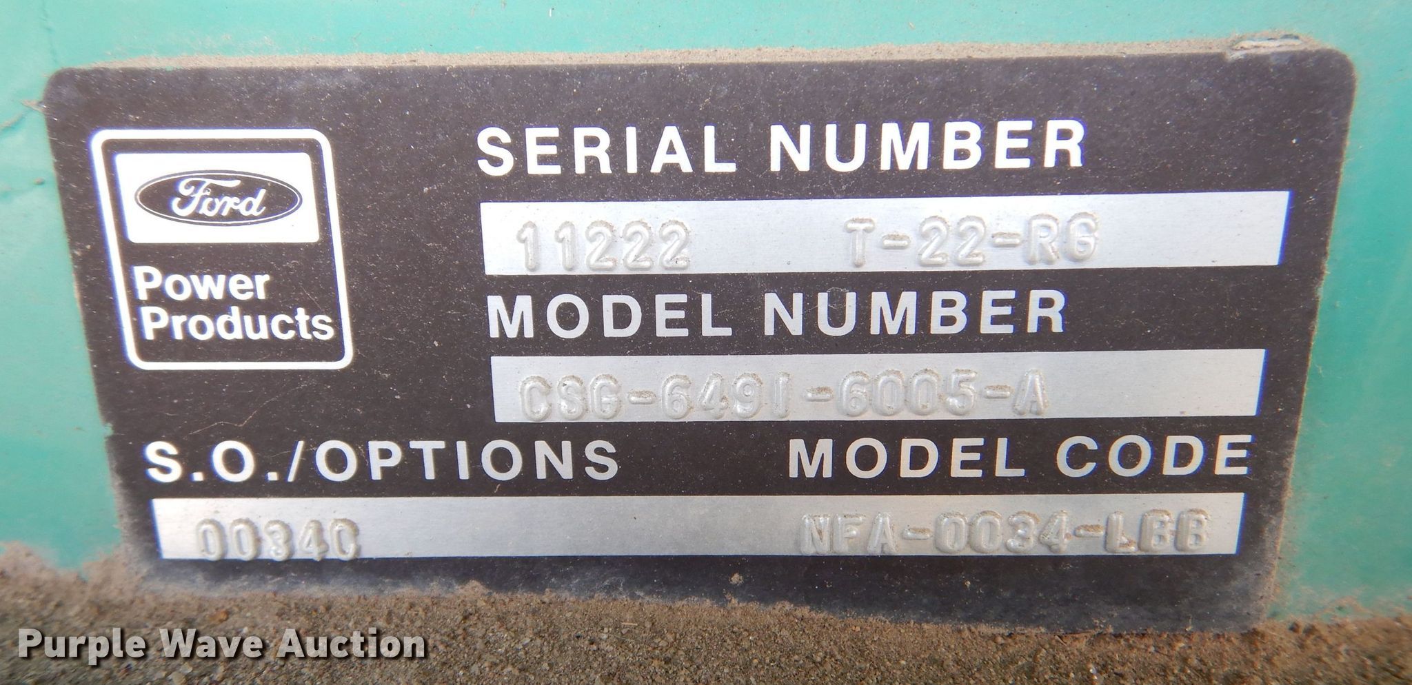 Onan 35EK-L generator. Hours: 133 on meter, Serial: I910424074. Engine Ford CSG-6491-6005-A, Cylinders: 6, Fuel type: Natural gas. Features kVA: 44, kW: 35, Phase: Single, Three, Electric start, Skid mounted. Notes Non-operational unit. United Telephone Association. Dodge City, KS 67801