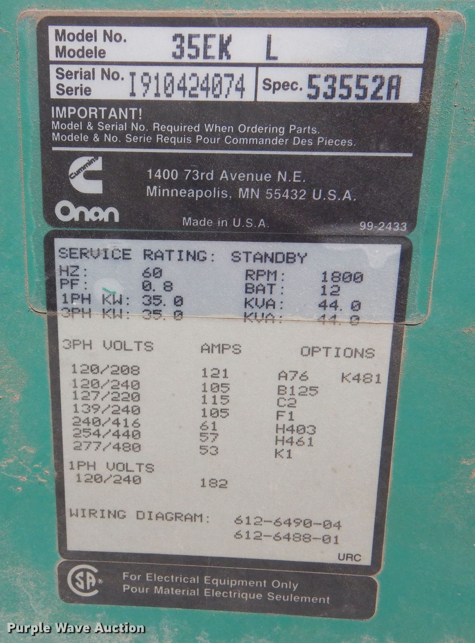 Purple Wave is selling a used Generator Set in Kansas. This item is a Onan 35EK-L generator with the following: Hours: 133 on meter, Serial: I910424074