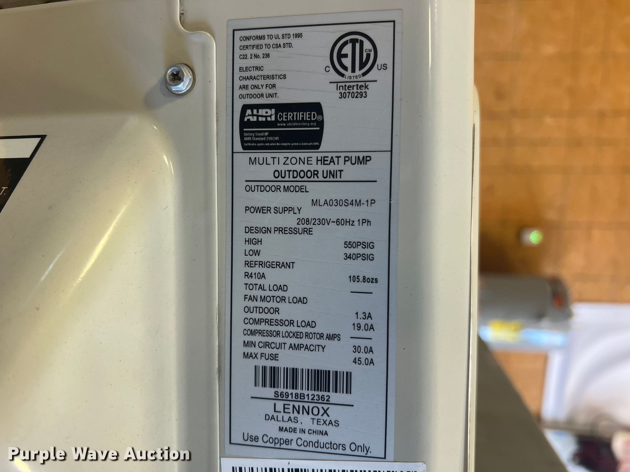 Purple Wave is selling a used Appliances in Missouri. This item is a (4) Lennox heat pumps with the following: (3) Lennox MWMA009S4-3P High Wall indoor, 208/230 V, Single phase, Lennox MLA030S4M-1P Multi Zone outdoor, 208/230 V, Single phase