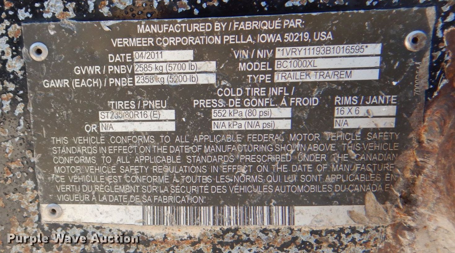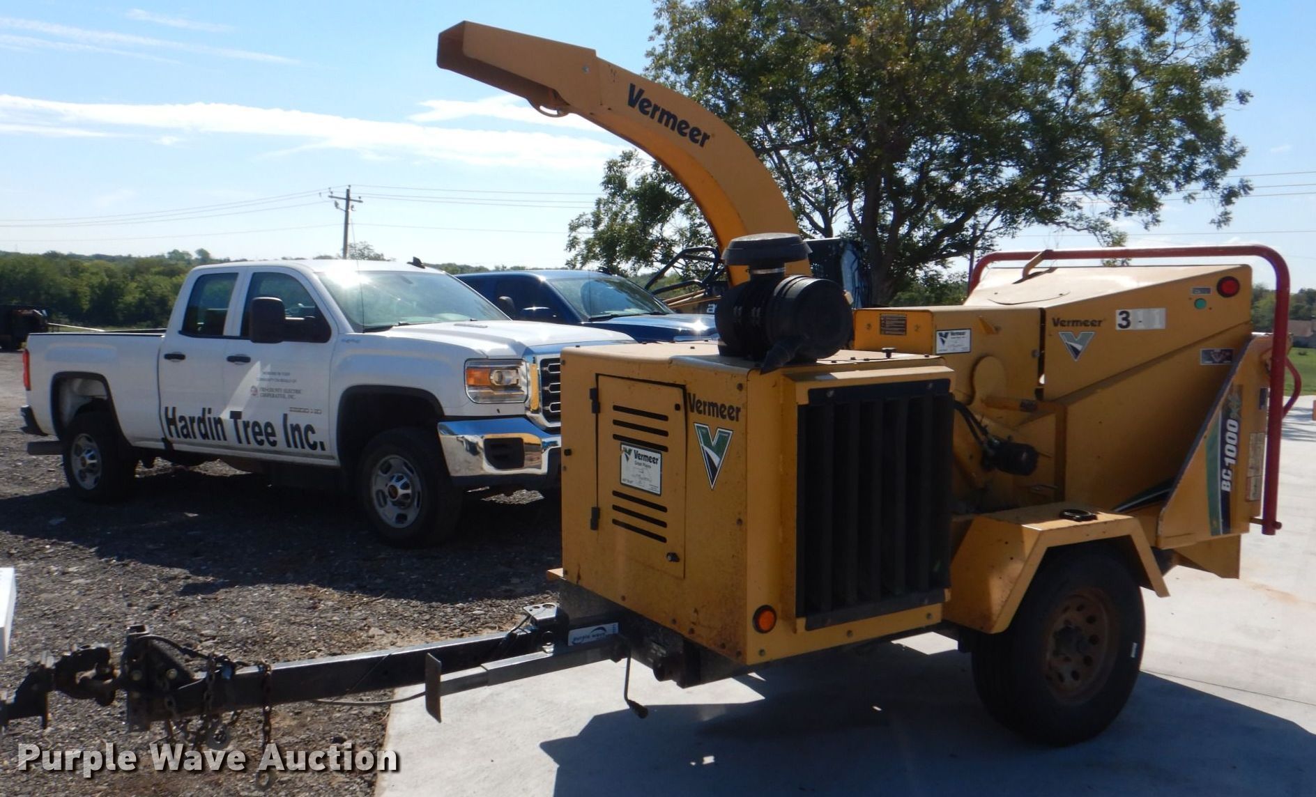2011 Vermeer BC1000XL wood chipper. Hours: 4,436 on meter, VIN: 1VRY11193B1016595. Engine Cummins, Displacement: 3.3L, Cylinders: 4, Fuel type: Diesel. Features Throat opening: 17" x 12". Trailer Brakes: Electric, Axles: Single, Tire size: 235/80R.16, GVWR: 5,700 lbs, GAWR: 5,200 lbs. This is worksite support equipment and will not come with a title. Transfer of ownership documentation will be a bill of sale. Hardin Tree Inc.. 1700 South Stewart Street. Azle, TX 76020