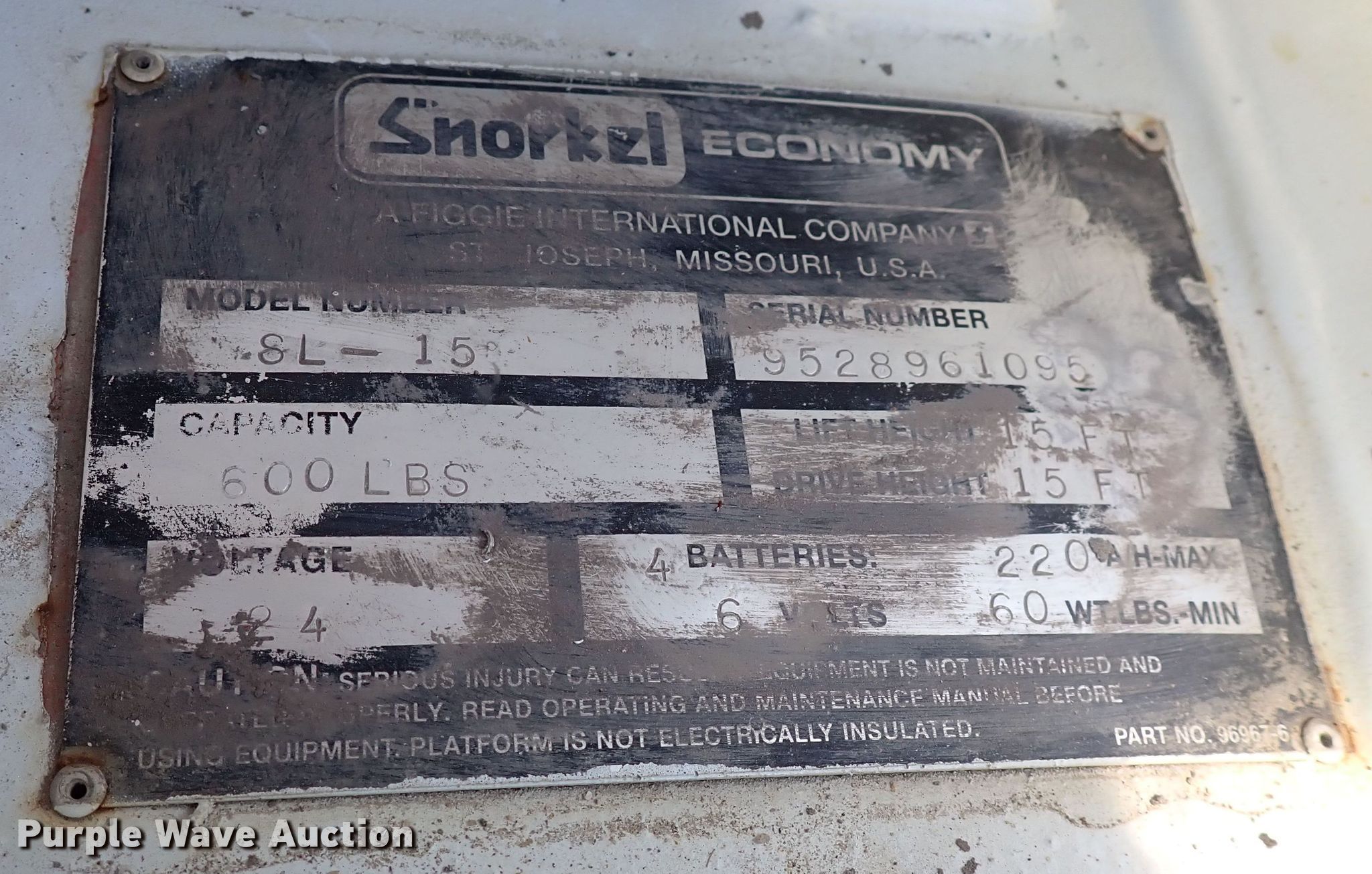 Purple Wave is selling a used Scissor or Vertical Lift in Kansas. This item is a 1995 Snorkel 8L-15 scissor lift with the following: Serial: 9528961095