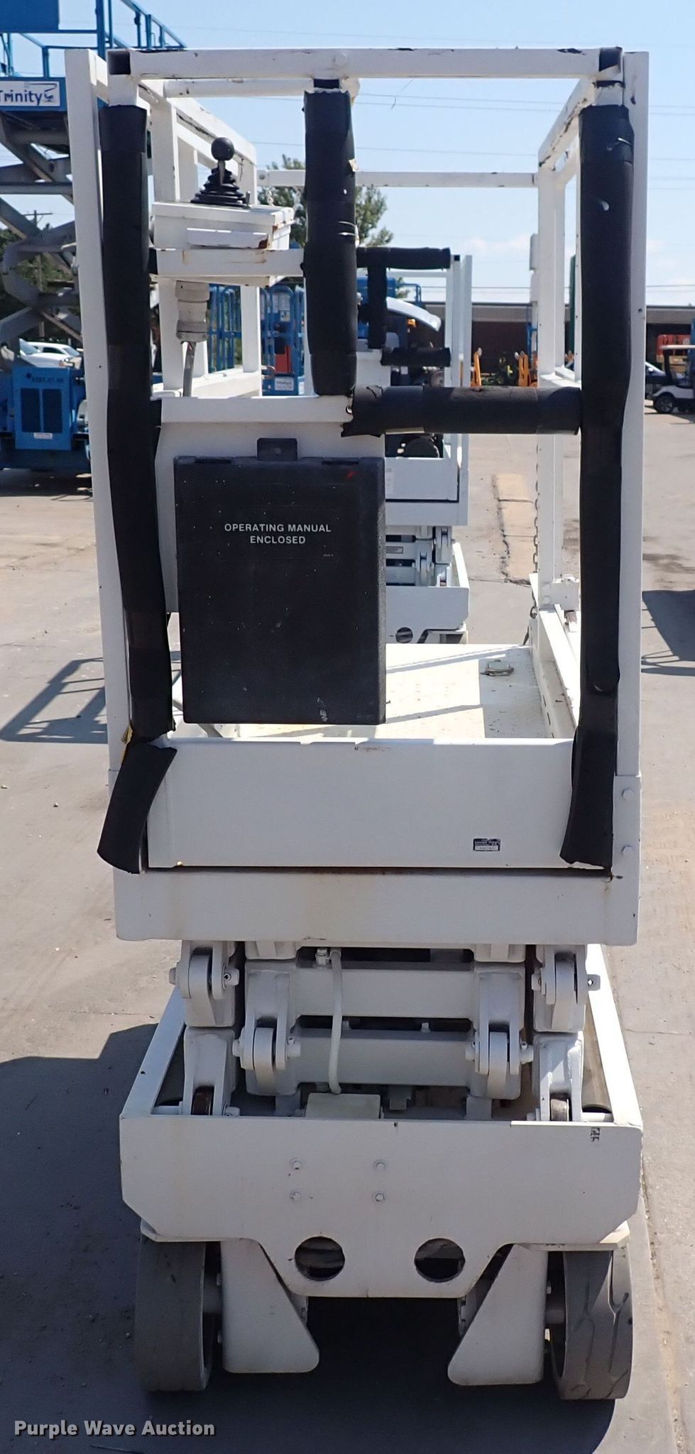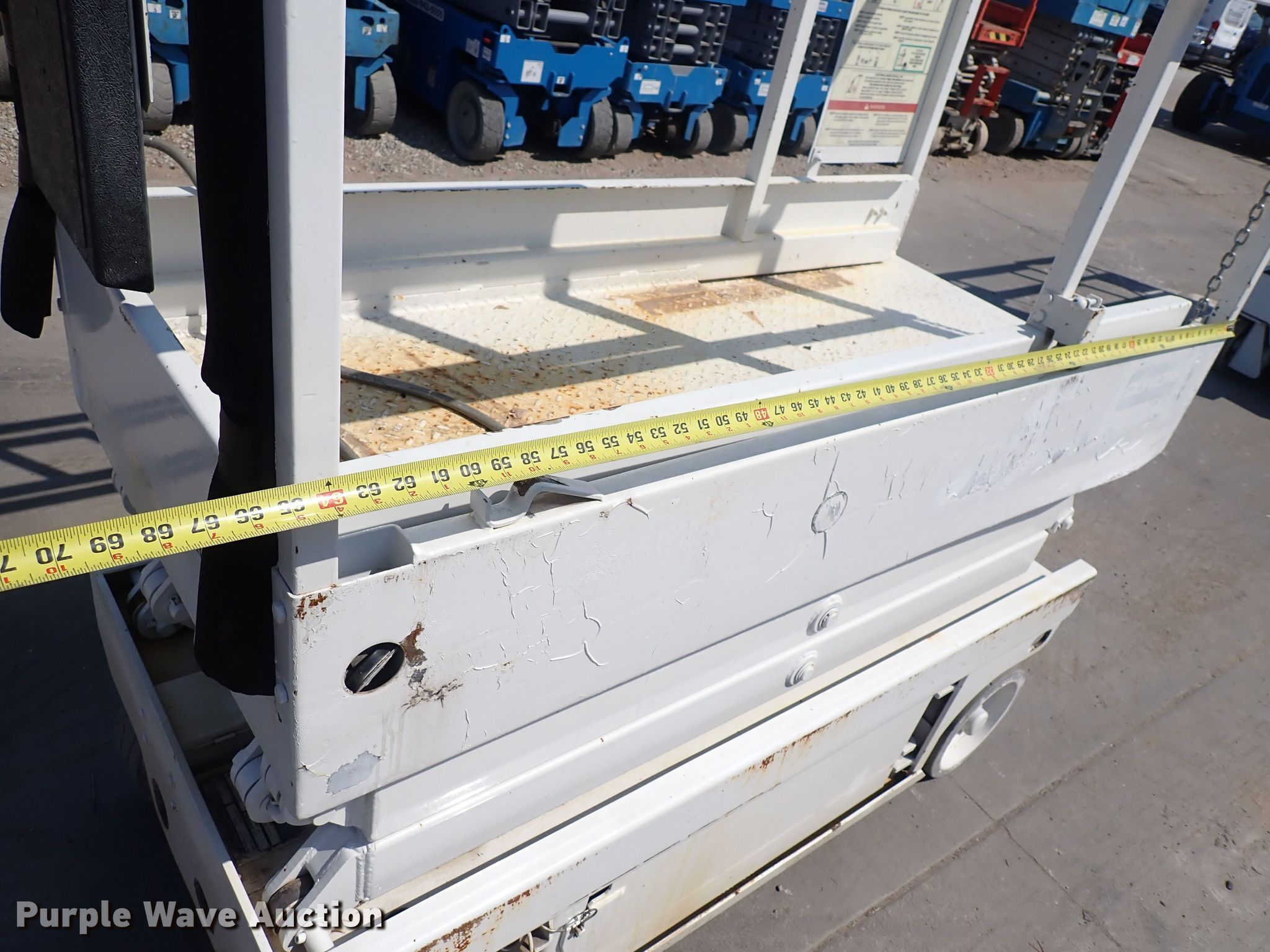 Snorkel scissor lift. Hours: 402 on meter. Electric Motor Volts: 24. Features Maximum lift capacity: 600 lbs, Maximum lift height: 15', Platform: 64" L x 29" W, Controls: Platform, Ground, Platform extensions: Manual. Tires Tire size: 12x4, Solid. Trinity Sales. 2225 S. West Street. Wichita, KS 67213