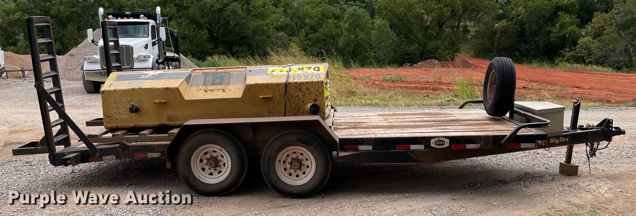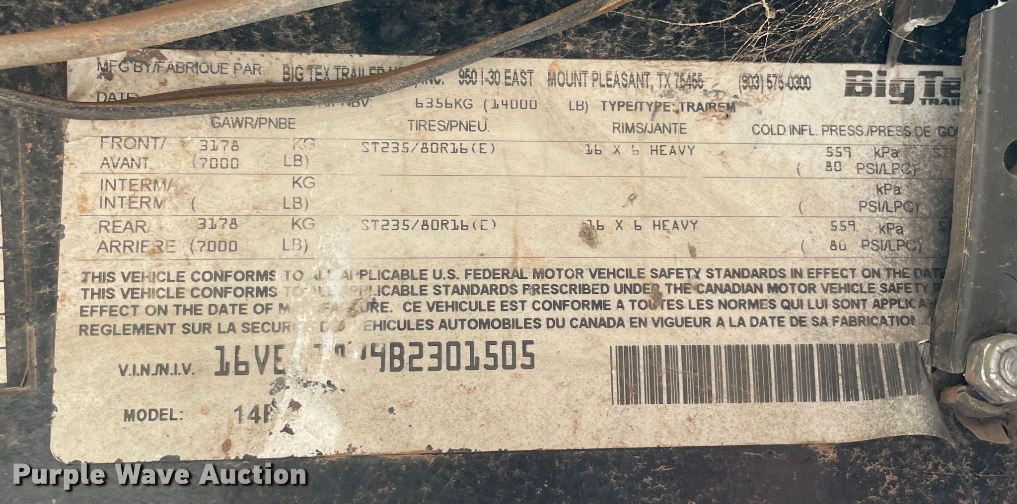 2011 Big Tex 14ET equipment trailer. VIN: 16VEX1829B2301505. Dimensions Overall: 23' L x 102" W, Deck: 15' 6" L x 84" W, Tail length: 2' 6", Ramps: Manual Length: 5'. Features Deck type: Wood. Chassis Ball hitch: 2 5/16", Landing gear: Single, Suspension: Spring, Brakes: Electric, Axles: Tandem, GVWR: 14,000 lbs, GAWR: 7,000 lbs. Tires Size: ST235/80R16. Notes Contents not included. Transfer of ownership documentation will be a bill of sale. SWH Construction. 468 SW 24th Ave. Goldsby, OK 73093
