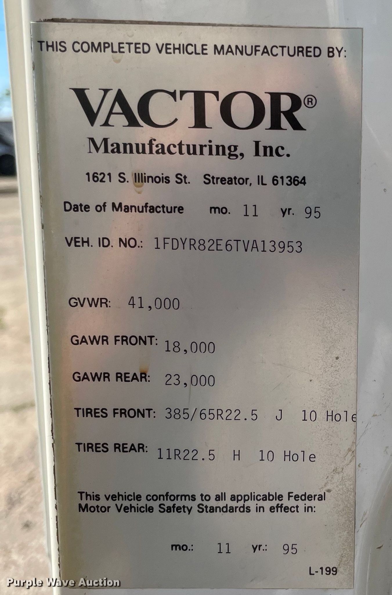1996 Ford LN8000 sewer jetter truck. Miles: 12,379 on odometer, Hours: 4,309 on meter, VIN: 1FDYR82E6TVA13953. Engine Cummins, Displacement: 8.3L, Cylinders: 6, Fuel type: Diesel. Transmission Automatic. Chassis Axles: Single, Suspension: Spring, Brakes: Air, PTO, GVWR: 41,000 lbs, Wheelbase: 222". Interior Heat. Features Tank bed 1995 Vactor 2110-C4, Serial: 95-125673, Capacity: 1,000 gallons, Rear outlet: 6", Engine Cummins, Cylinders: 4, Fuel type: Diesel, Water pump Vactor, PSI: 2000, GPM: 60, Vacuum pump Single Stage, Hose reel Front, Diameter: 1", Length: 600', Telescopic boom Diameter: 8", Remote control, Cold weather recirculatory system. Tires Front: 385/65R22.5, Rear: 11R22.5. Illinois title. Mileage has not been verified. Exempt will be written in the odometer disclosure on the title. Key Equipment. Springfield, IL 62702