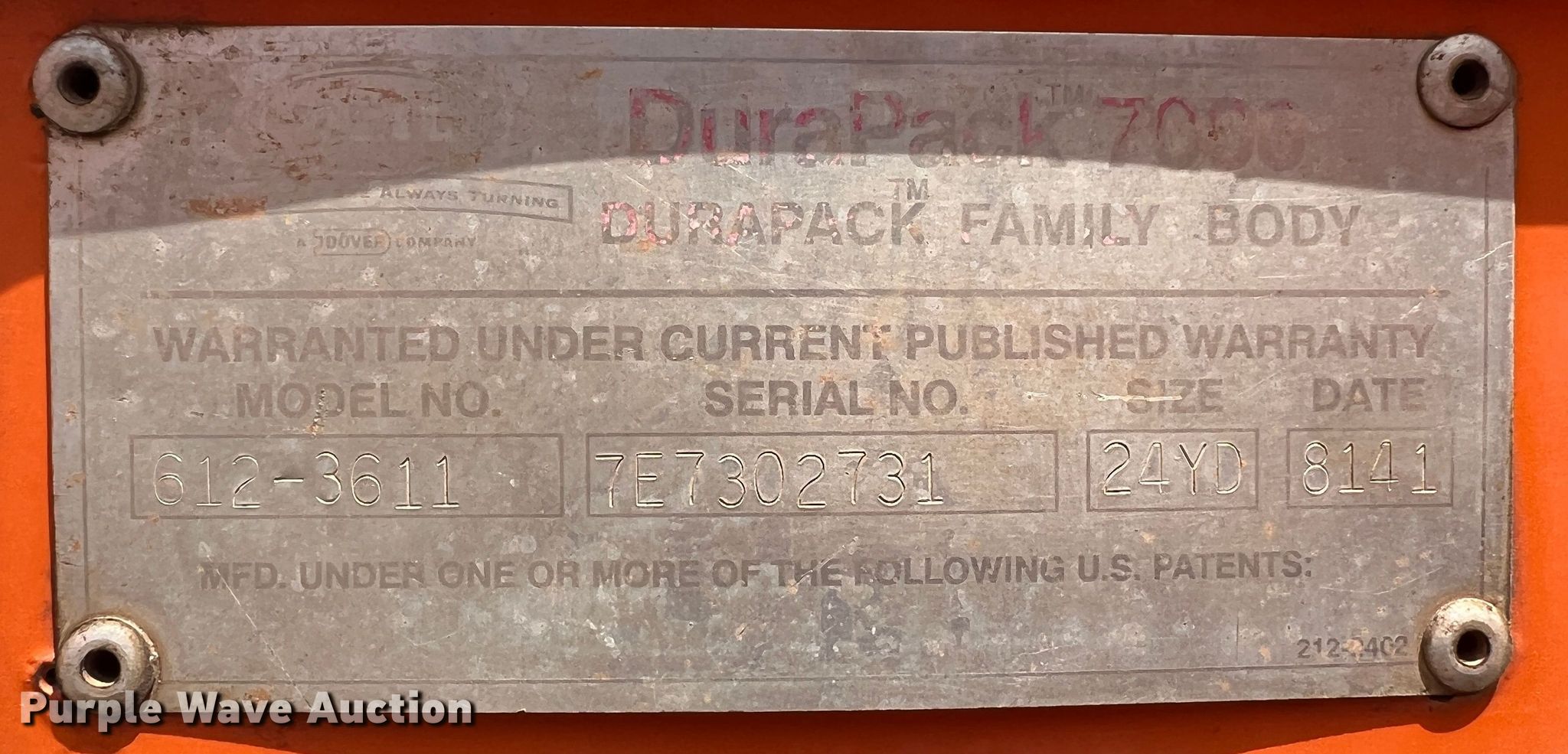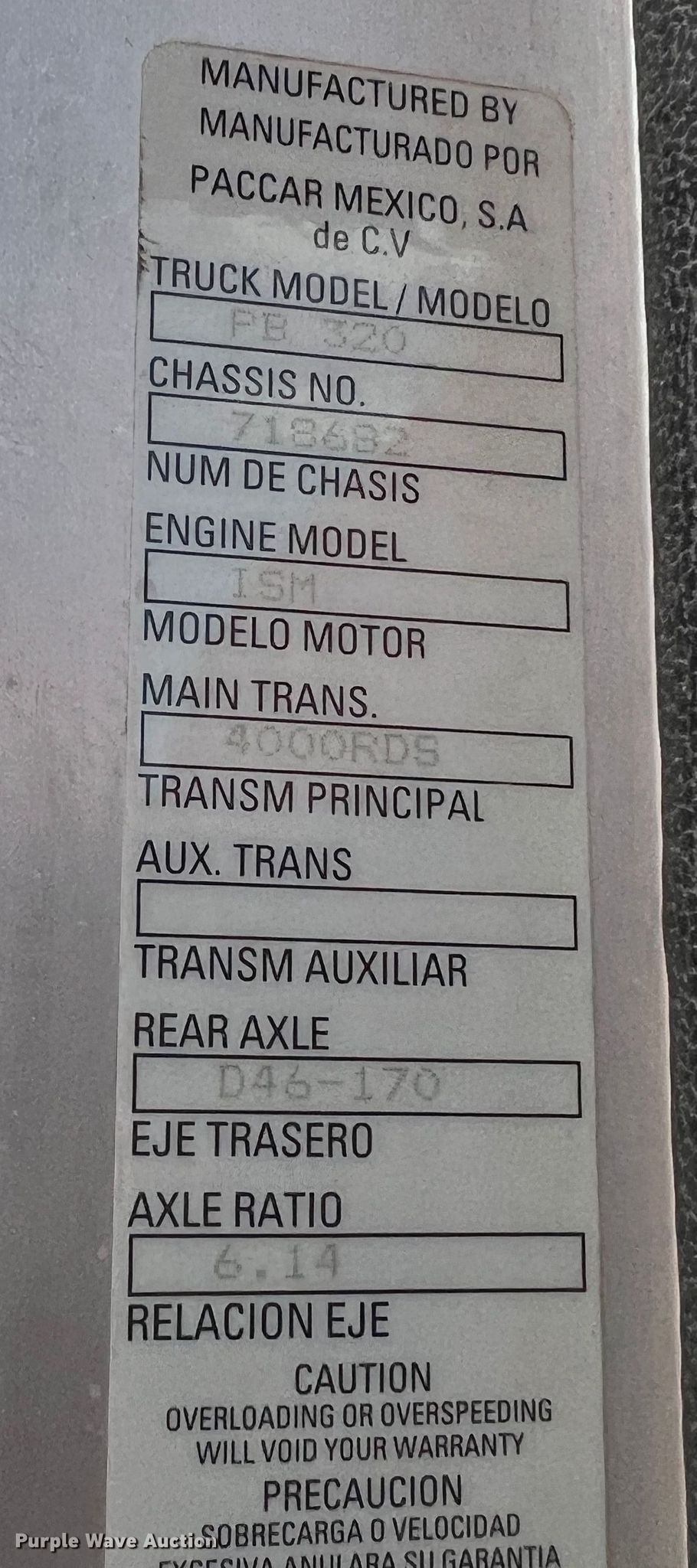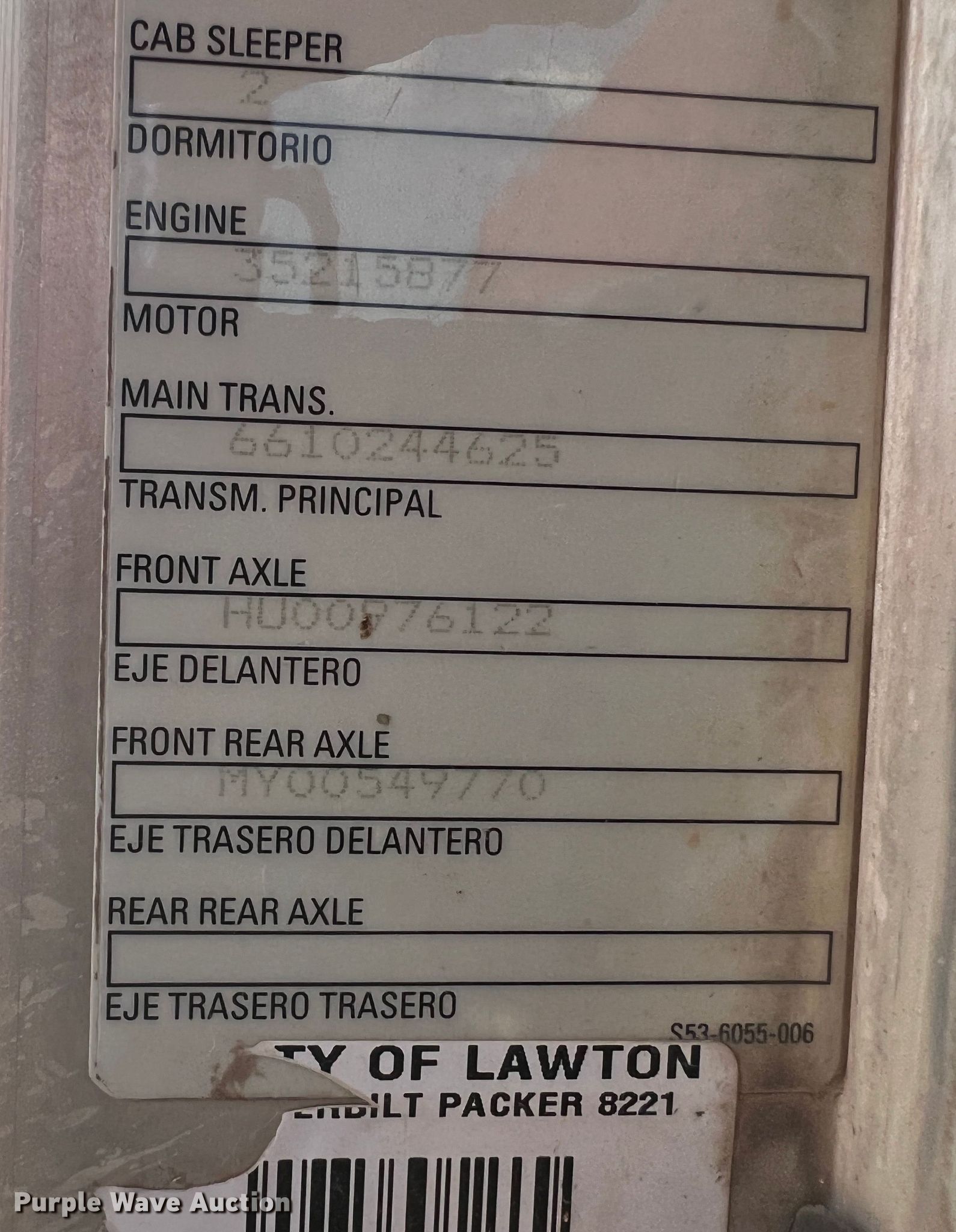 2009 Peterbilt 320 refuse truck. Miles: 94,396 on odometer, VIN: 3BPZL00XX9F718682, Unit #: 8221. Engine Cummins ISM, Displacement: 10.8L, Cylinders: 6, Fuel type: Diesel. Transmission Allison, Automatic. Chassis Axles: Tandem, Suspension: Walking beam, Brakes: Air, PTO. Interior AC, Heat, Cruise control, Backup camera. Features Refuse bed Heil 612-3611, Serial: 7E7302731, Capacity: 24 cu.yd., Load: Side, Cart tipper. Tires Front: 315/80R22.5, Rear: 11R22.5. Notes Dead battery, Unknown operating condition. Oklahoma title. Seller is a government entity who will be assigning and distributing the title. Please contact the seller for distribution questions. City of Lawton, OK. 2215 SW 3rd St. Lawton, OK 73501