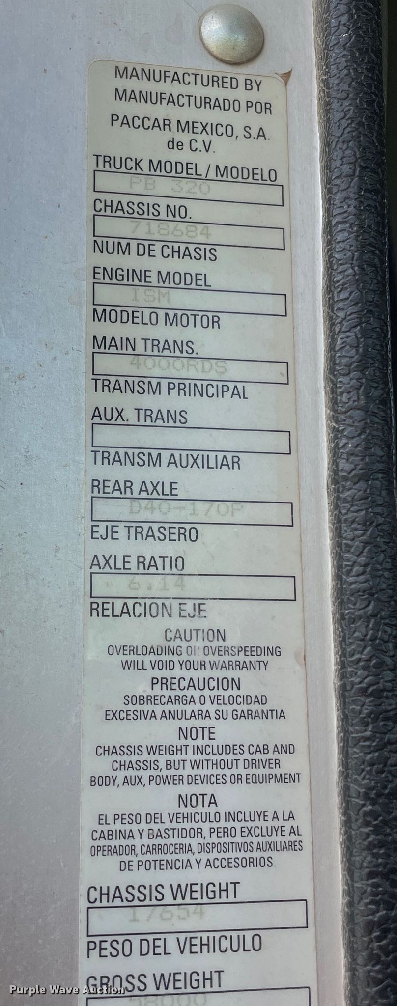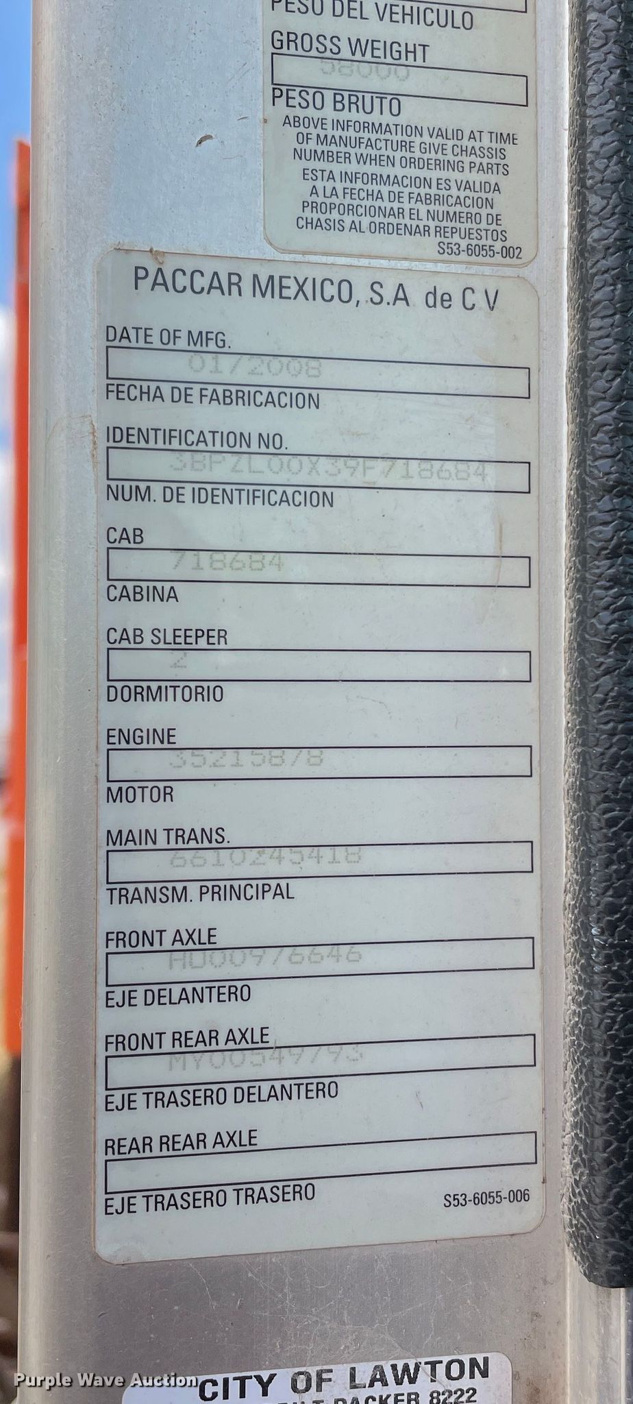2009 Peterbilt 320 refuse truck. Miles: 78,531 on odometer, VIN: 3BPZL00X39F718684, Unit #: 8222. Engine Cummins ISM, Serial: 35215878, Displacement: 10.8L, Cylinders: 6, Fuel type: Diesel, HP: 320. Transmission Allison, Automatic. Chassis Axles: Tandem, Suspension: Walking beam, Brakes: Air, PTO, GVWR: 58,000 lbs. Interior AC, Heat, Cruise control. Features Refuse bed Heil 612-3611, Serial: 7E7302749, Capacity: 24 cu.yd., Load: Side, Cart tipper. Tires Front: 315/80R22.5, Rear: 11R22.5. Notes Engine parts missing, Rear end gate missing, Non-operational unit. Oklahoma title. Seller is a government entity who will be assigning and distributing the title. Please contact the seller for distribution questions. City of Lawton, OK. 2215 SW 3rd St. Lawton, OK 73501