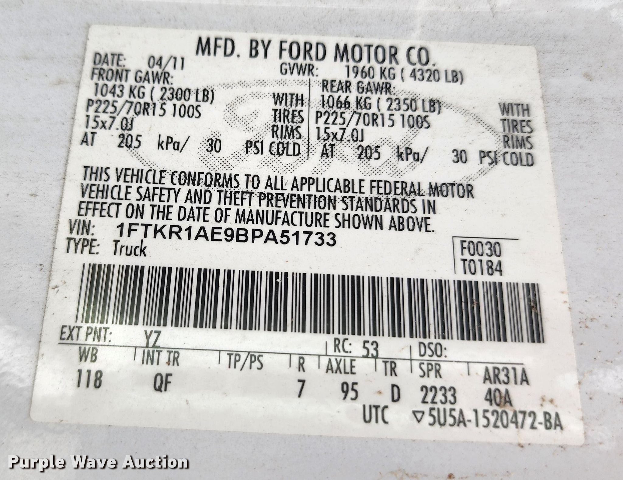 2011 Ford Ranger pickup truck. Miles: 56,571 on odometer, VIN: 1FTKR1AE9BPA51733. Engine Displacement: 4.0L V6 SOHC, Cylinders: 6, Fuel type: Gas. Transmission Automatic. Interior AC, Heat. Tires Size: 225/70R15. Missouri title. Raytown Parks Department. 5912 Lane Ave. Raytown, MO 64133