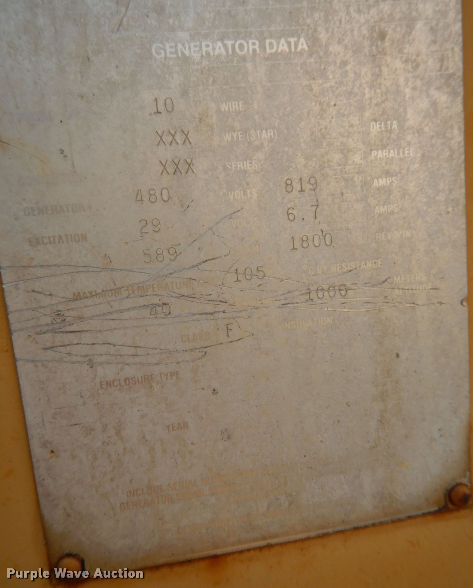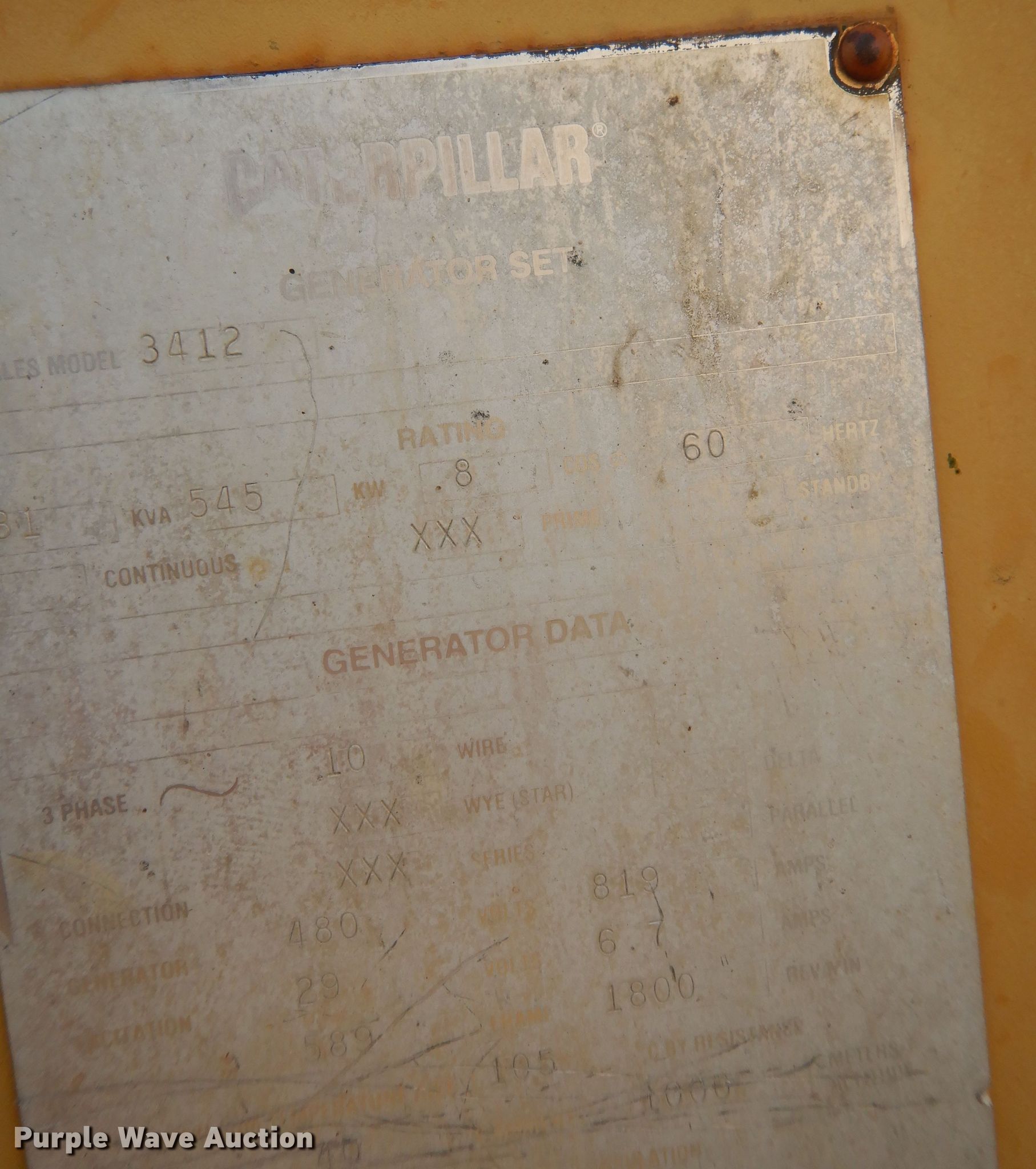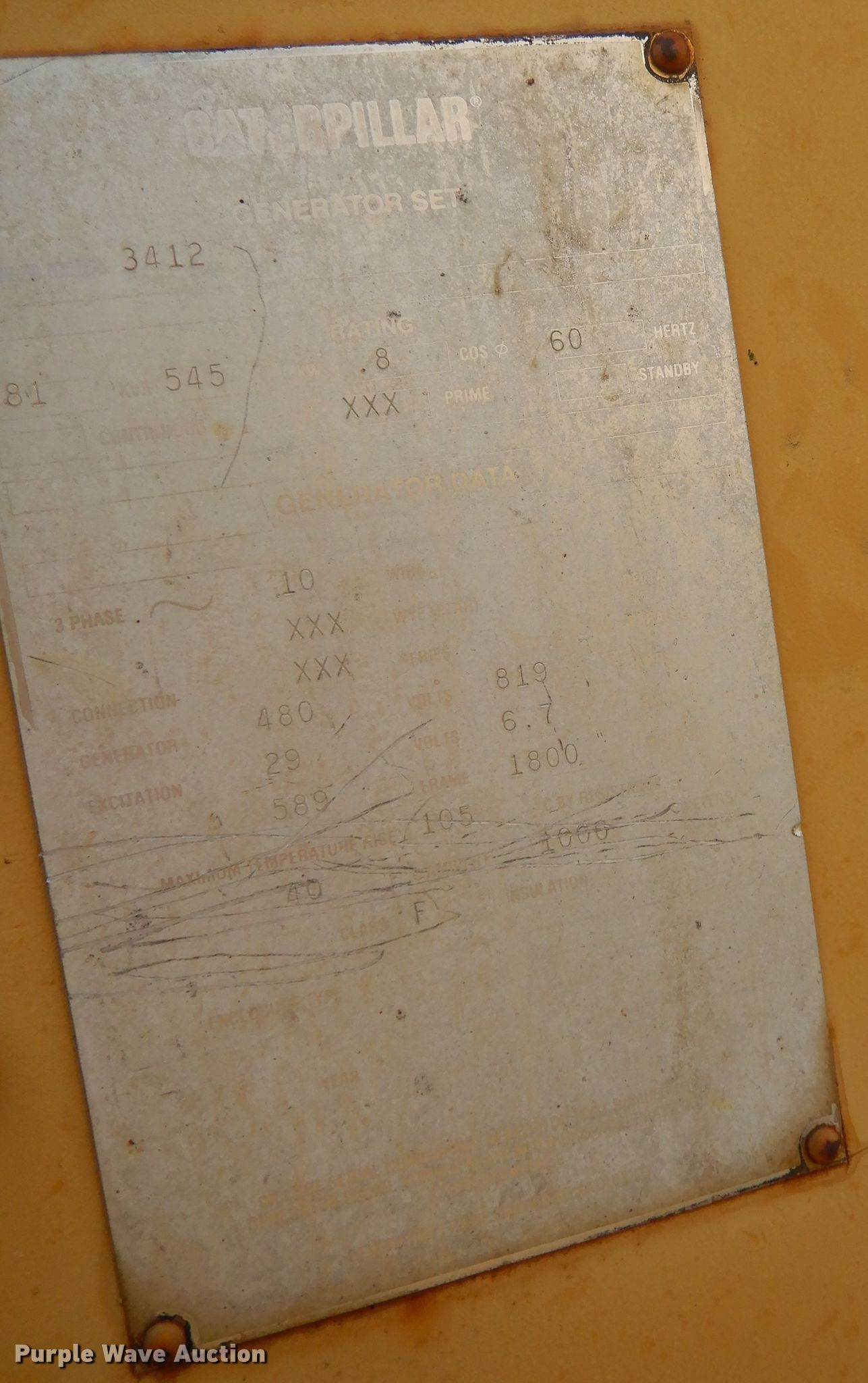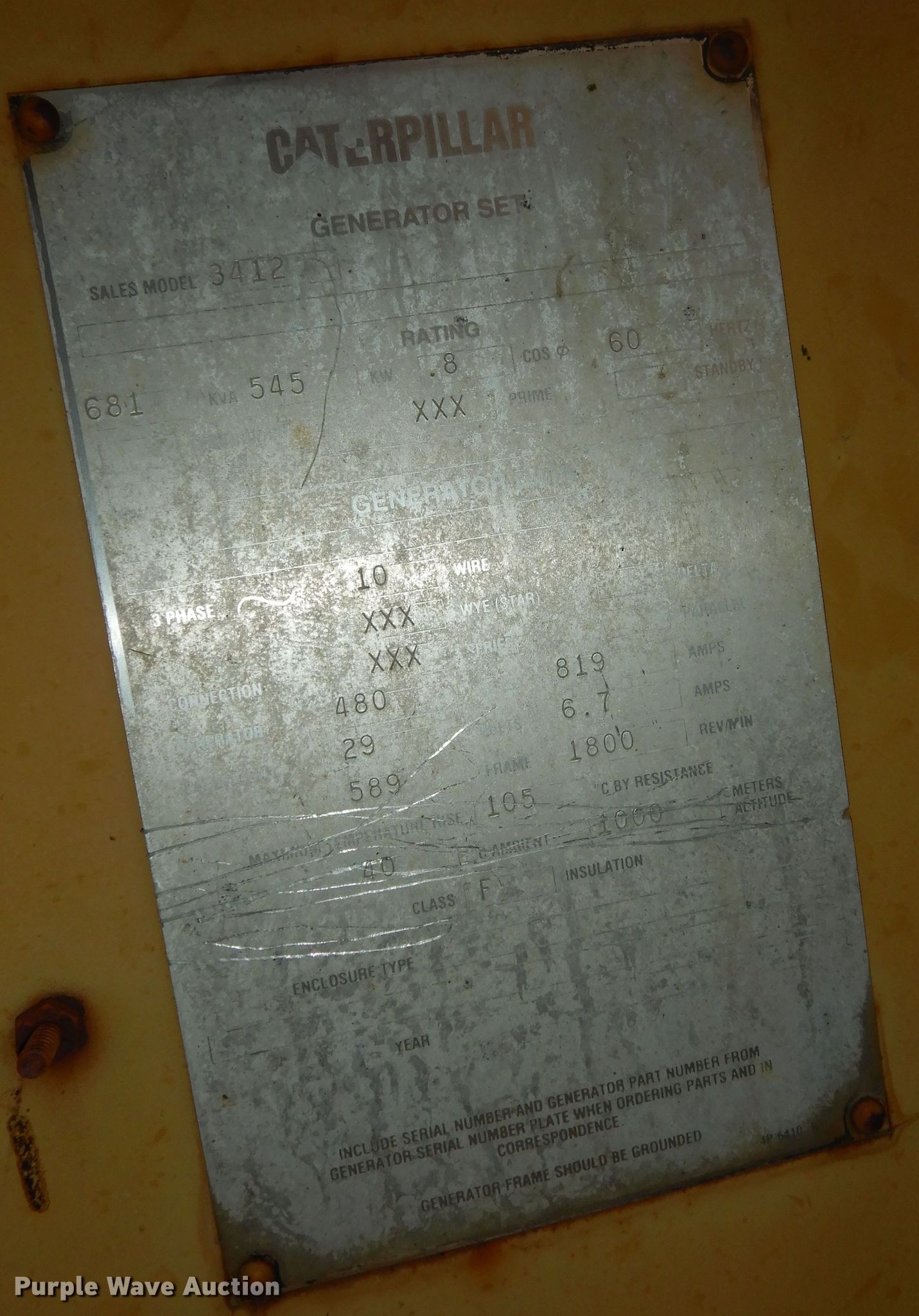 Caterpillar SR4 generator. Serial: 6FA10177. Engine Caterpillar 3412, Serial: 81Z19743, Cylinders: 12, Fuel type: Diesel. Features Generator kVA: 681, kW: 545, Phase: Three, Skid mounted. All aspects of disassembly and removal are the sole responsibility of the purchaser. City of Manhattan, KS. Manhattan, KS 66502