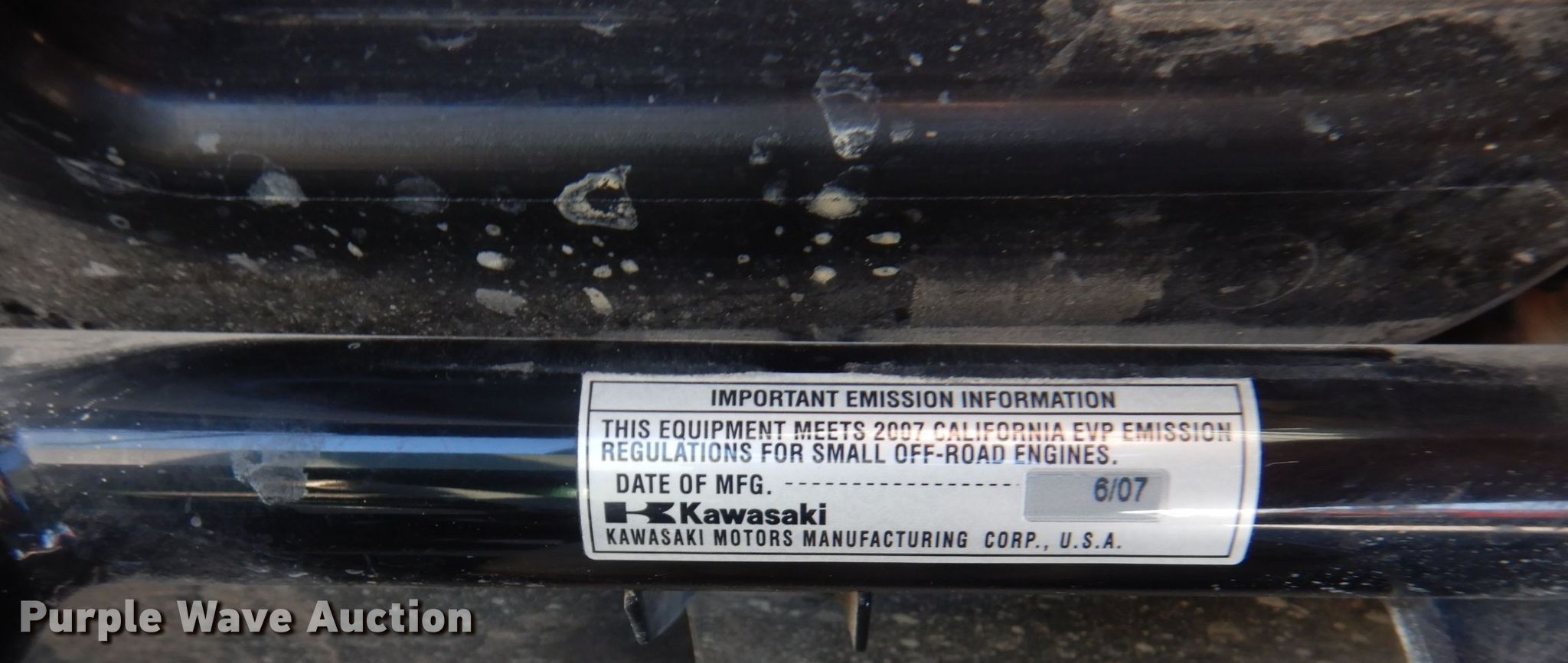 2007 Kawasaki Mule 610 utility vehicle. Hours: 302 on meter, VIN: JK1AFEA157B532618. Engine Kawasaki F400D, Displacement: 401 cc, Cylinders: 1, Fuel type: Gas, HP: 13, kW: 9.7, Electric start. Transmission Automatic. Chassis Four wheel drive. Operators station EROPS, Passengers: 3. Features Winch, Grill guard, Receiver hitch, Dump bed 37" L x 43" W, Dump bed type: Manual. Tires Front: 24x9.00-10, Rear: 24x11-10. Oklahoma title. Wagoner County Emergency Management. 16555 S 305th E Ave. Coweta, OK 74429