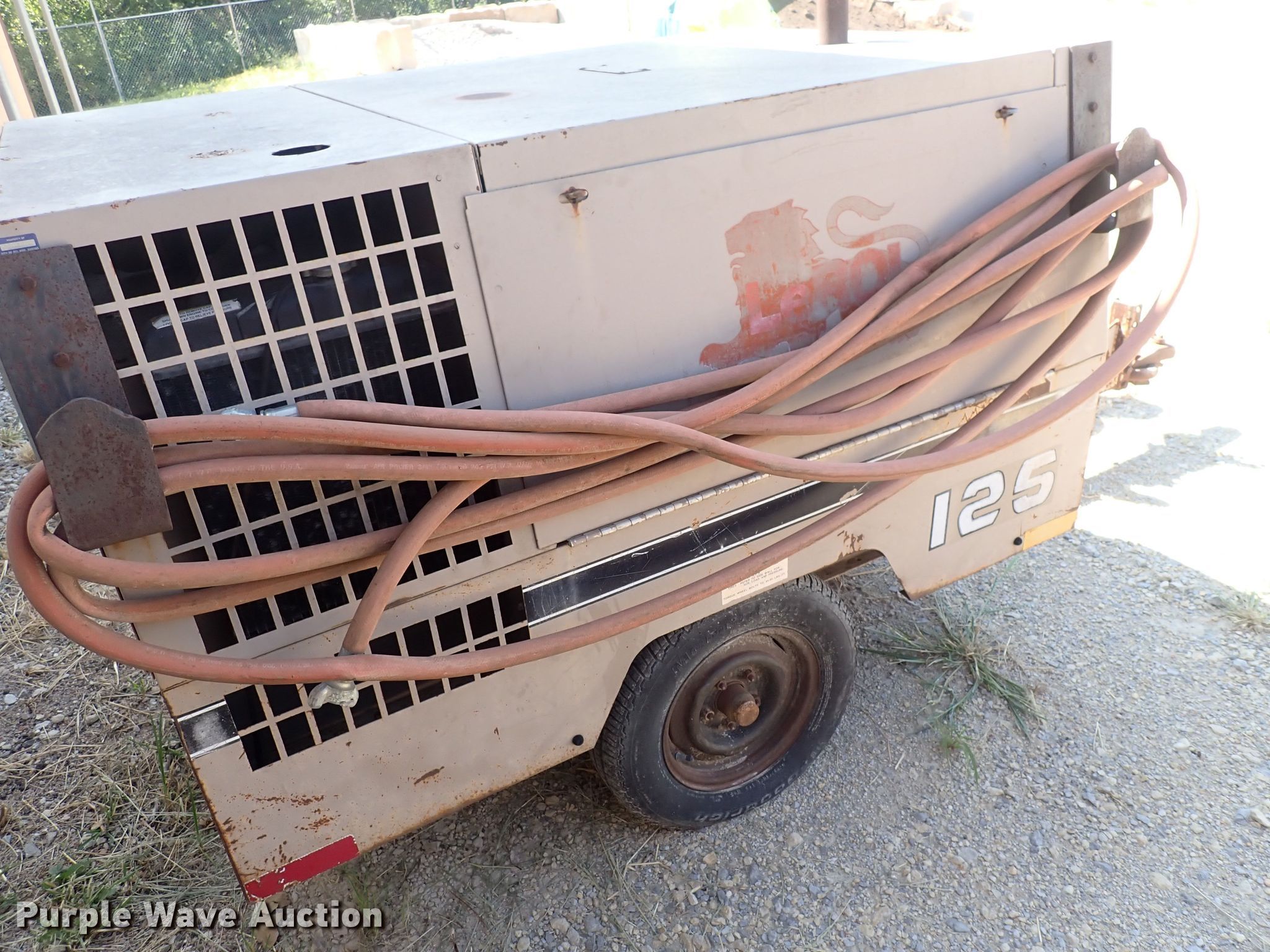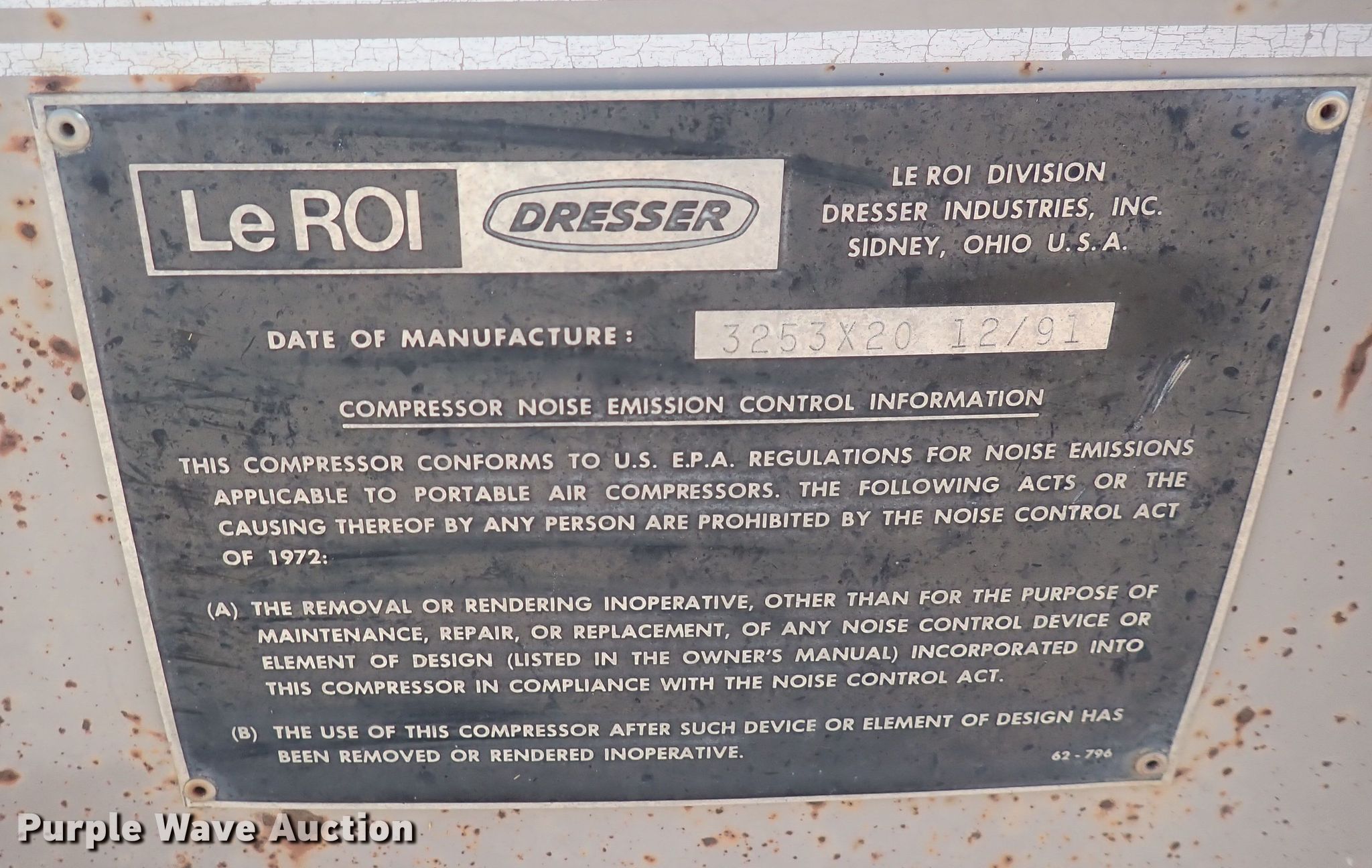 1991 Leroi 125 air compressor. Hours: 374 on meter. Engine John Deere, Cylinders: 3, Fuel type: Diesel. Features Air compressor CFM: 125. Trailer Ball hitch size: 2", Axles: Single, Tire size: 175/70R13. Notes No battery, Unknown operating condition. This is worksite support equipment and will not come with a title. Transfer of ownership documentation will be a bill of sale. Bel Aire Public Works. 4103 N Woodlawn Blvd. Bel Aire, KS 67220