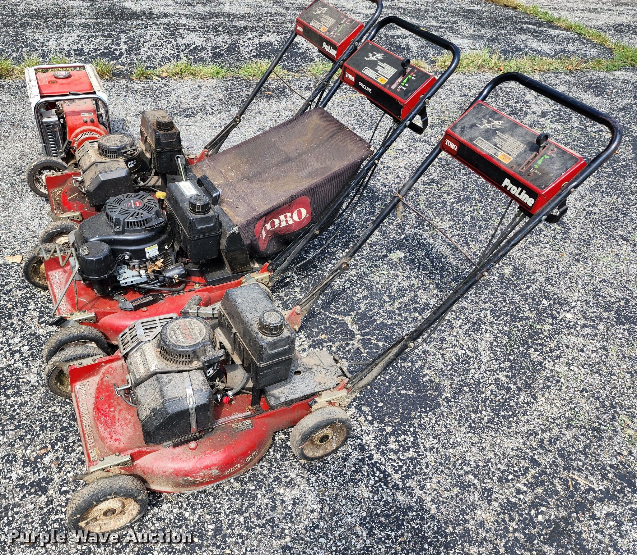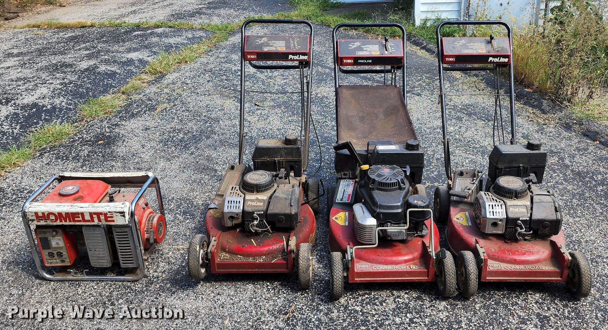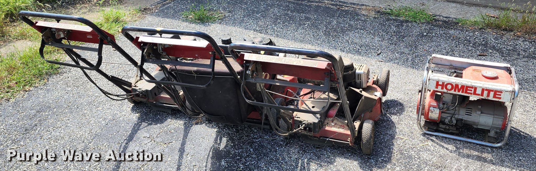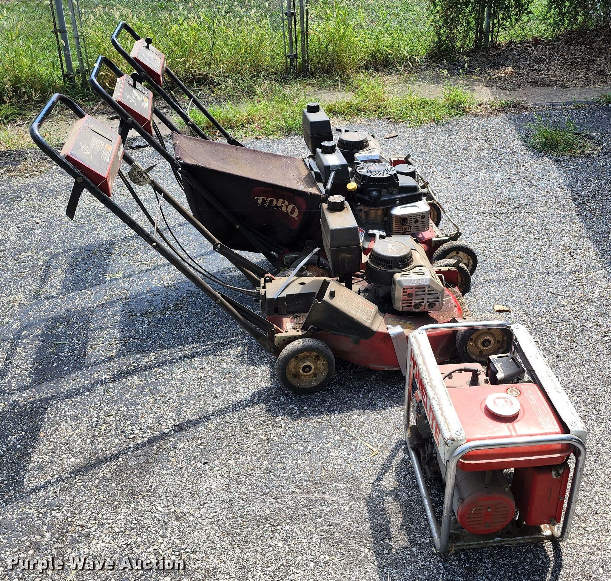 Purple Wave is selling a used Lawn and Garden in Missouri. This item is a Lawn and garden equipment with the following: (3) Toro push mowers, Gas engines, Homelite HG1400 generator, Gas engine, Dayton 3Z360G bandsaw, 115 V