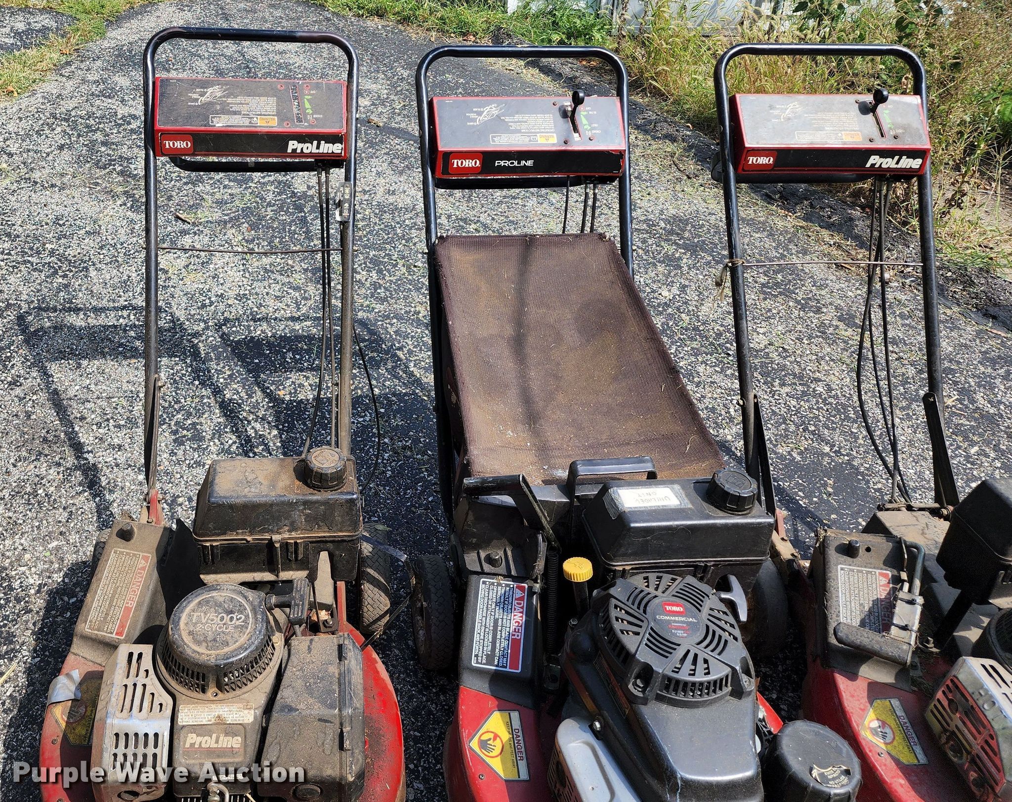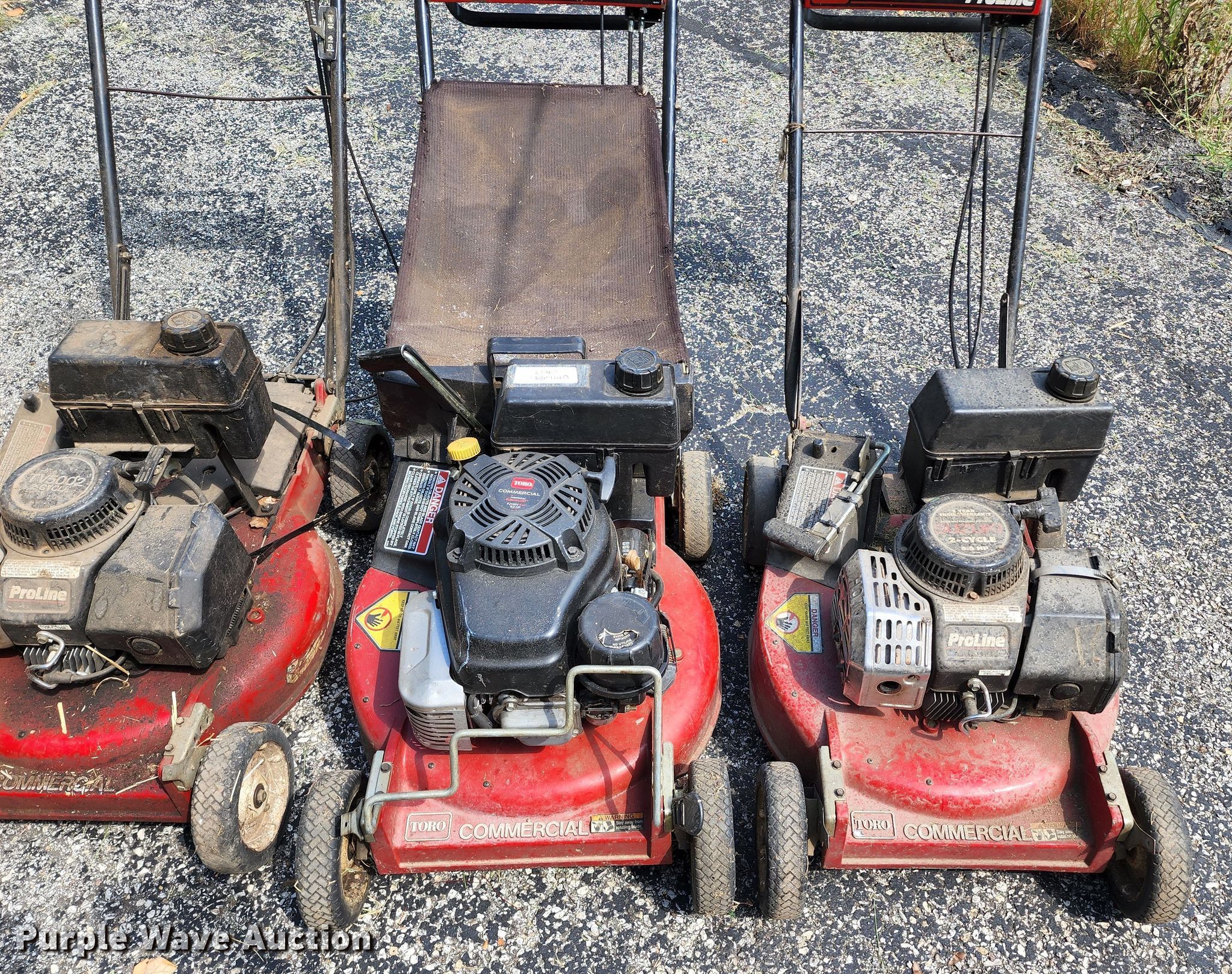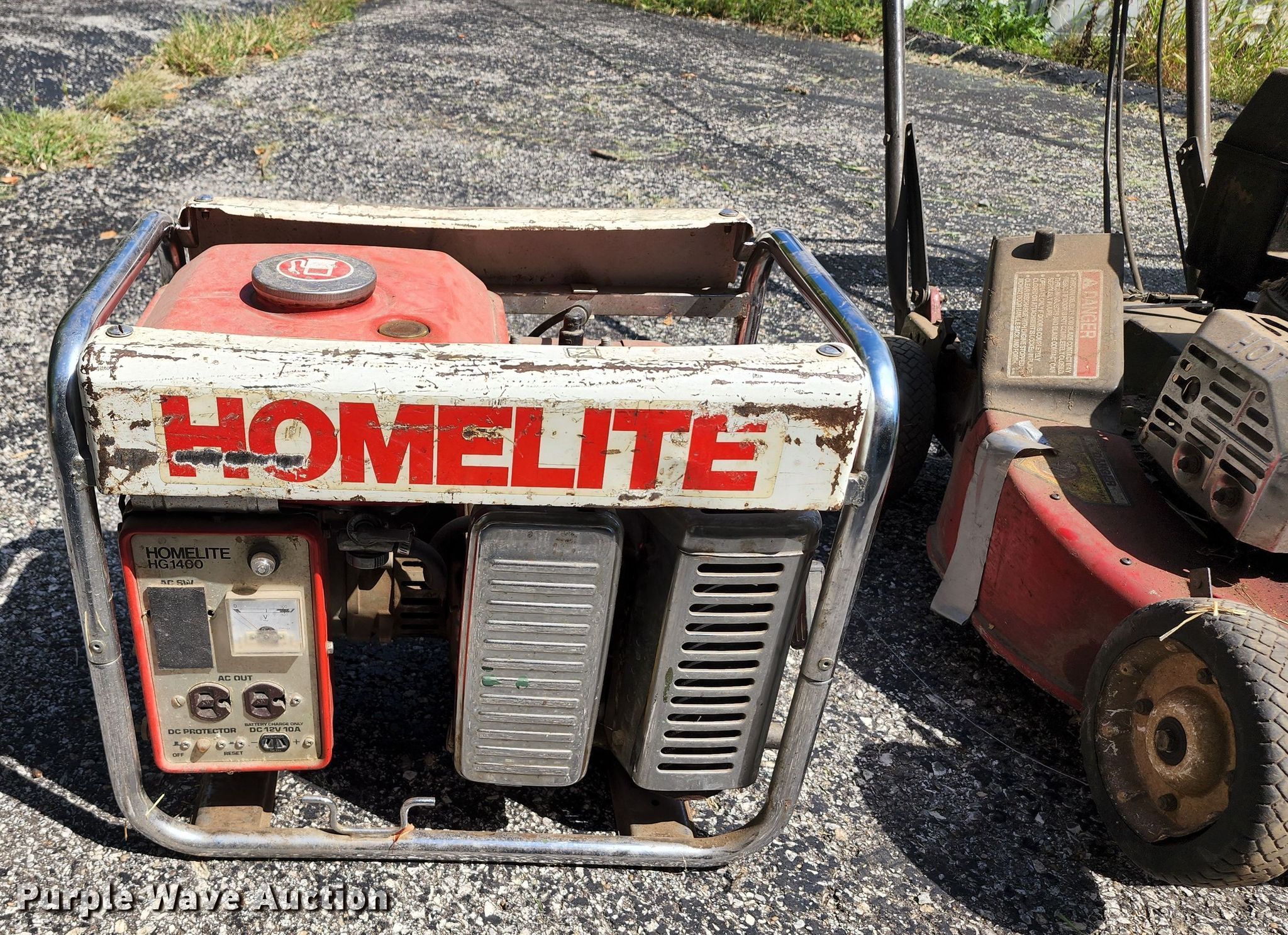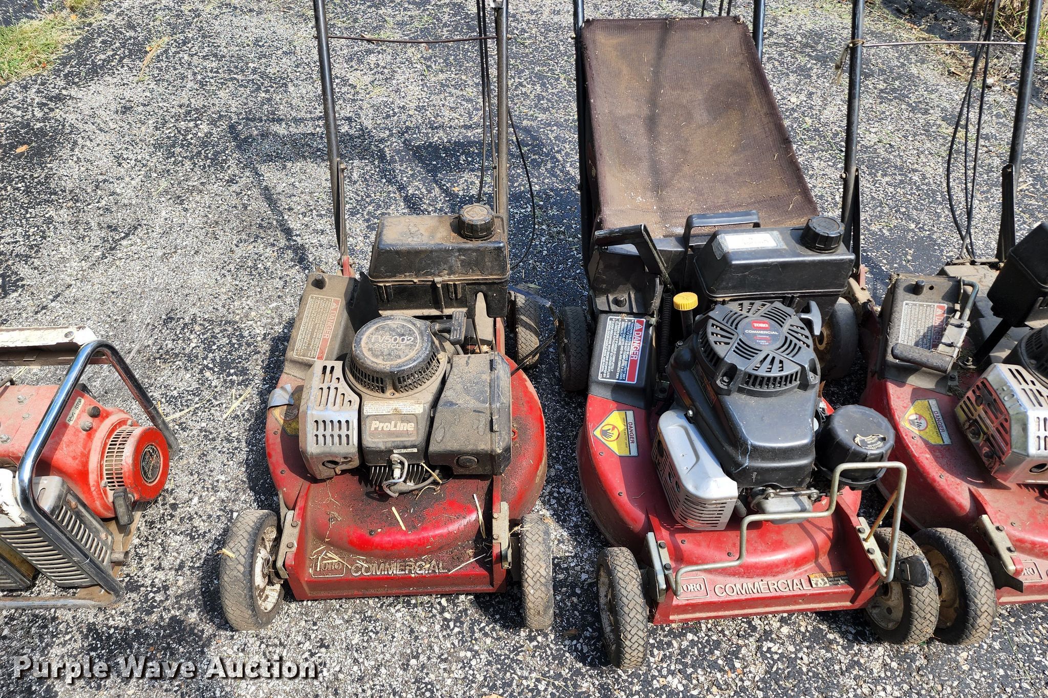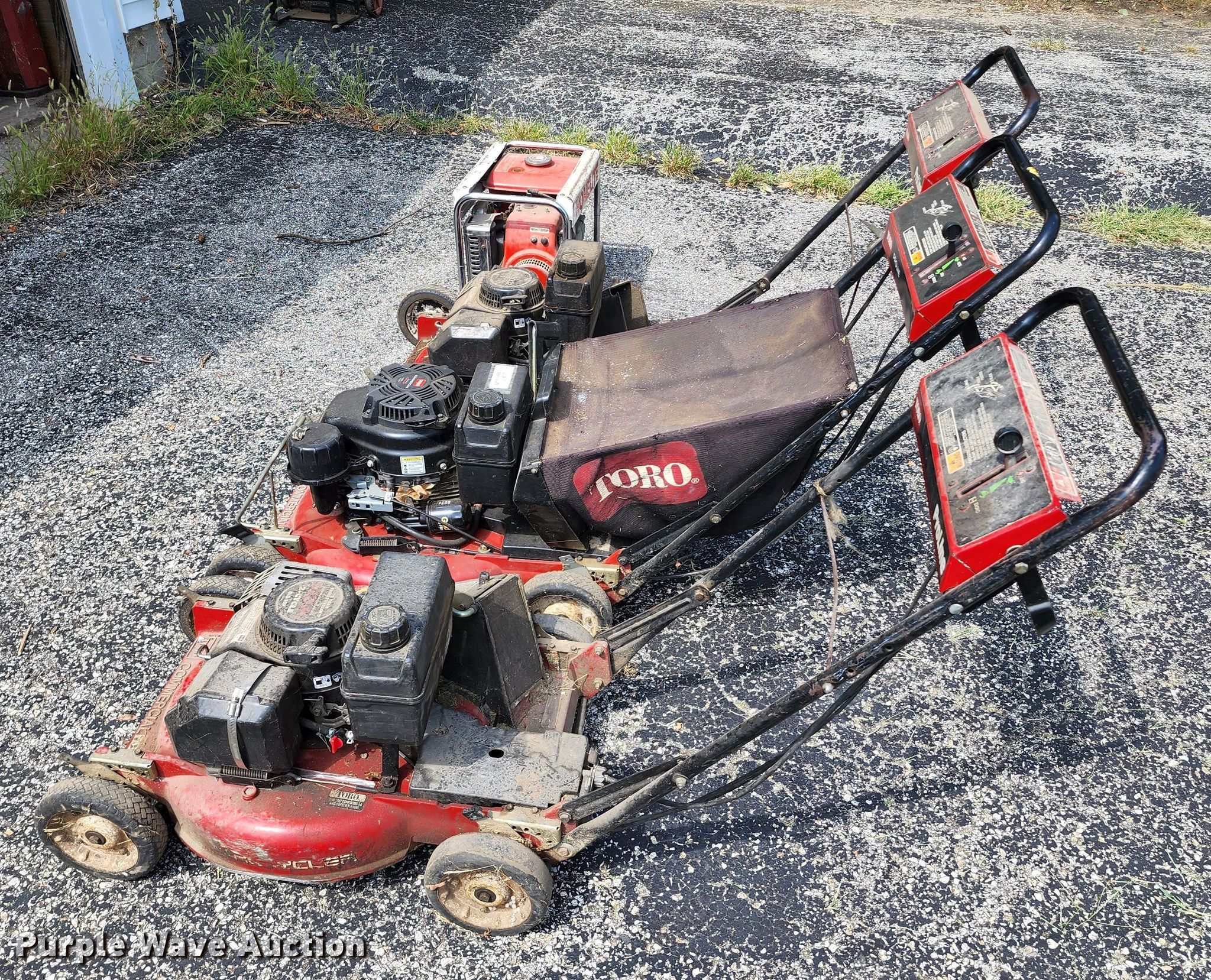 Purple Wave is selling a used Lawn and Garden in Missouri. This item is a Lawn and garden equipment with the following: (3) Toro push mowers, Gas engines, Homelite HG1400 generator, Gas engine, Dayton 3Z360G bandsaw, 115 V