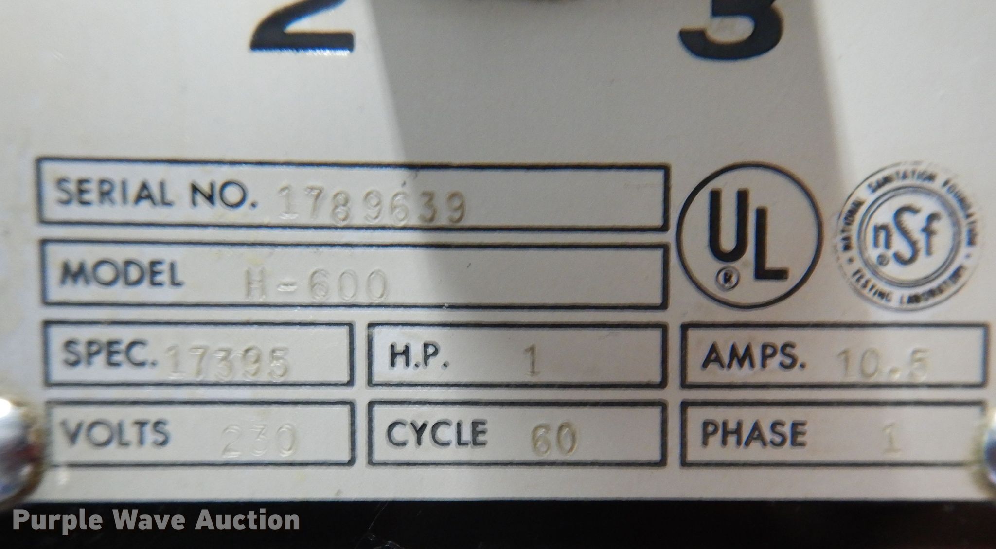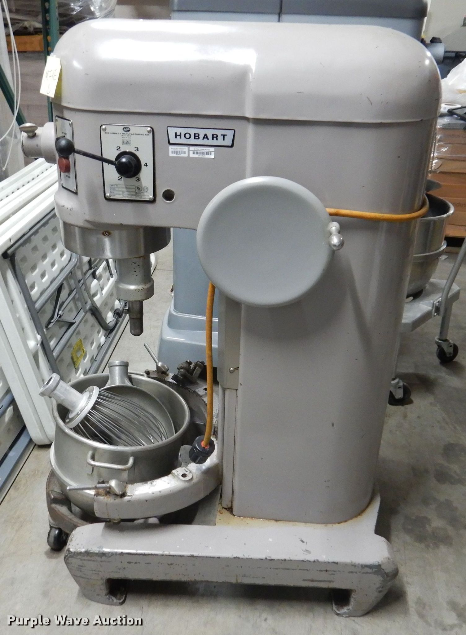 Purple Wave is selling a used Restaurant Equip. in Iowa. This item is a Hobart H-600 mixer with the following: 24" W x 56" H, Mixing bowl, Beater, Whisk, Phase: Singe, Volts: 230, Serial: 1789639