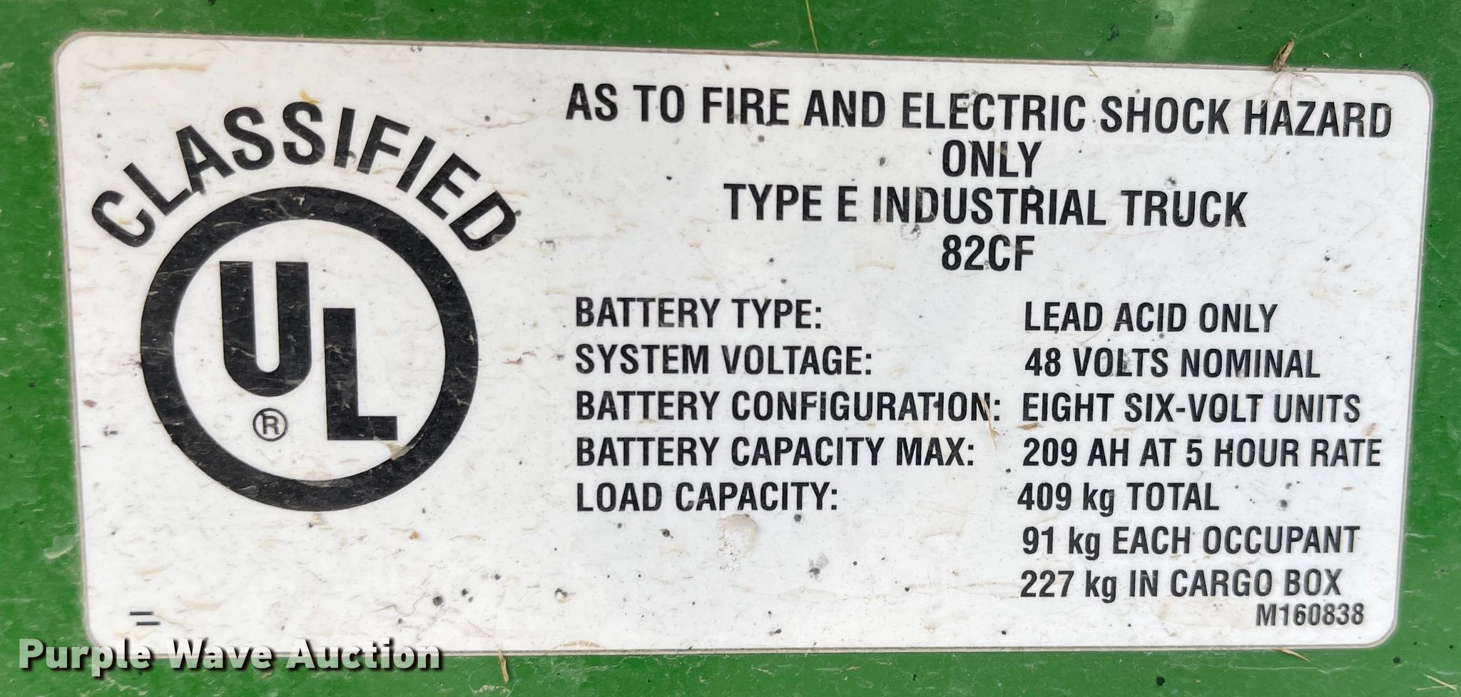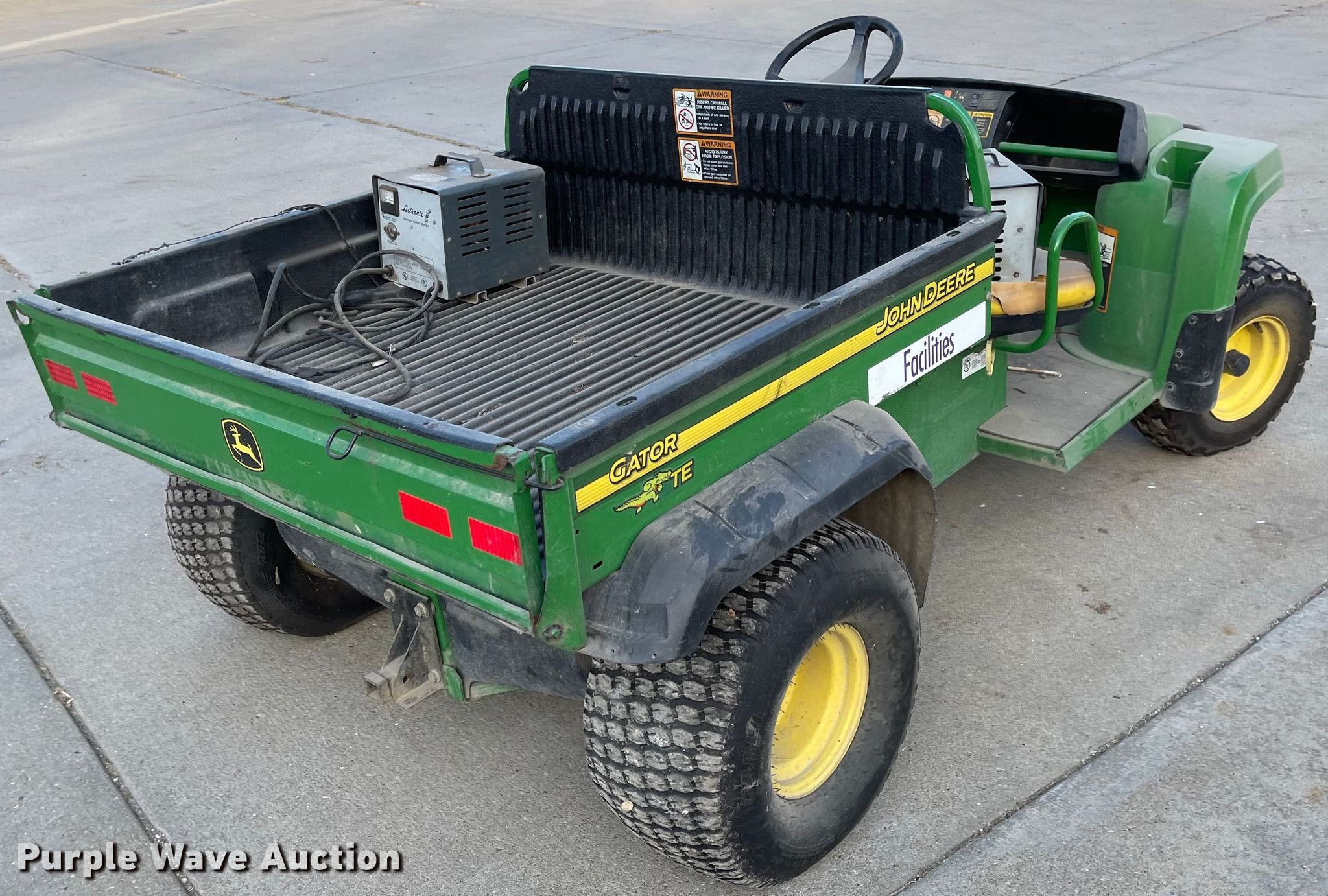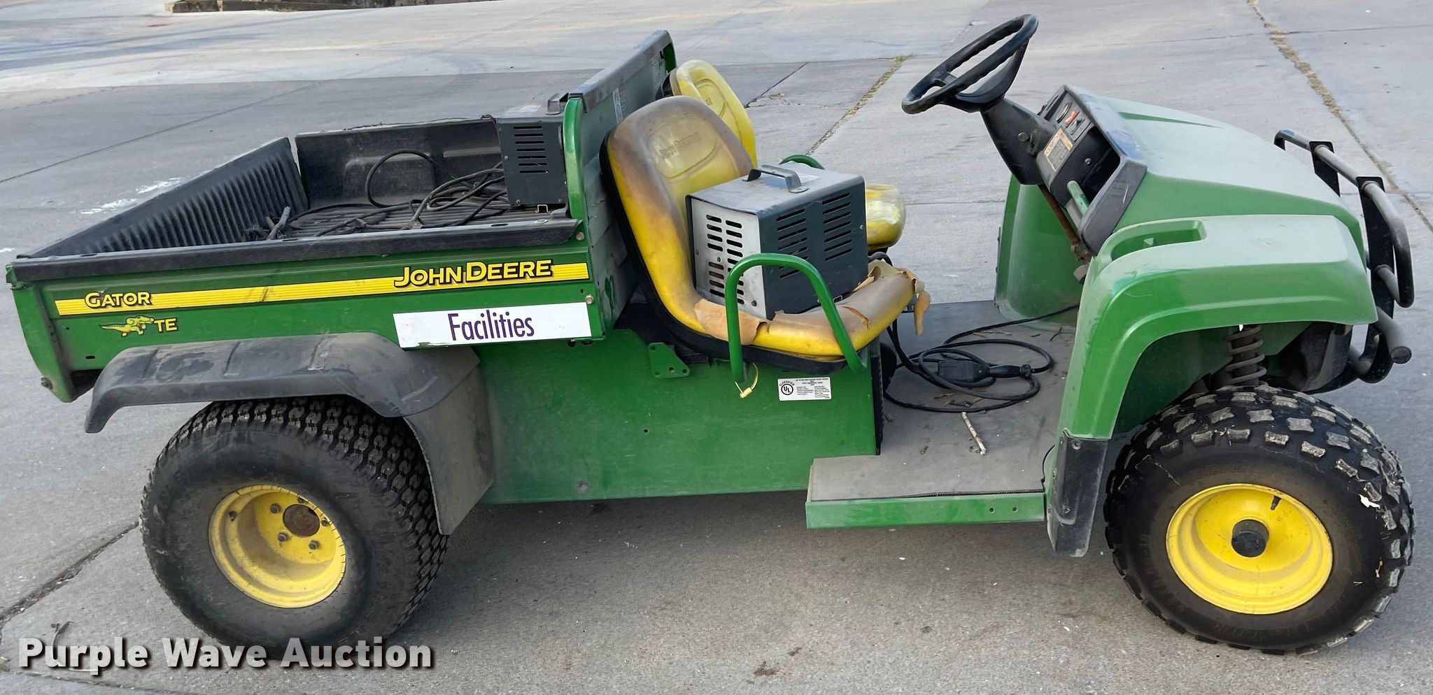 2009 John Deere TE Gator utility vehicle. Hours: Unknown, Serial: M0T145E040025. Electric Motor Volts: 48, Charger: Single phase. Features 42" L x 48" W, Dump bed type: Electric/ Hydraulic. Tires Front: 22x8.00-10, Rear: 24x12.00-10. Notes Non-operational unit. Transfer of ownership documentation will be a bill of sale. KSU Division of Facilities. 226 Dykstra Hall. Manhattan, KS 66506