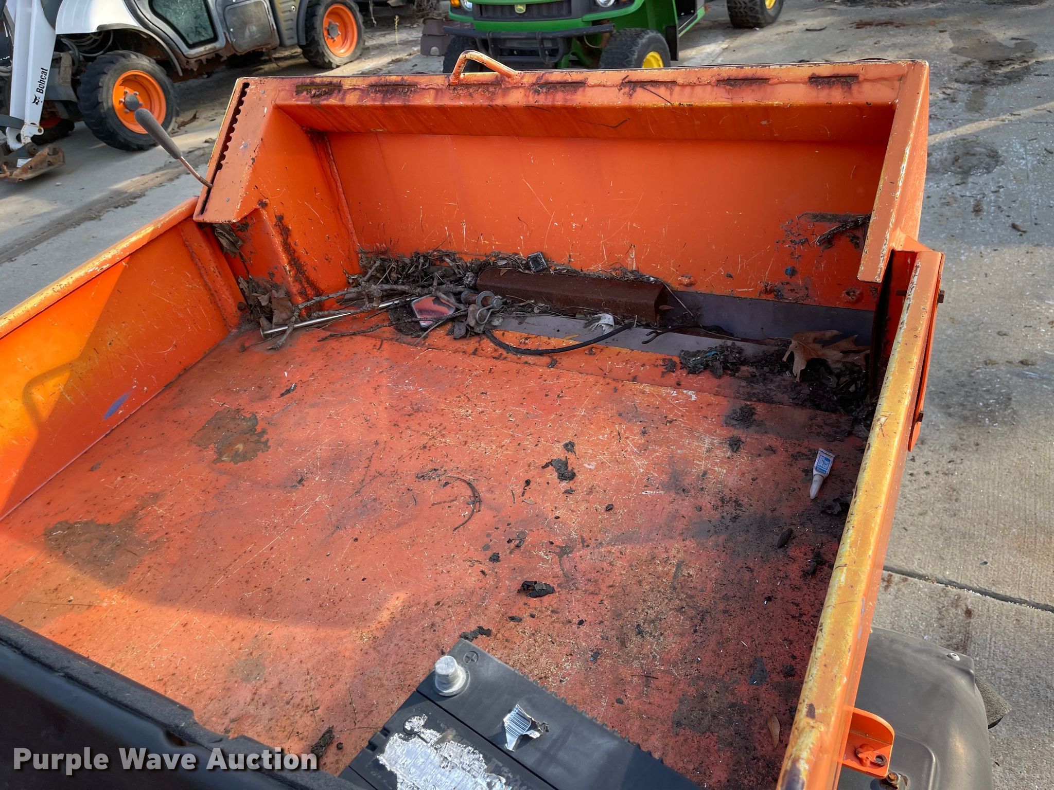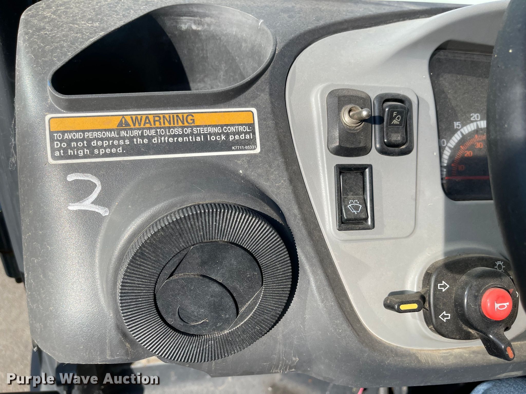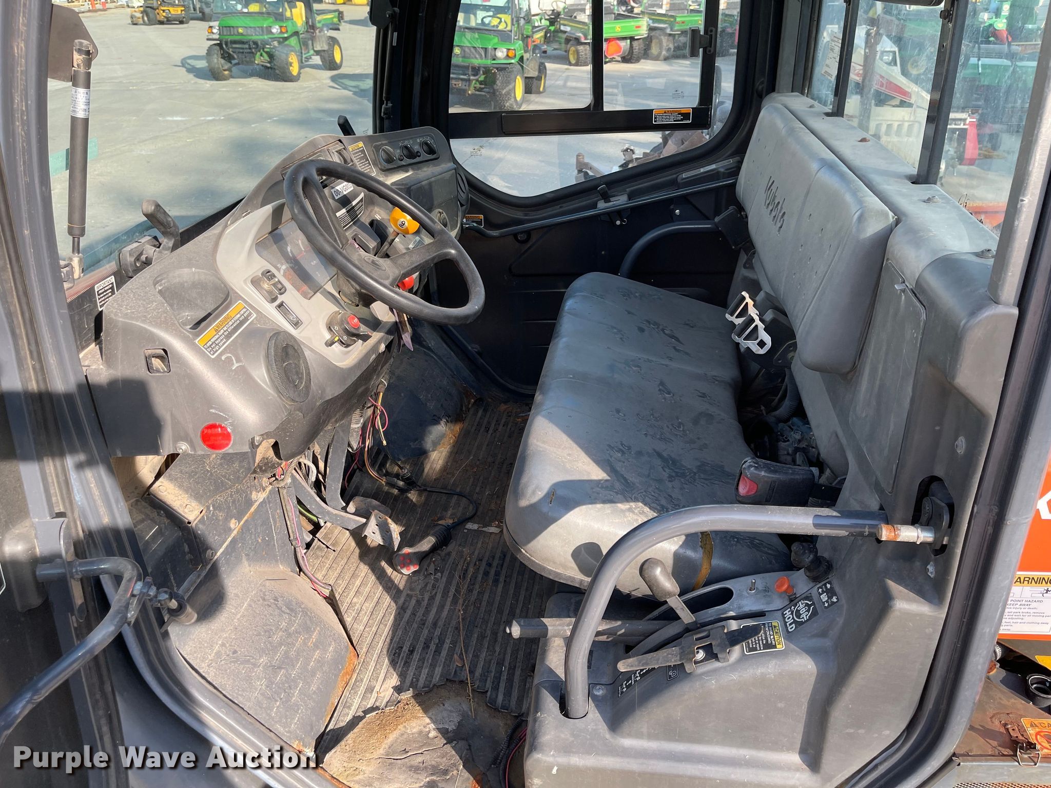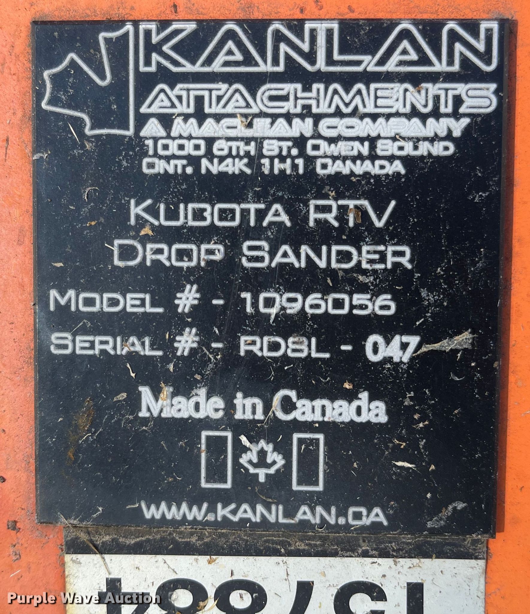 2011 Kubota RTV1100 utility vehicle. Hours: Unknown, Serial: 29339. Engine Kubota, Cylinders: 3, Fuel type: Diesel, Electric start. Transmission CVT. Chassis Four wheel drive. Operators station Enclosed cab, AC, Heat, Passengers: 2. Features Grill guard, Attachment Kanlan 1096056, Drop sander, Width: 40, Serial: RDSL-047. Tires Size: 25x10-12. Notes Dead battery, Non-operational unit. Transfer of ownership documentation will be a bill of sale. KSU Division of Facilities. 226 Dykstra Hall. Manhattan, KS 66506